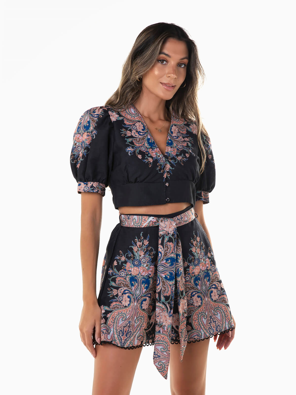 Conjunto boho de algodão com aparência linho. Blusa cropped de manga curta abalonada com decote em V e aperto de botões forrados. Calção bermuda de cintura alta elástica com cinto removível para laço. 2 bolsos.