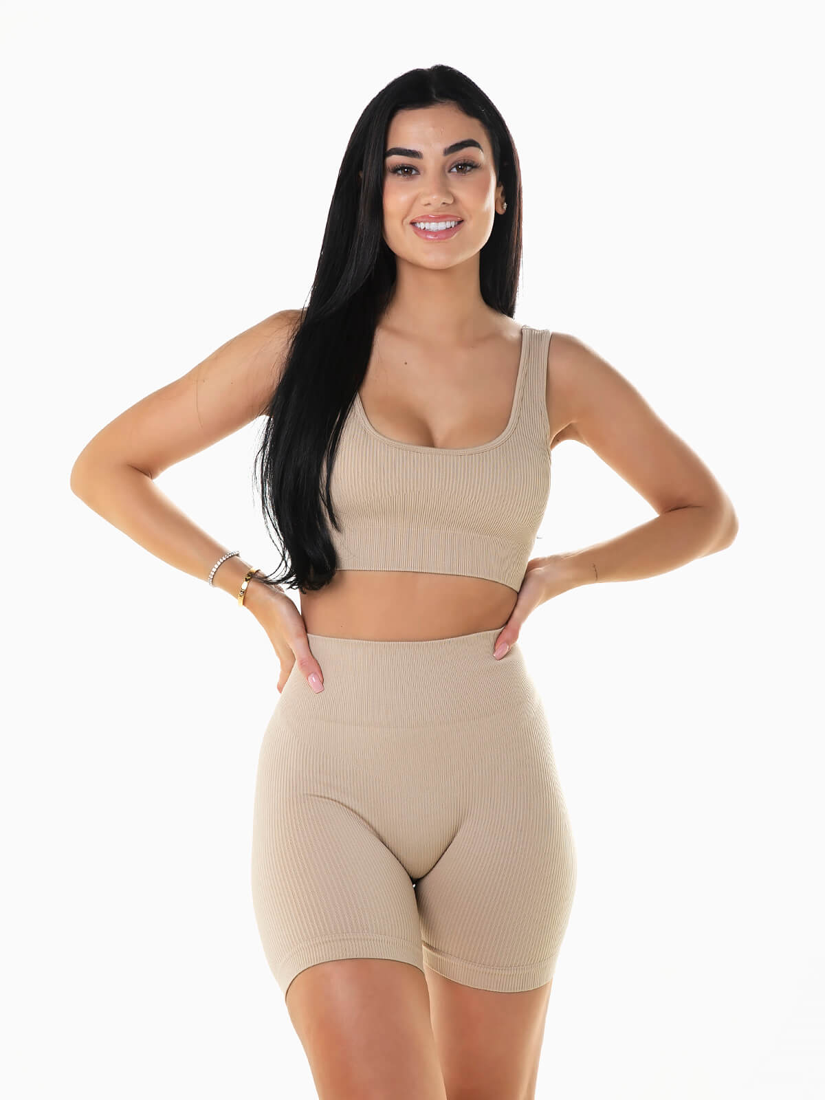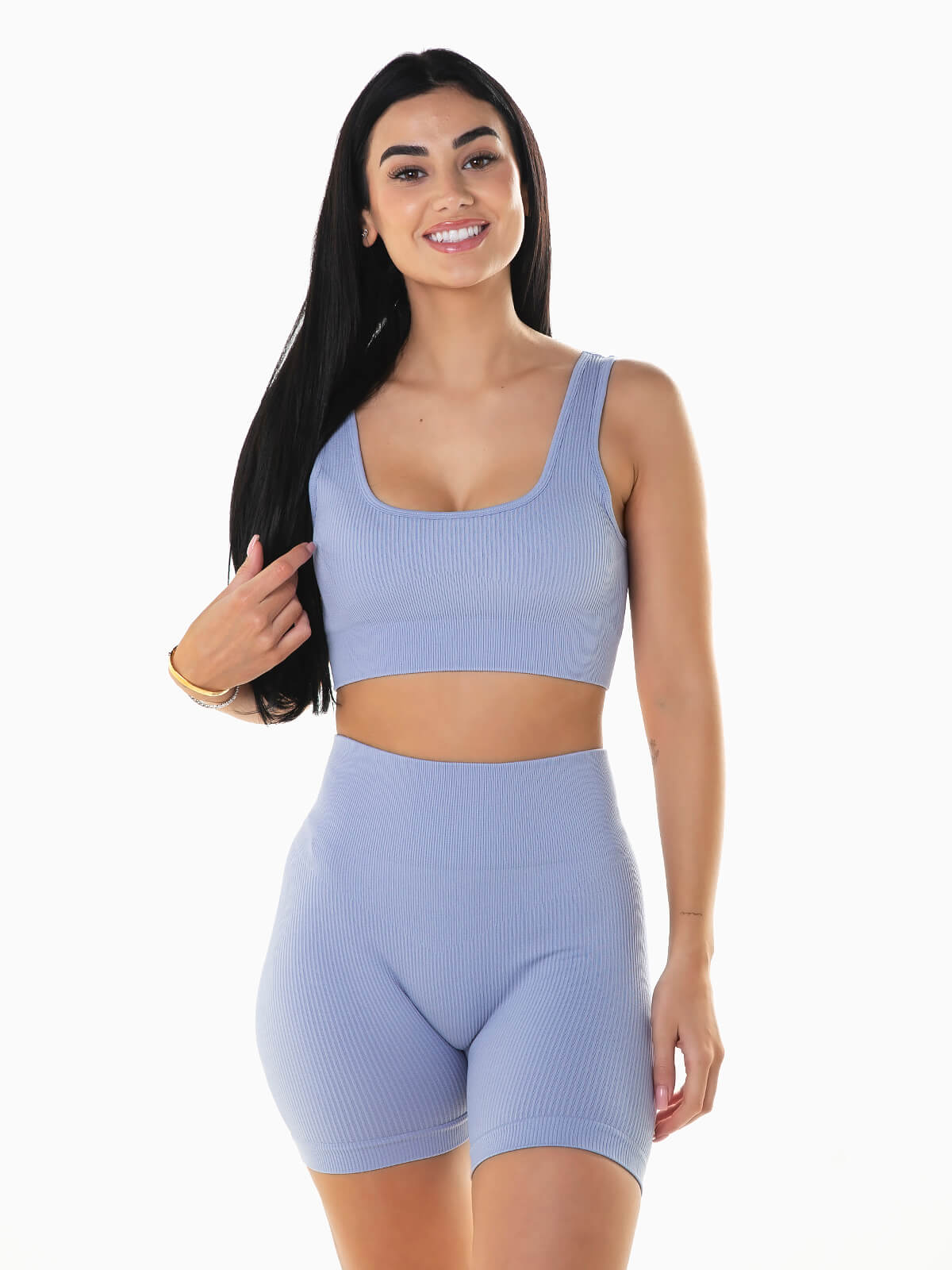 Conjunto elástico canelado. Top de alças almofadado com decote quadrado. Calções estilo ciclista de cintura alta.
