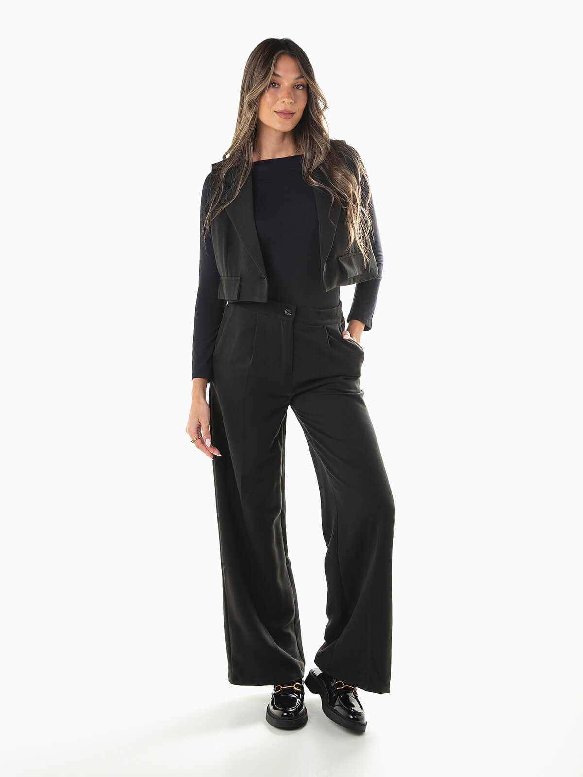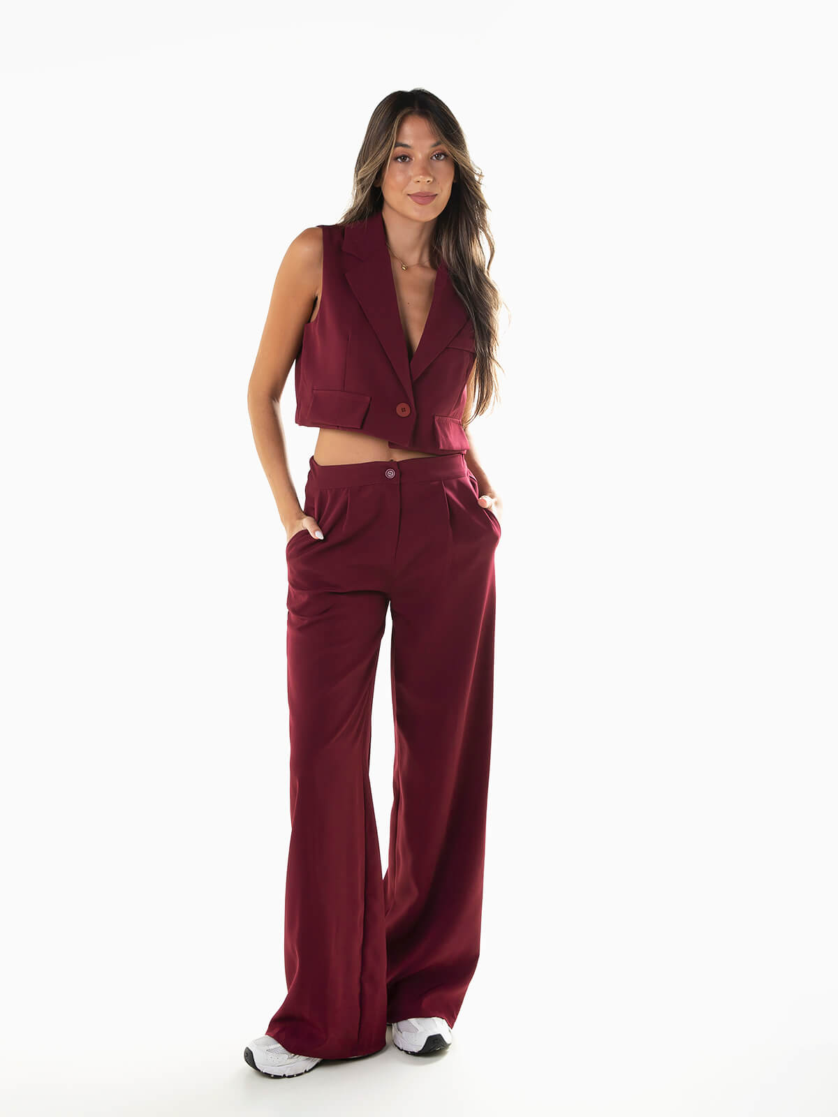 Conjunto de fato para senhora. Colete curto com interior forrado e palas decorativas. Gola de abas e aperto cruzado de botão. Calças largas de cintura média alta com pregas à frente. 2 bolsos. Aperto de fecho éclair e botão.