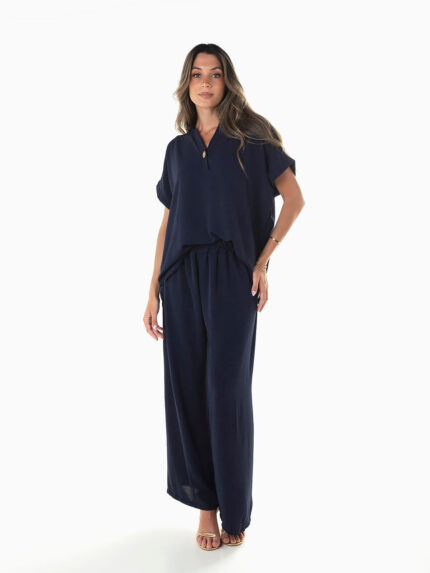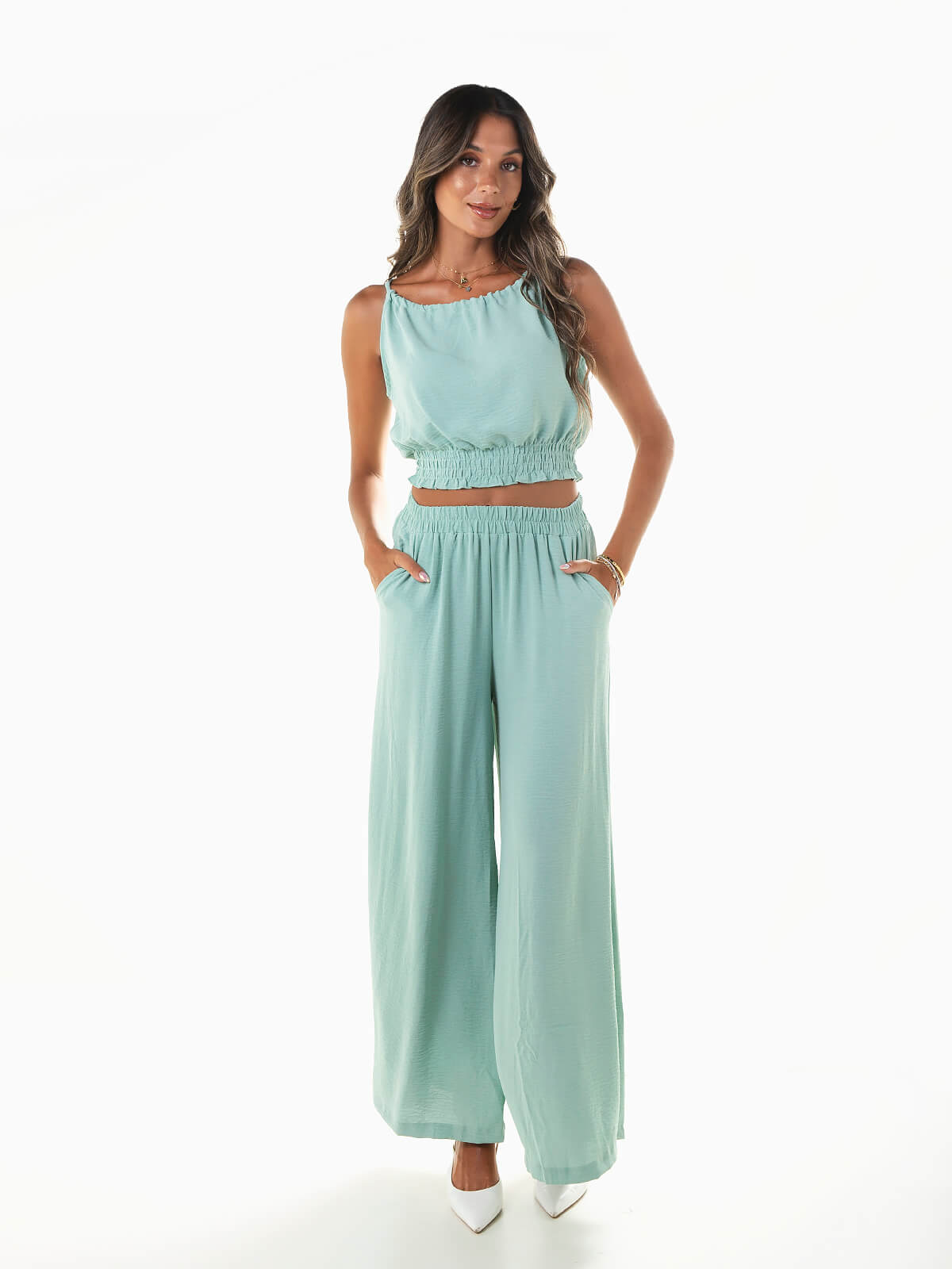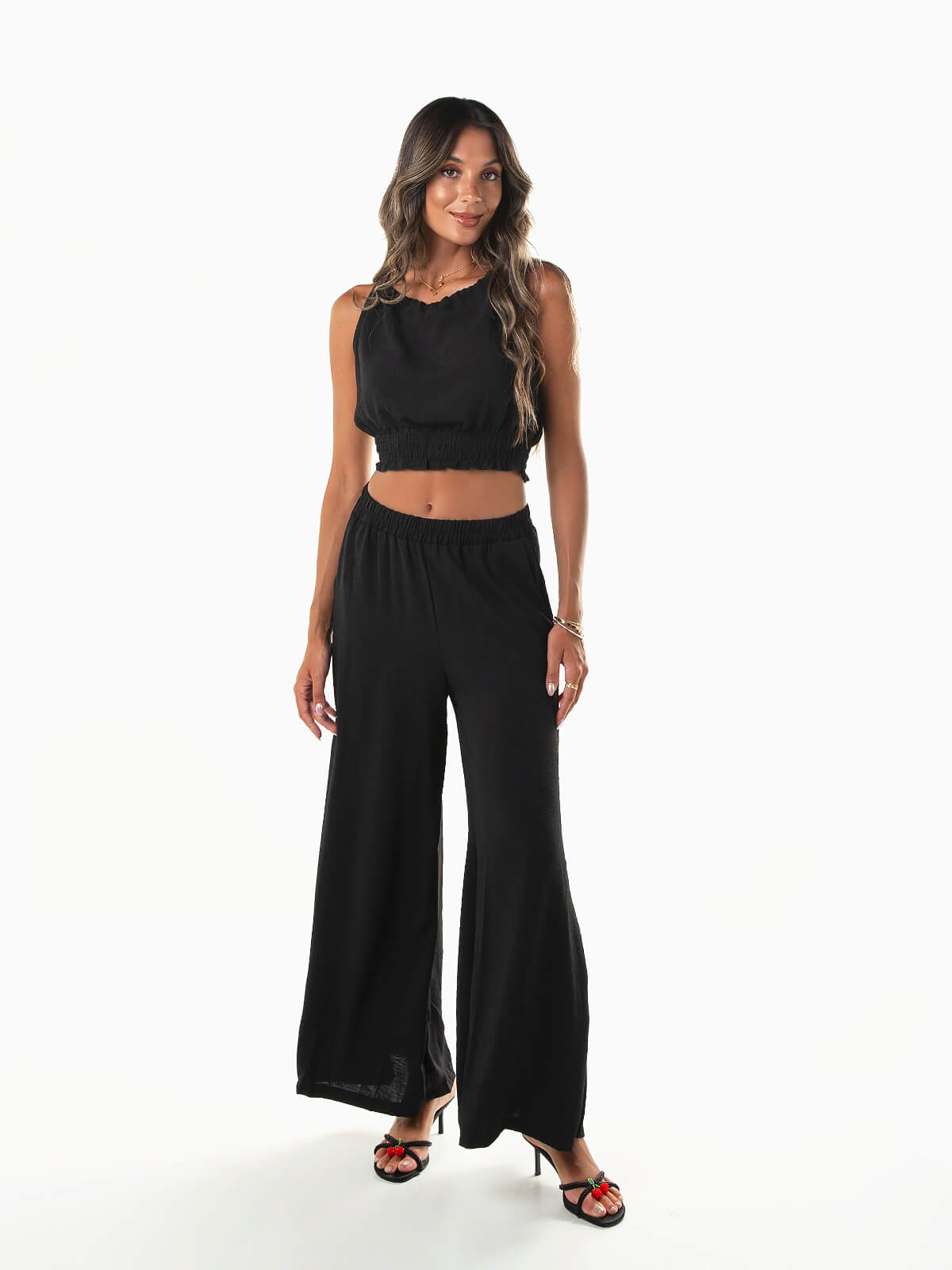 Conjunto fluído 2 peças. Crop top com franzido smock na base. Decote redondo ajustável na parte posterior com cordão. Calças largas com cintura alta elástica. 2 bolsos.