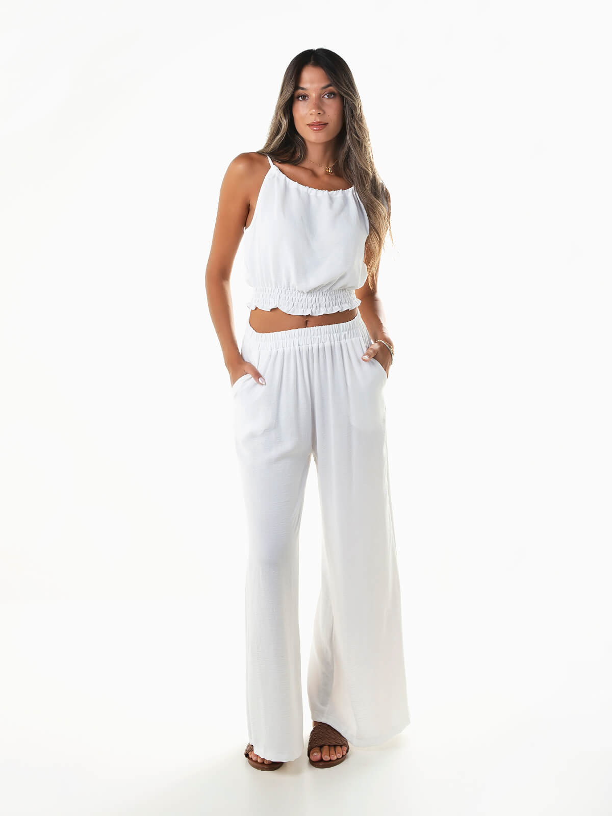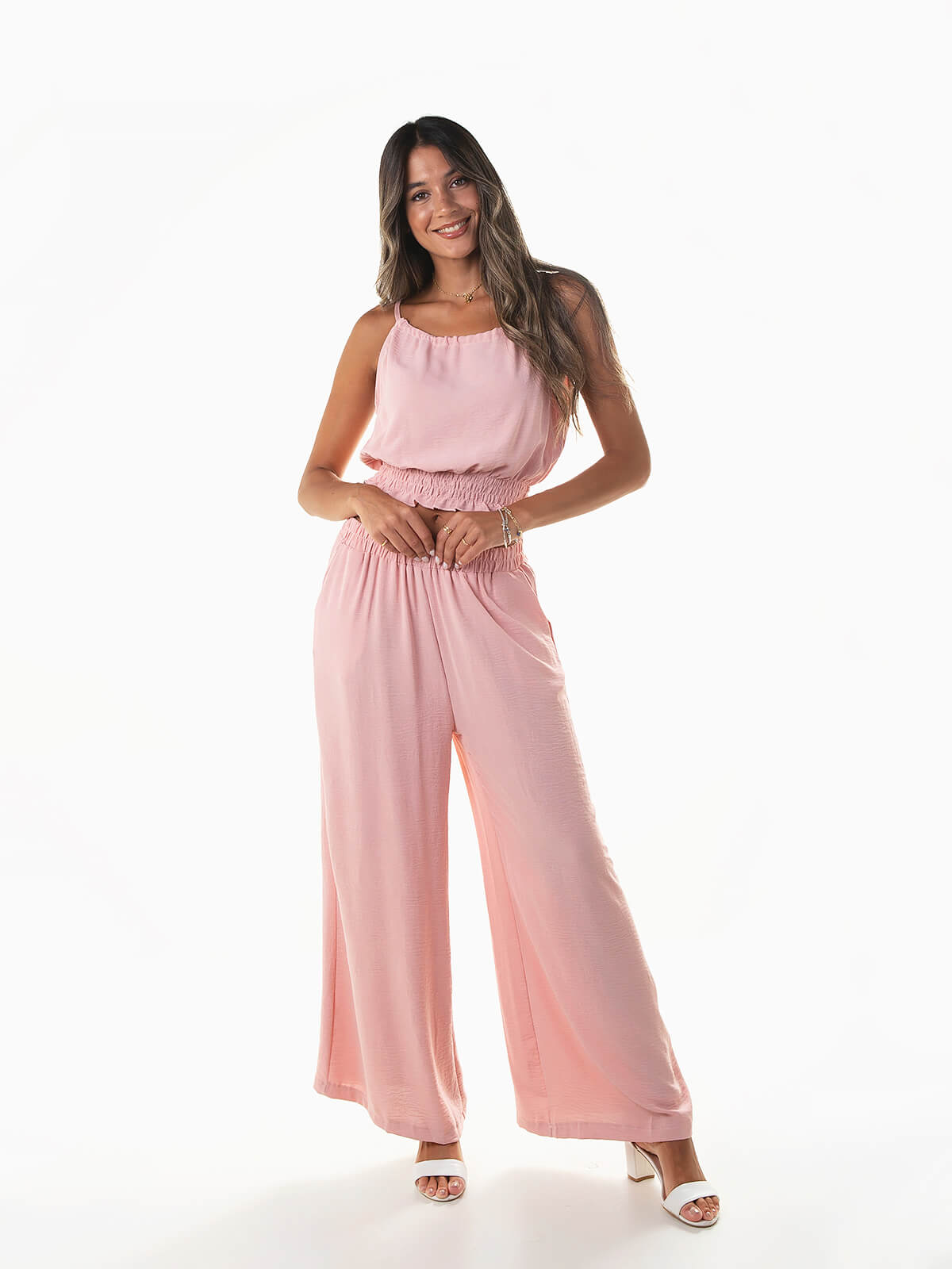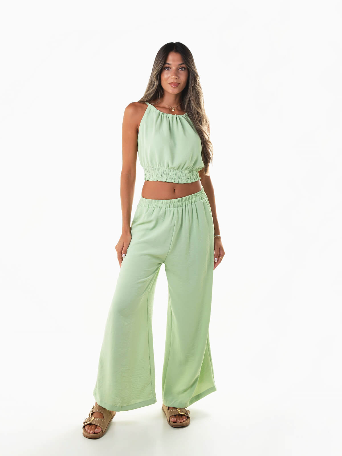 Conjunto fluído 2 peças. Crop top com franzido smock na base. Decote redondo ajustável na parte posterior com cordão. Calças pantalona com cintura alta elástica e 2 bolsos.