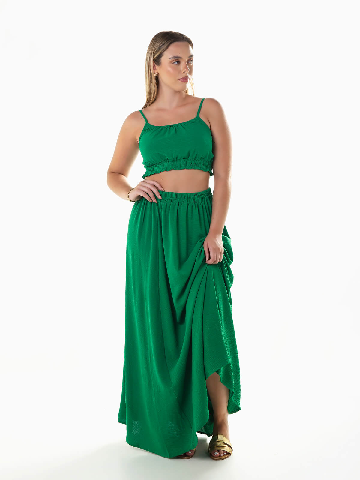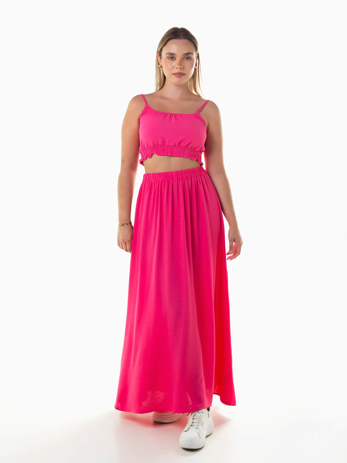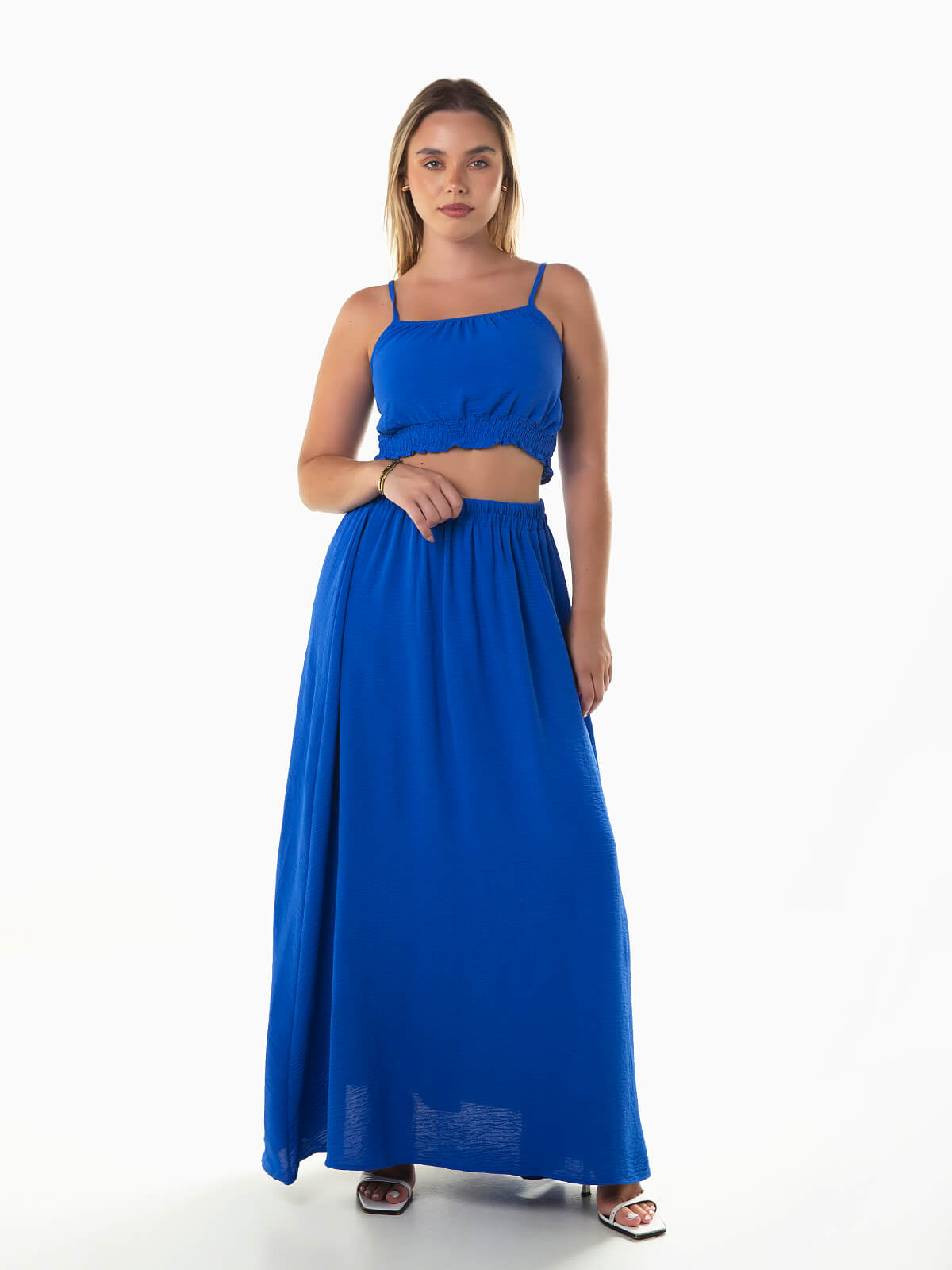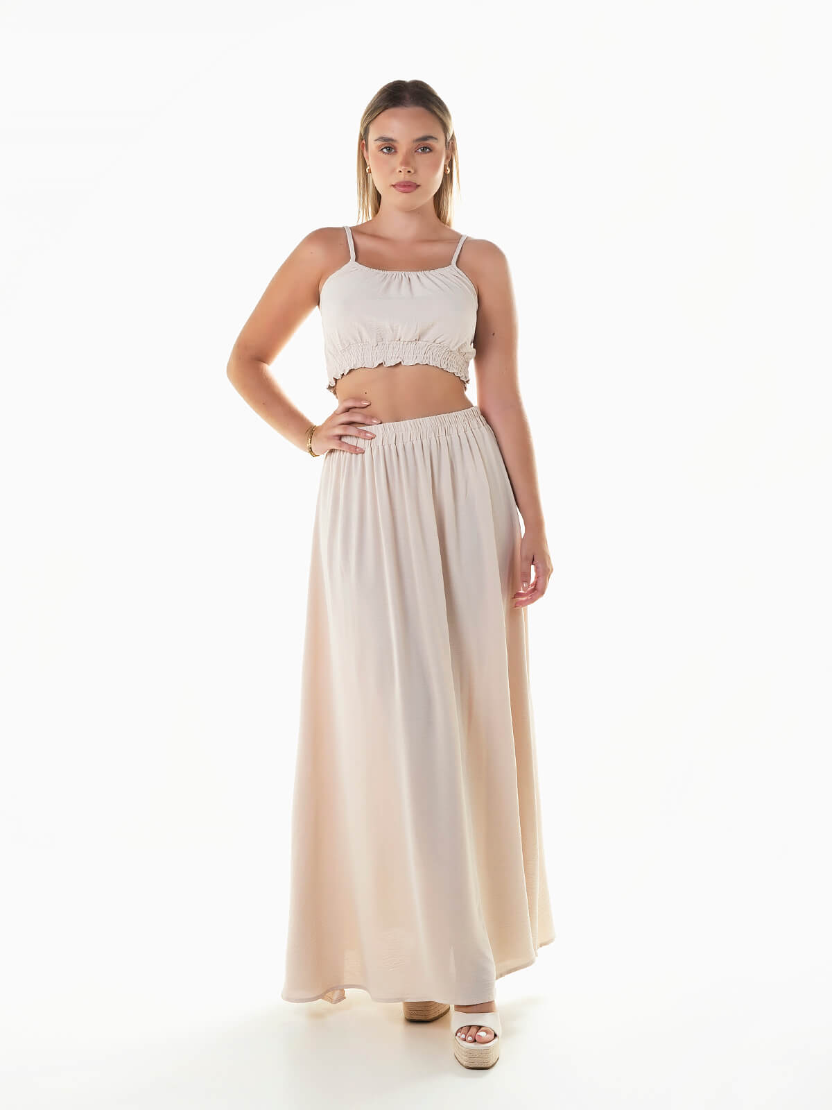 Conjunto fluído 2 peças. Crop top com alças reguláveis e pormenores franzidos smock. Decote quadrado. Saia comprida larga de corte evasé com cintura alta elástica.