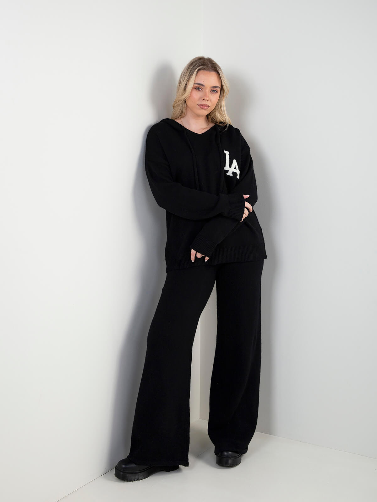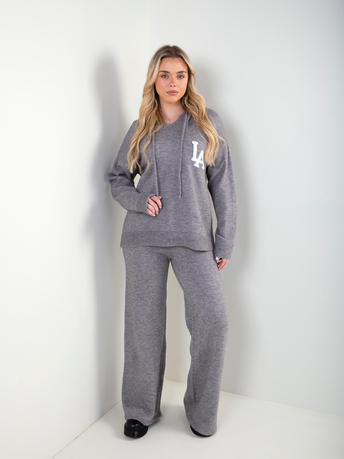 Conjunto de senhora em malha composto por sweatshirt com capuz e calças de corte fluido. Sweatshirt de manga comprida com acabamento canelado e detalhe frontal. Calças confortáveis, ideais para looks descontraídos e atuais, perfeitas para o dia a dia.