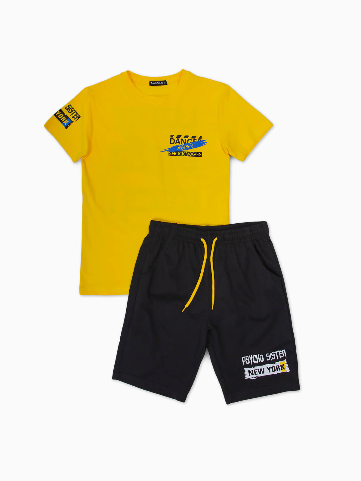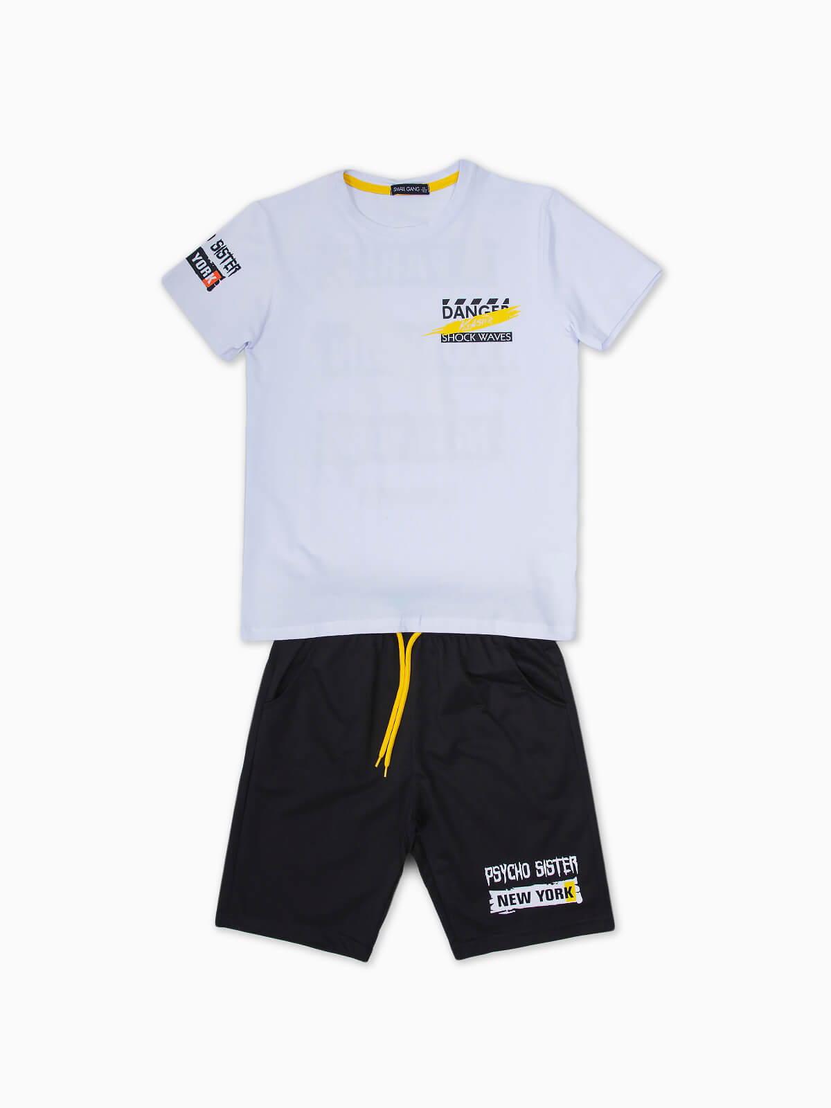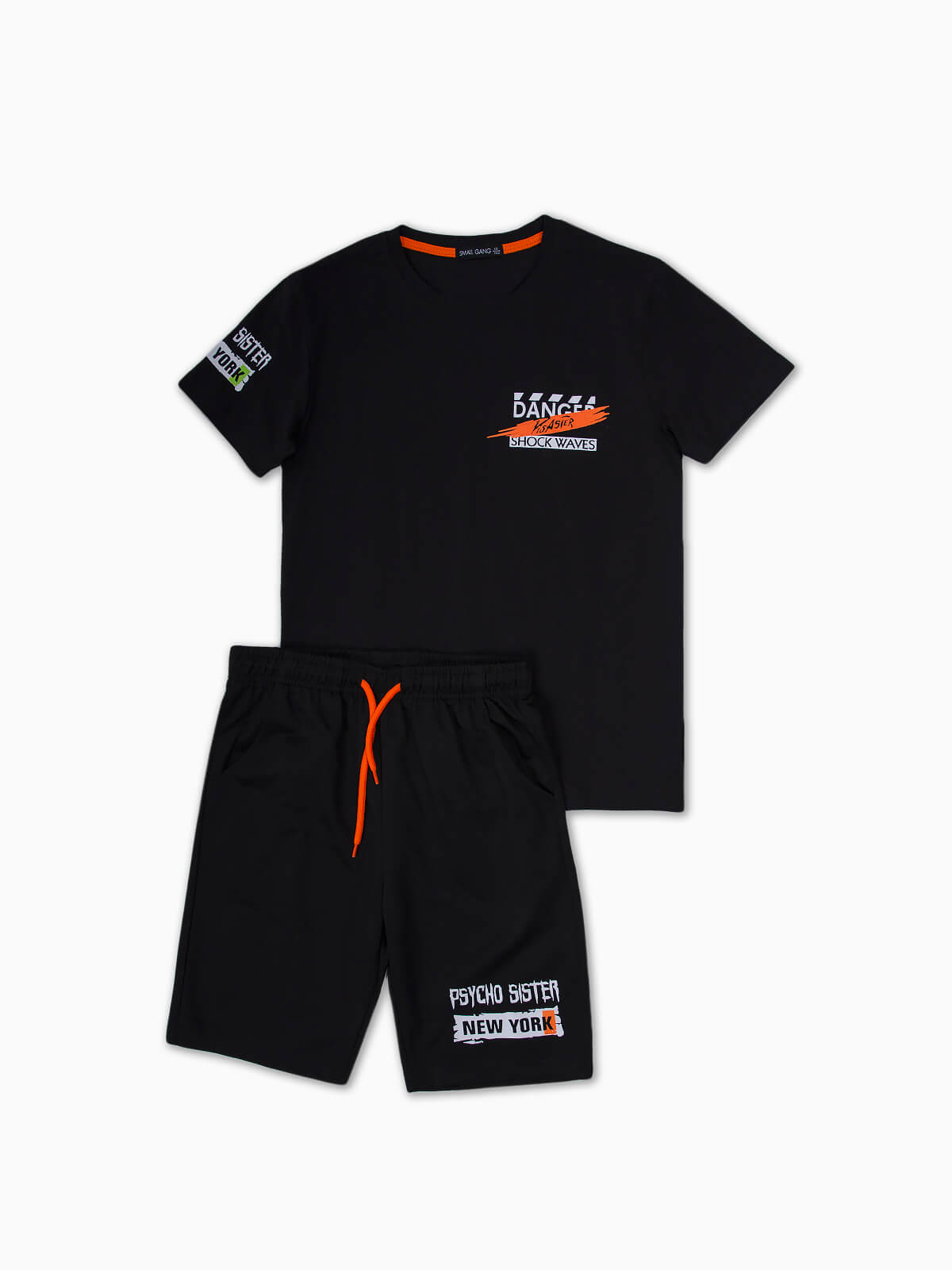 Conjunto desportivo composto por 2 peças para menino. T-shirt manga curta estampada com gola redonda. Calções de cintura elástica com cordão para ajustar. 2 bolsos.