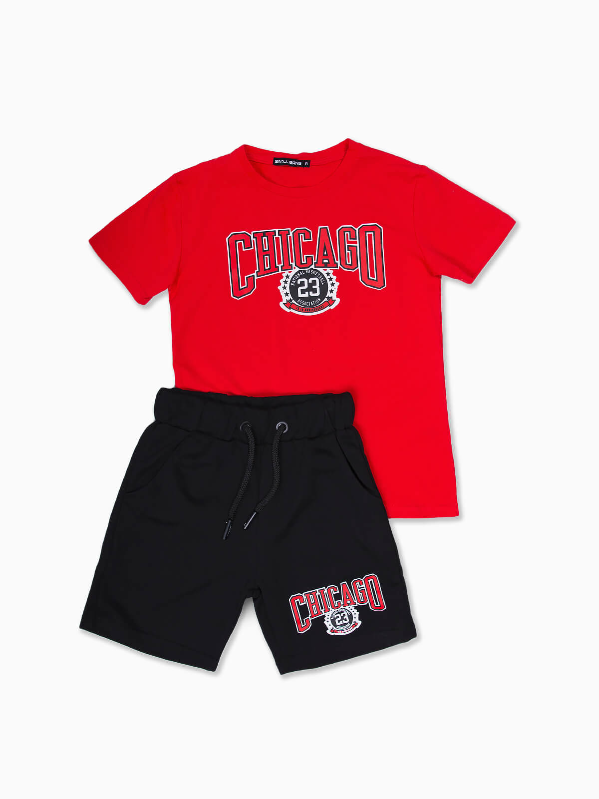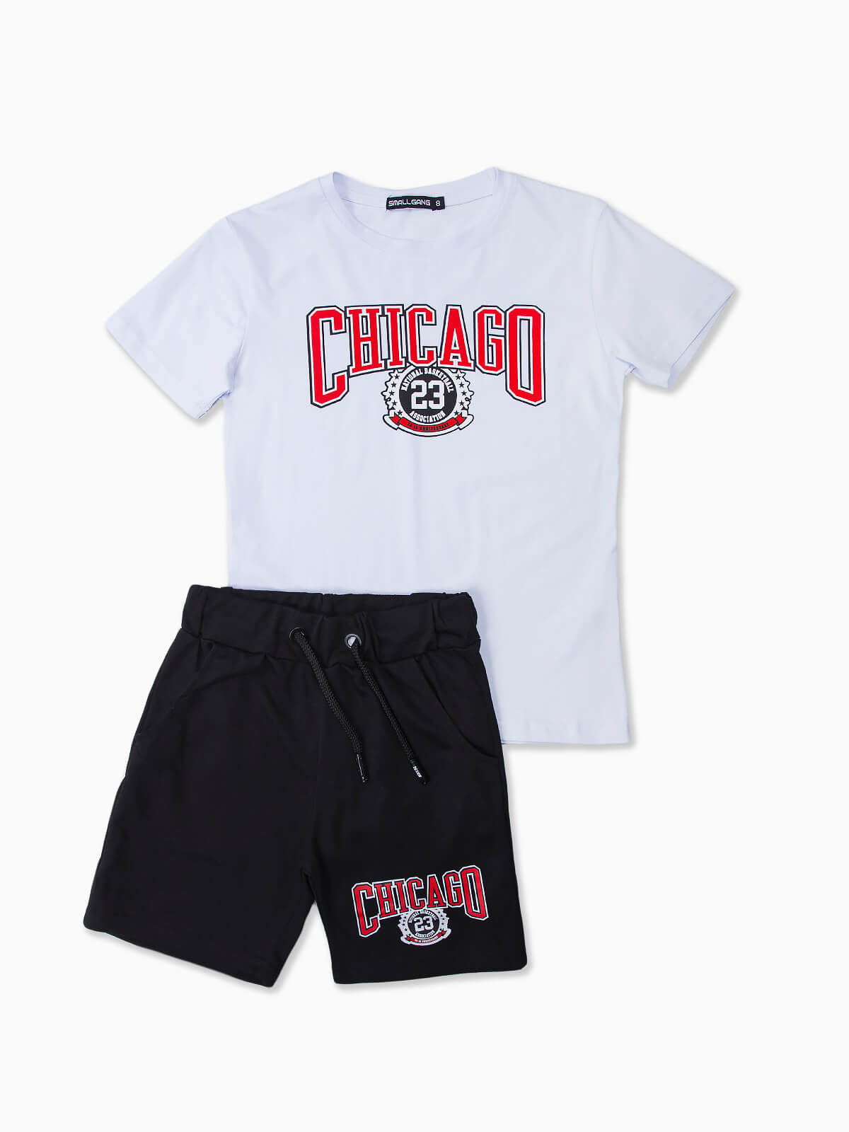 Conjunto desportivo composto por 2 peças para menino. T-shirt de manga curta com estampado de letras no peito. Gola redonda. Calções de cintura elástica com cordão para ajustar. 2 bolsos.