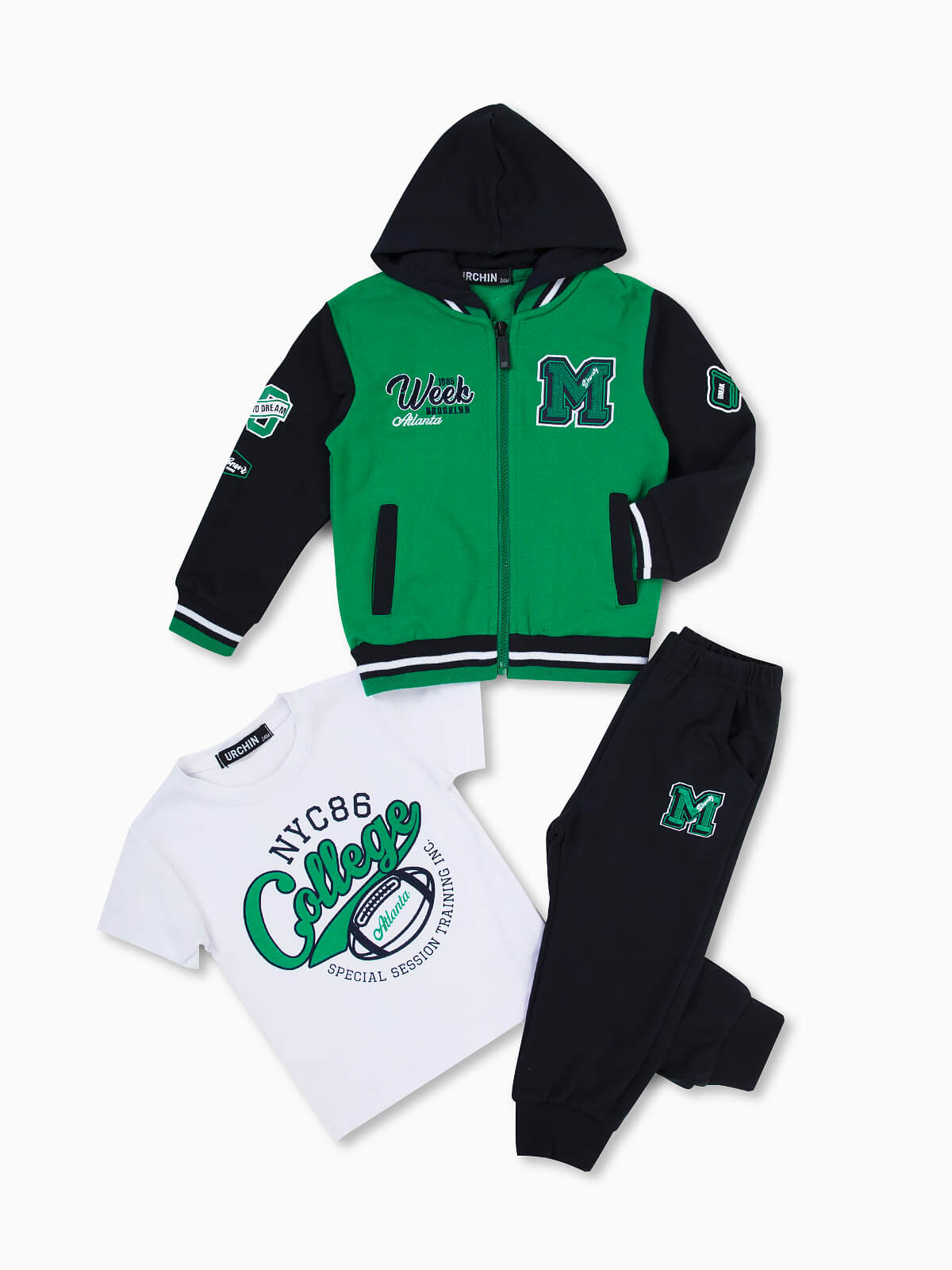 Conjunto fato treino para bebé menino. Casaco com capuz de manga comprida com extremidades elásticas. 2 bolsos. Aperto fecho zíper. T-shirt manga curta estampada com gola redonda. Calças jogger com 2 bolsos.