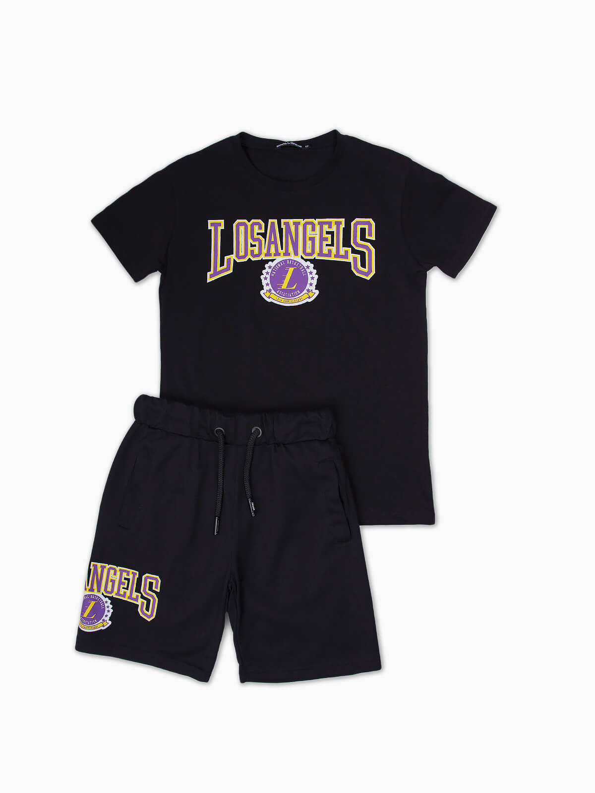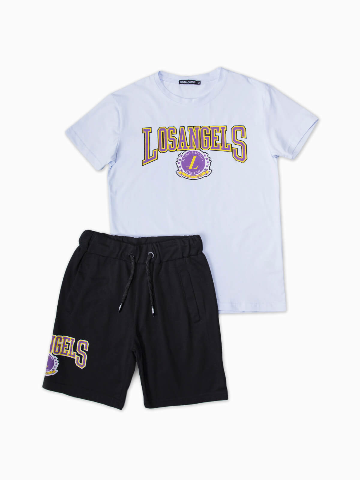 Conjunto desportivo composto por 2 peças para menino. T-shirt de manga curta com estampado de gola redonda. Calções de cintura elástica com cordão para ajustar.