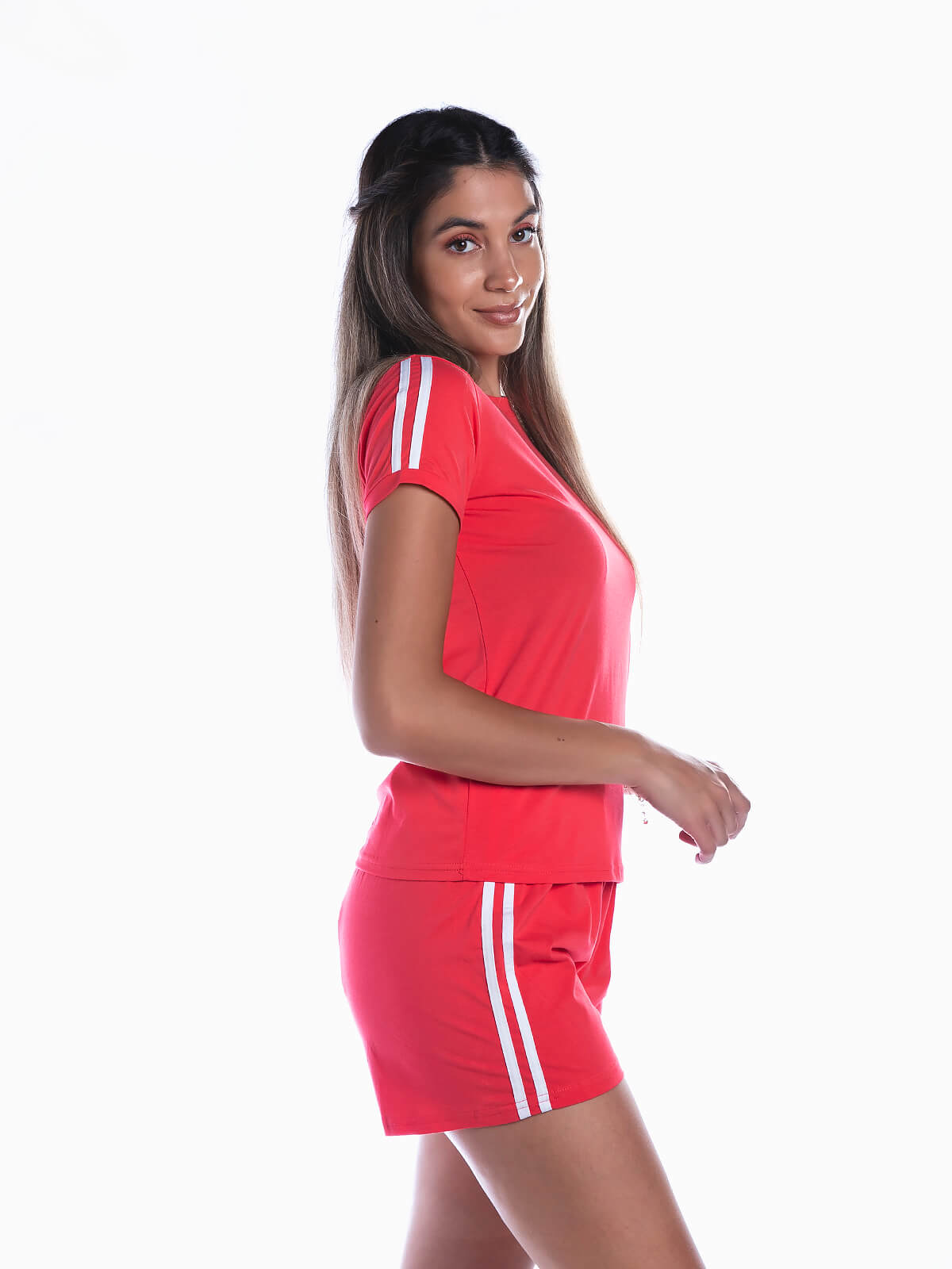 Conjunto desportivo composto por 2 peças. T-shirt de manga curta com gola redonda. Calções curtos de cintura alta elástica com riscas nas laterais.