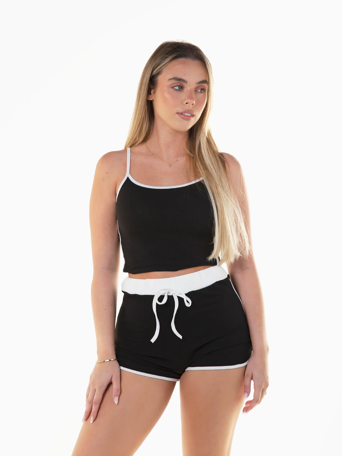 Conjunto de fitness canelado de 2 peças. Crop top de alças com decote redondo. Calções curtos de cintura alta com cordão para laço.