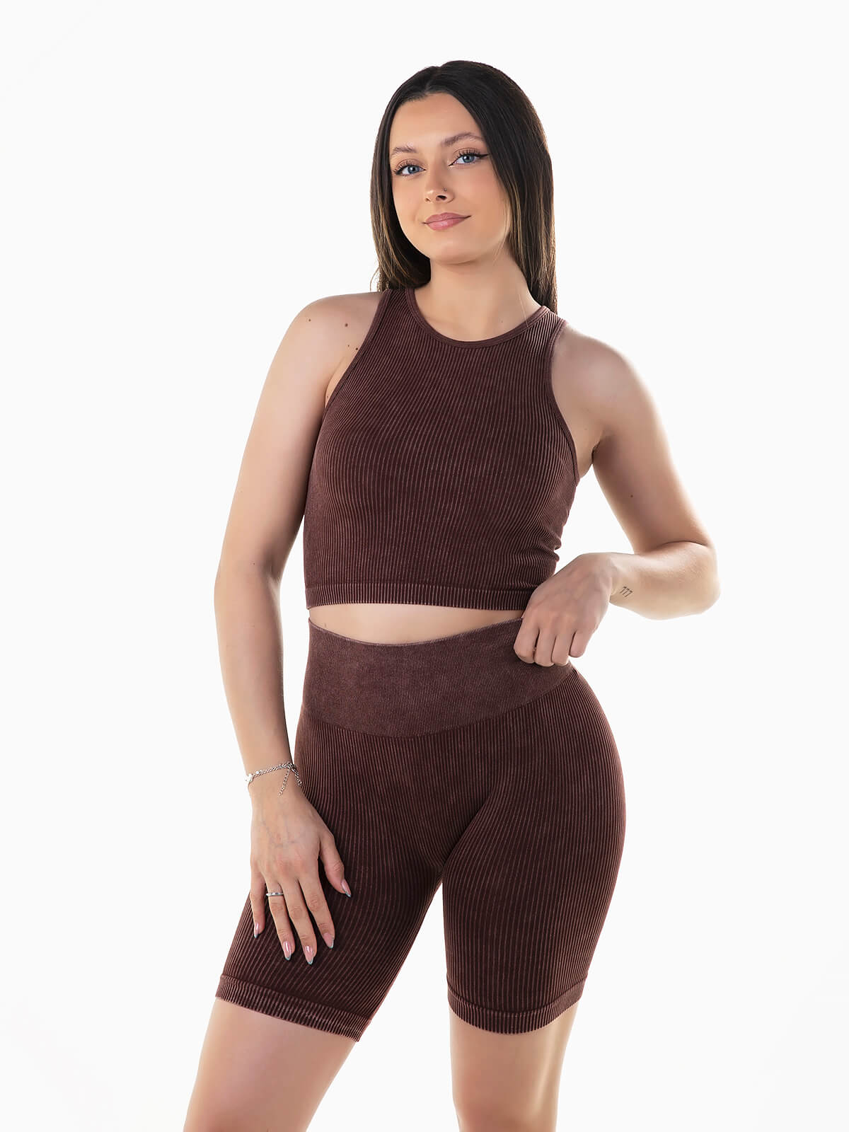 Conjunto em malha canelada elástico com efeito lavado. Tank top com decote redondo. Calções de cintura alta.