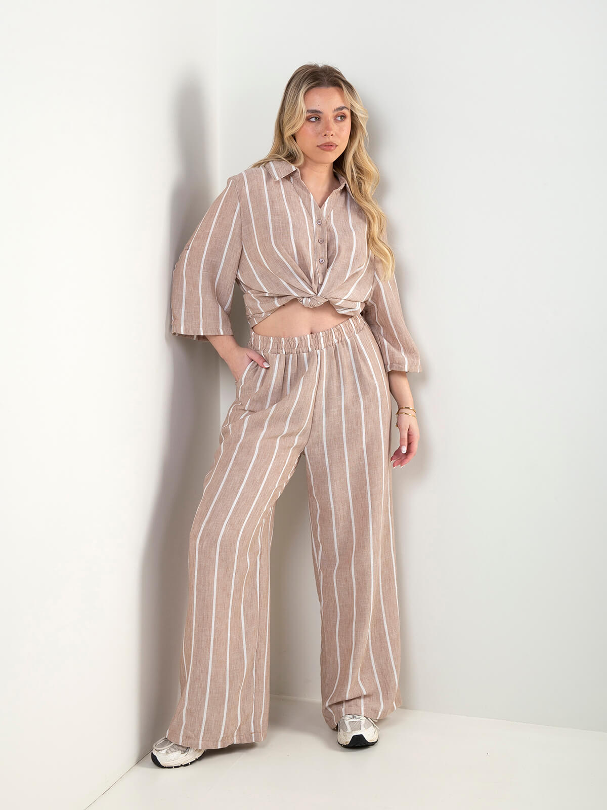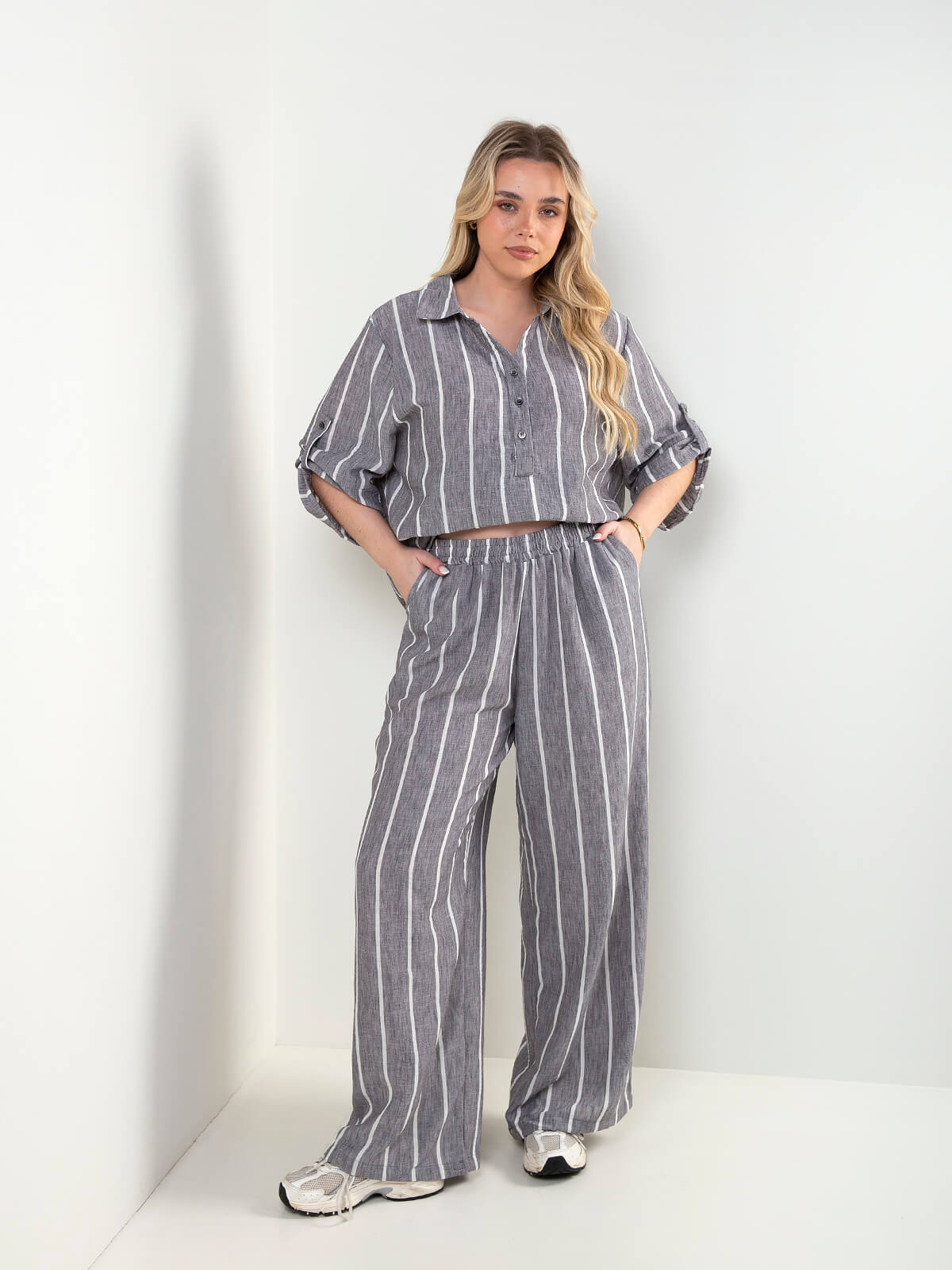 Conjunto efeito linho às riscas com blusa de manga 3/4 e calças fluídas com cintura elástica. Leve e versátil para looks elegantes e descontraídos.