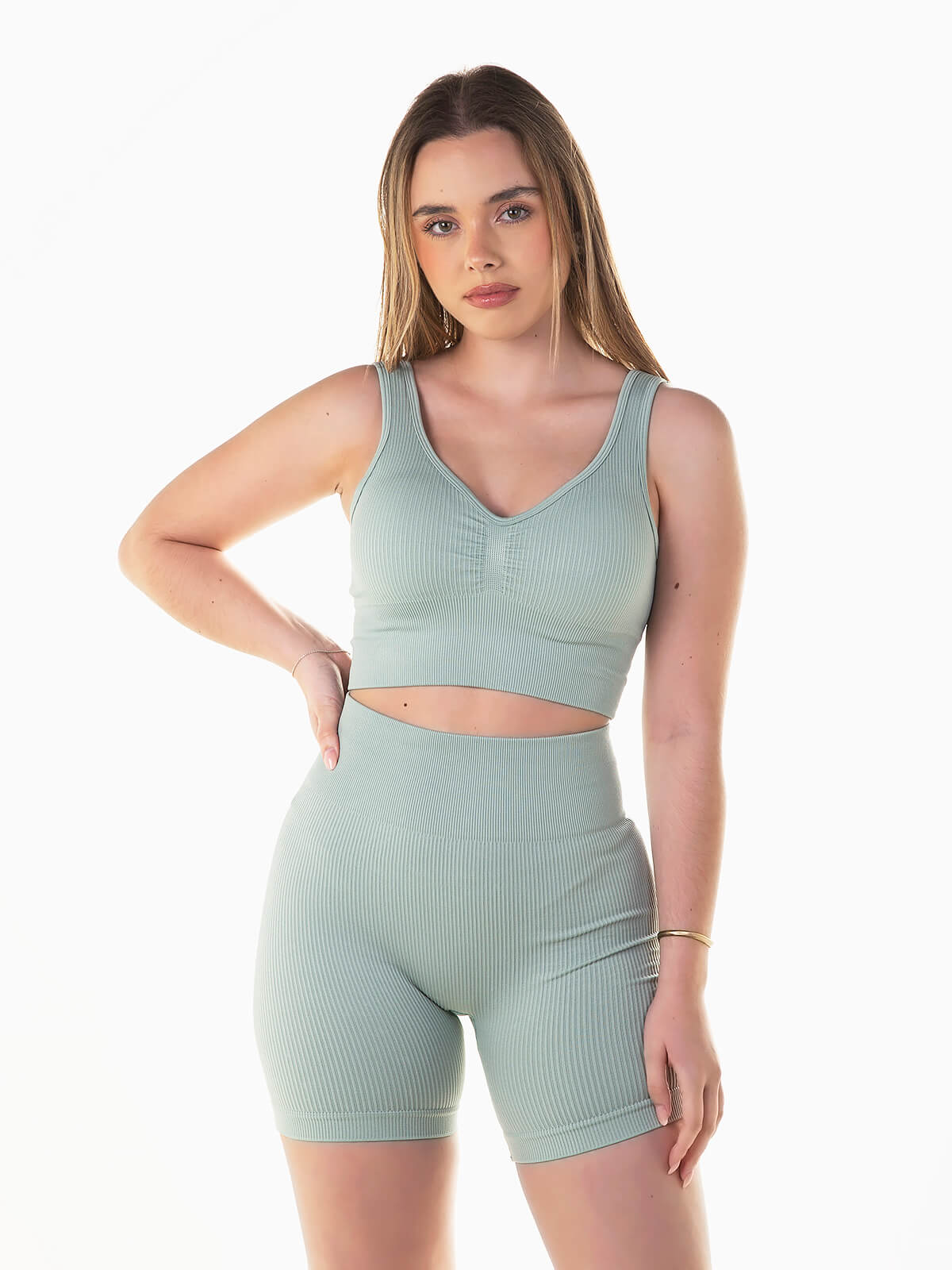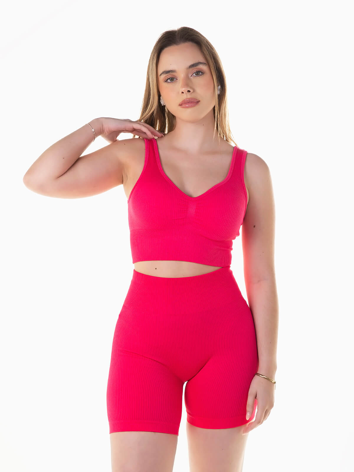 Top alças com peito almofadado removível e decote em V. Calções curtos ‘peach perfect’ com cintura alta elástica.