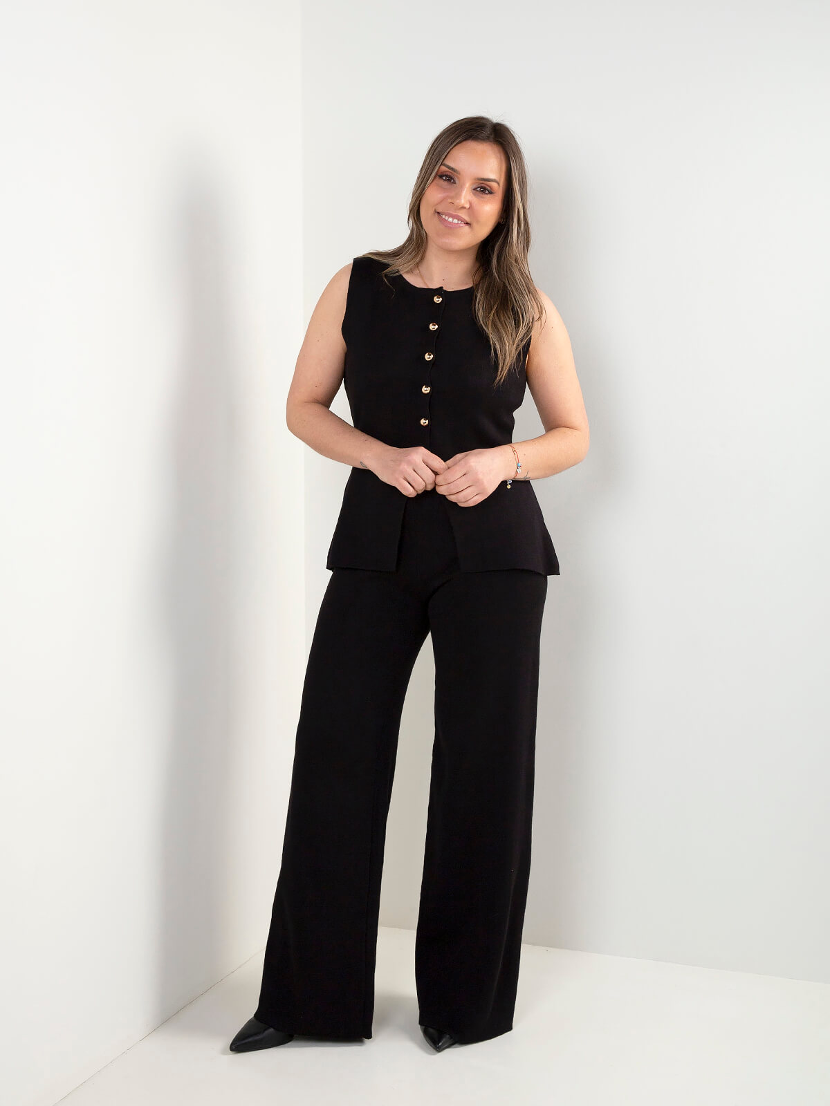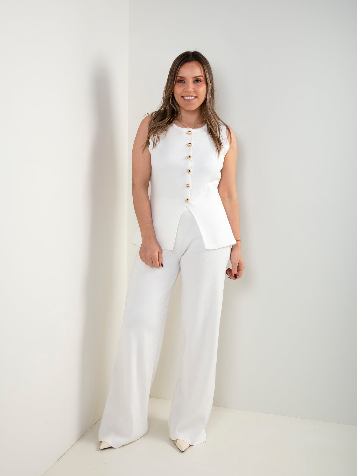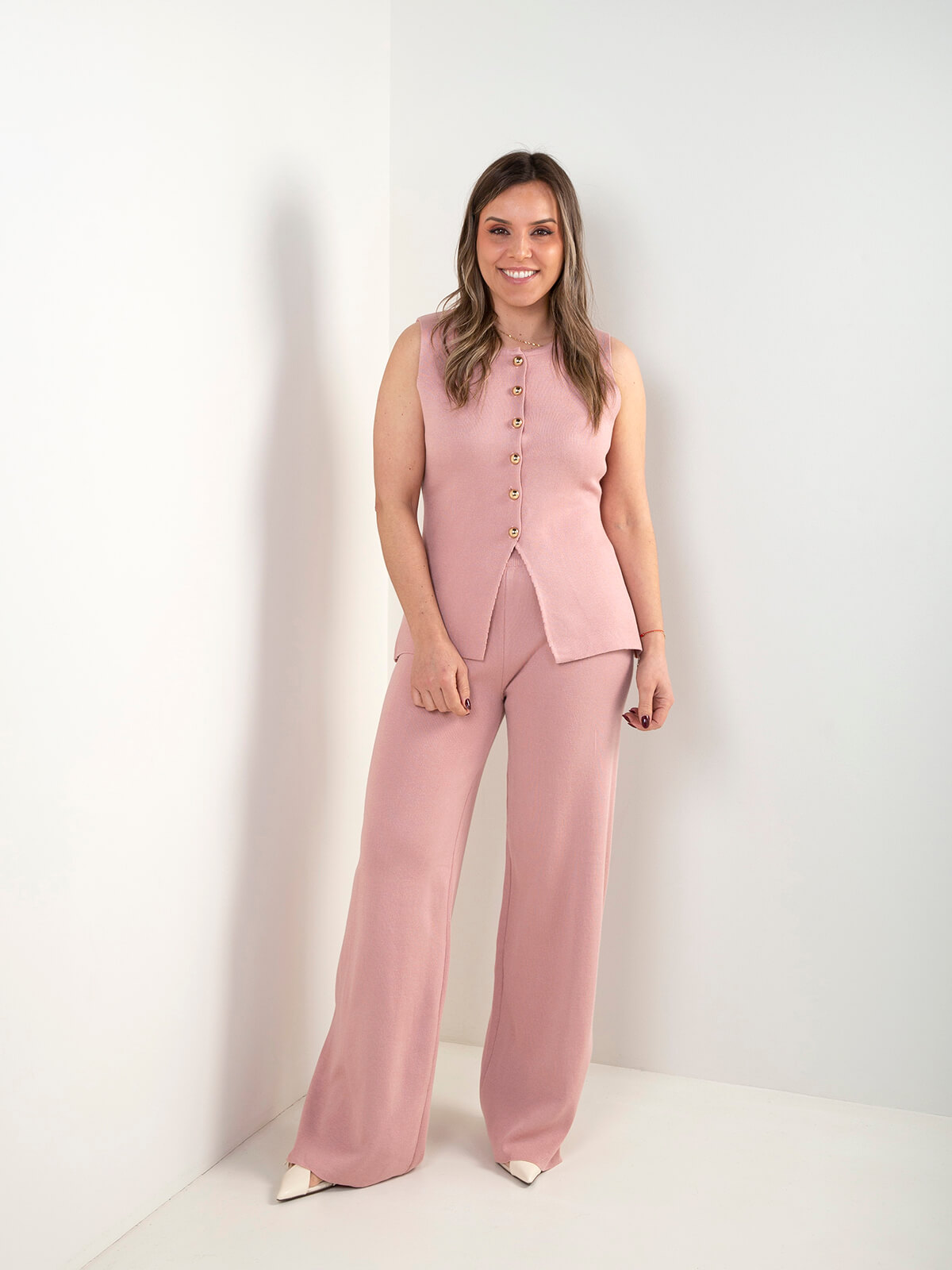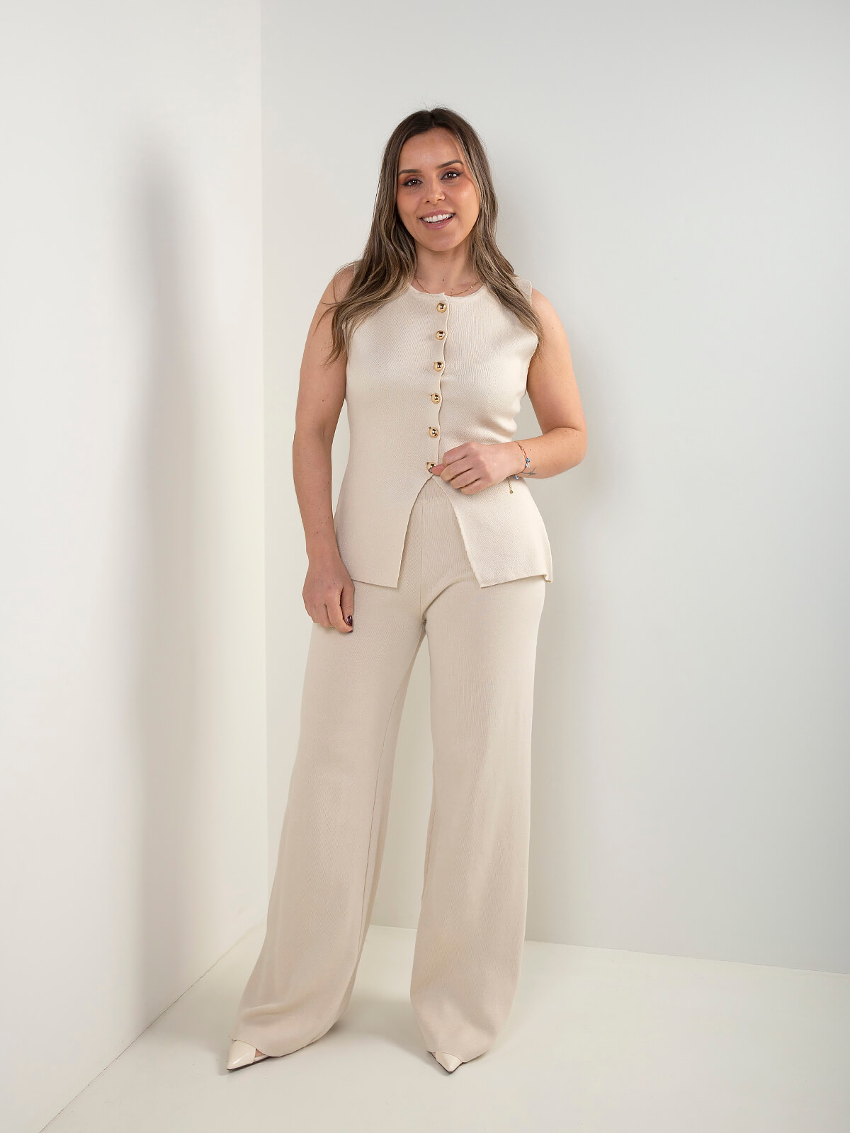 Conjunto de senhora em malha composto por colete sem mangas e calças de perna larga. Design confortável e versátil, ideal para usar em conjunto ou separado. Uma opção prática para looks atuais e elegantes.