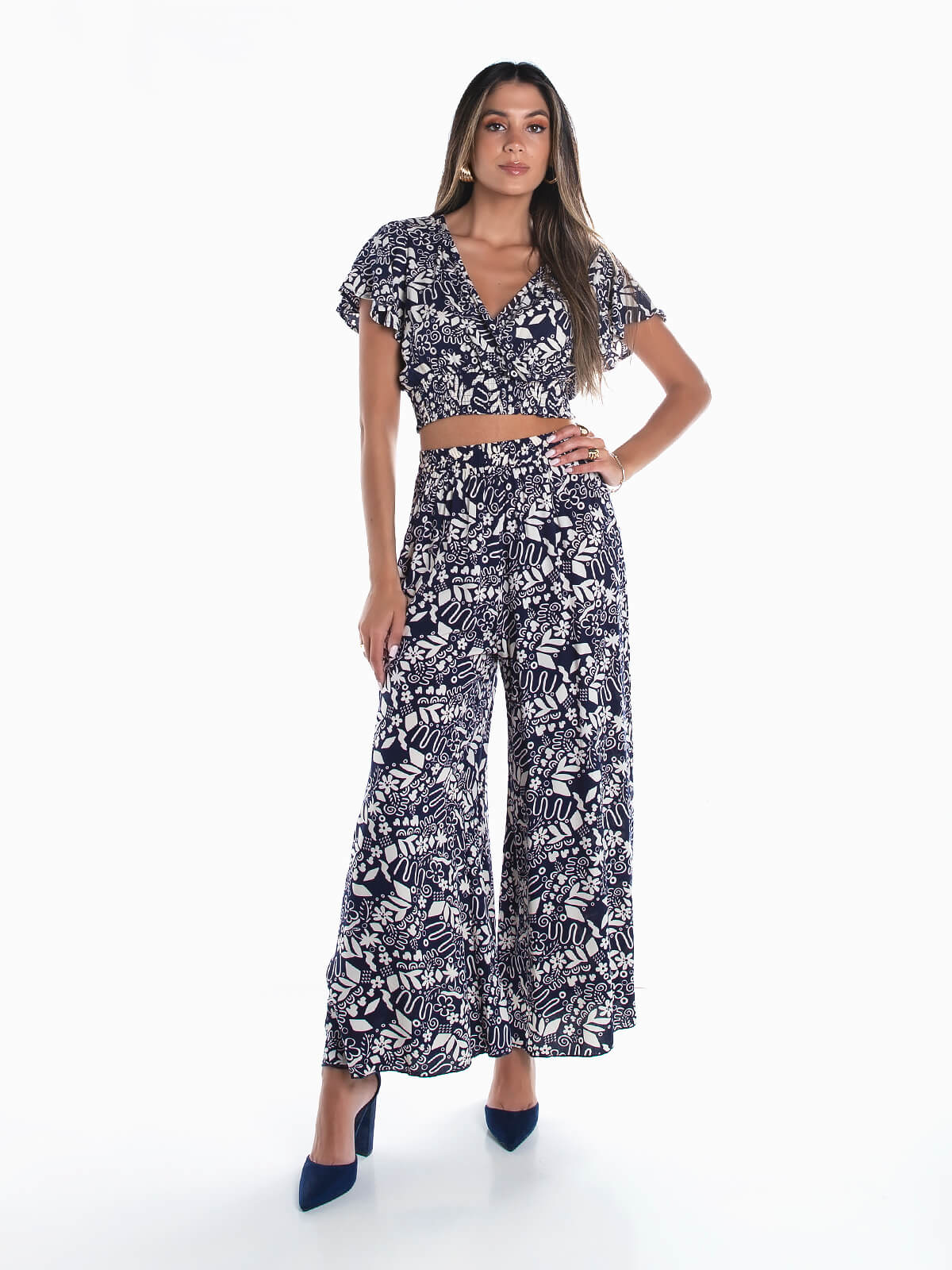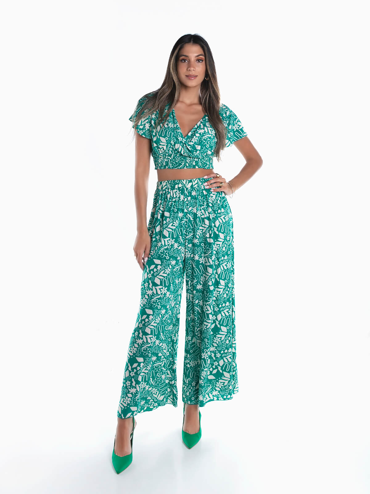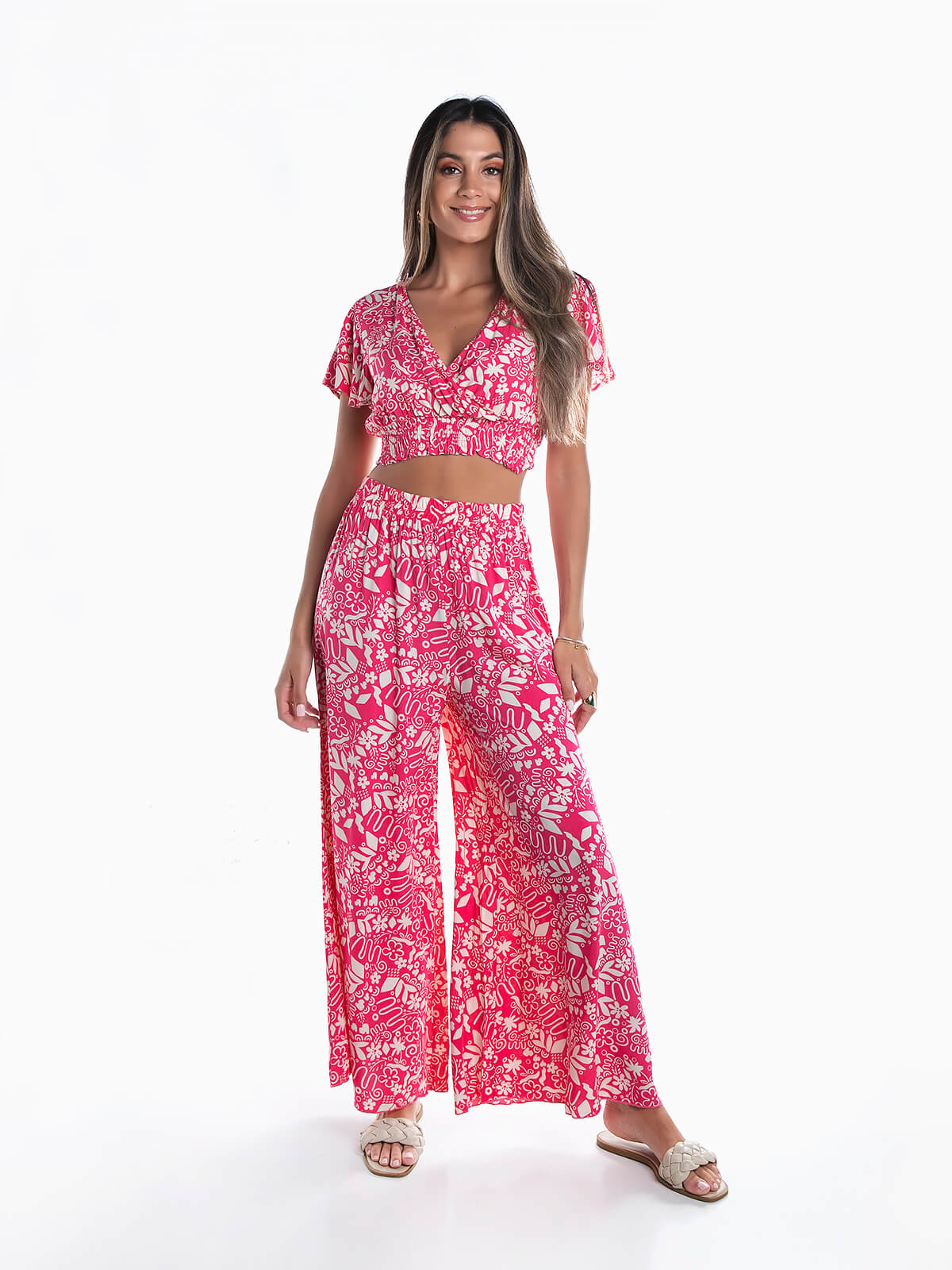 Crop top em V cruzado com elástico e manga curta. Calças largas compridas fluídas com cintura alta elástica. Estampado floral.