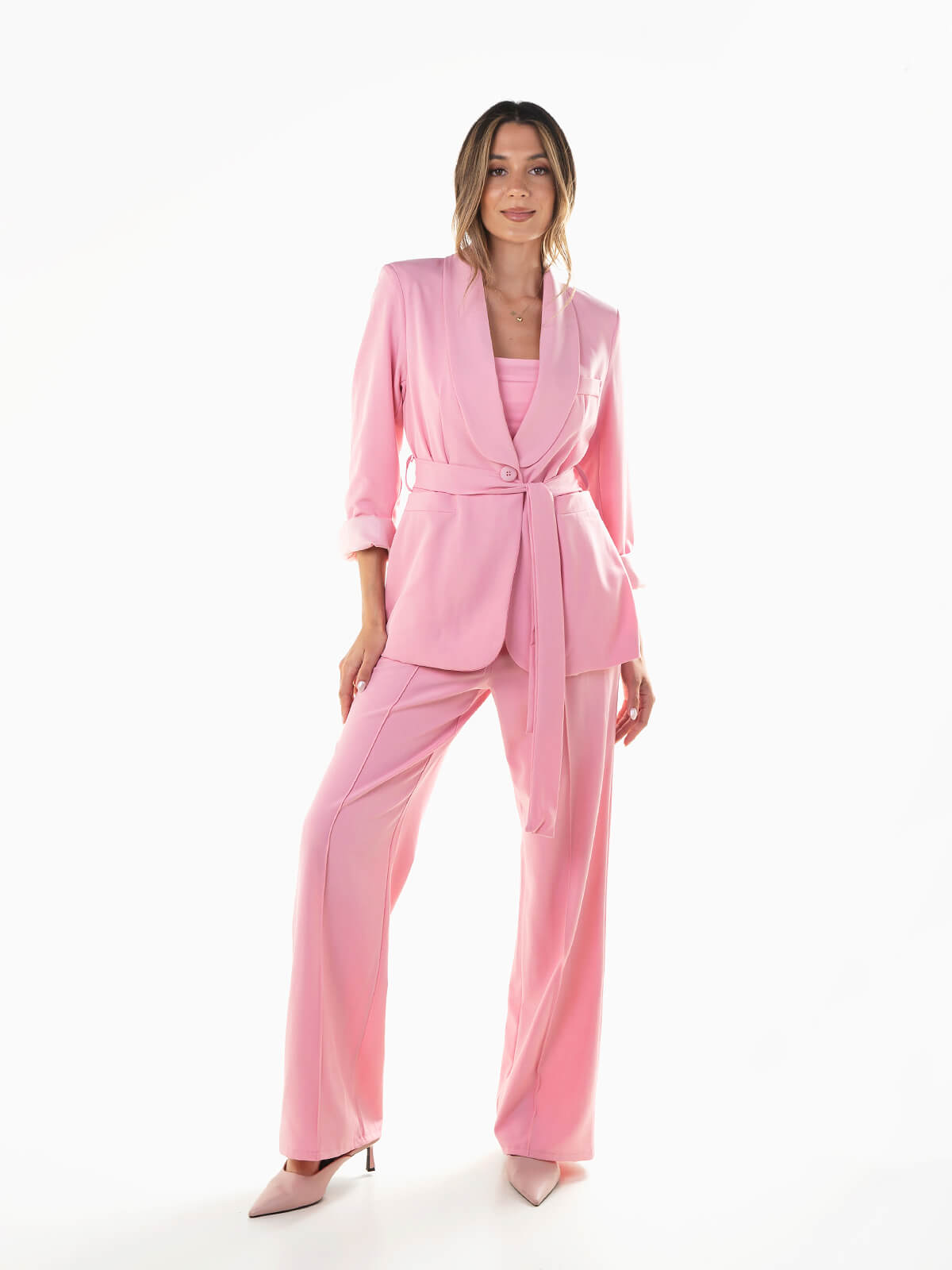 Conjunto de alfaiataria para mulher. Blazer manga comprida com cinto no mesmo tecido para laço e pormenor de ombreiras para melhor caimento. Gola abas e bolsos decorativos. Interior forrado. Calças largas de cintura alta com costura reforçada à frente e 2 bolsos. Aperto de fecho éclair e botão.