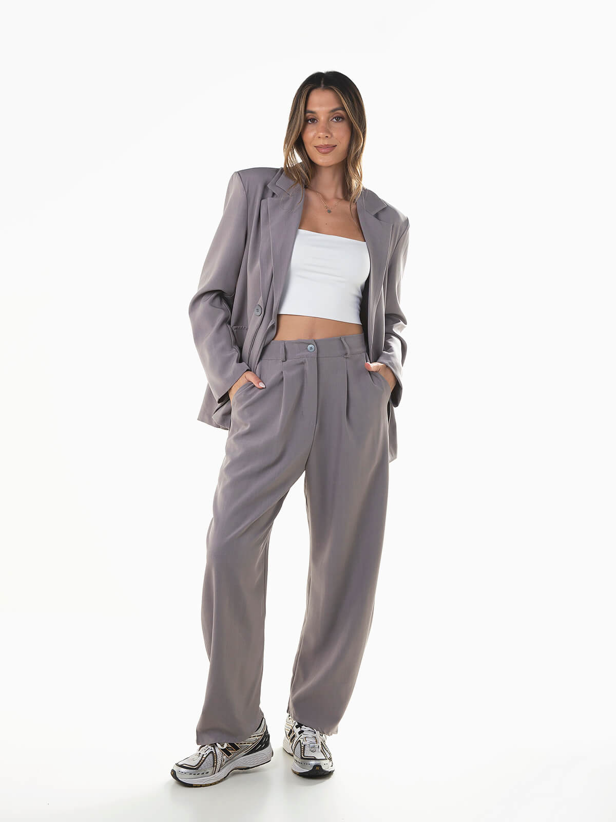 Conjunto de alfaiataria para mulher. Blazer manga comprida com cordão para laço e pormenor de ombreiras para melhor caimento. Gola dupla de abas e bolsos decorativos. Interior forrado. Calças baggy de cintura alta com pregas à frente e 2 bolsos. Aperto de fecho éclair e botão.