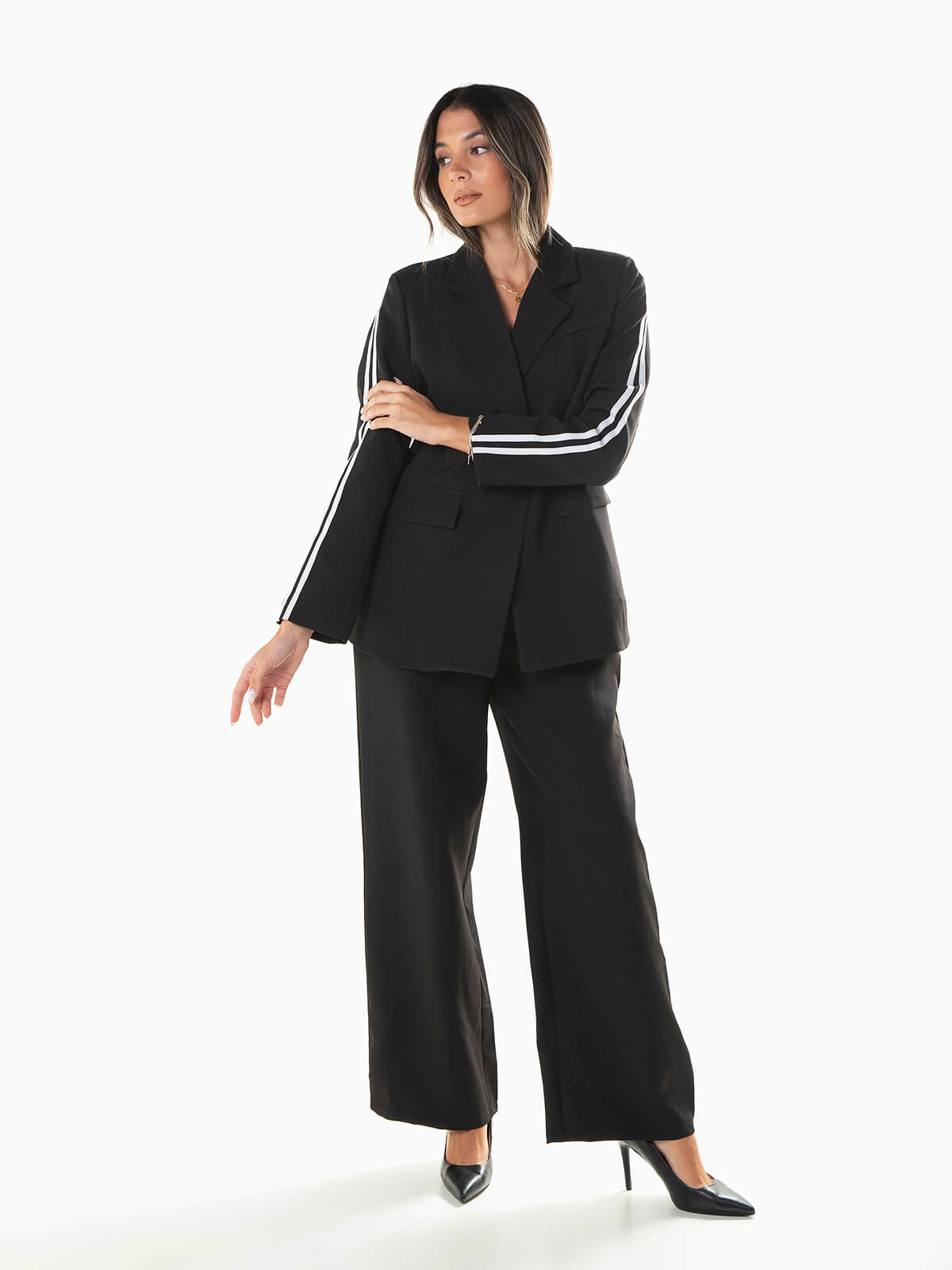 Conjunto fato com com riscas para mulher. Blazer manga comprida com interior forrado e ombreiras. Palas decorativas. Gola abas. Aperto de botão. Calças largas de cintura alta elástica com 2 bolsos.