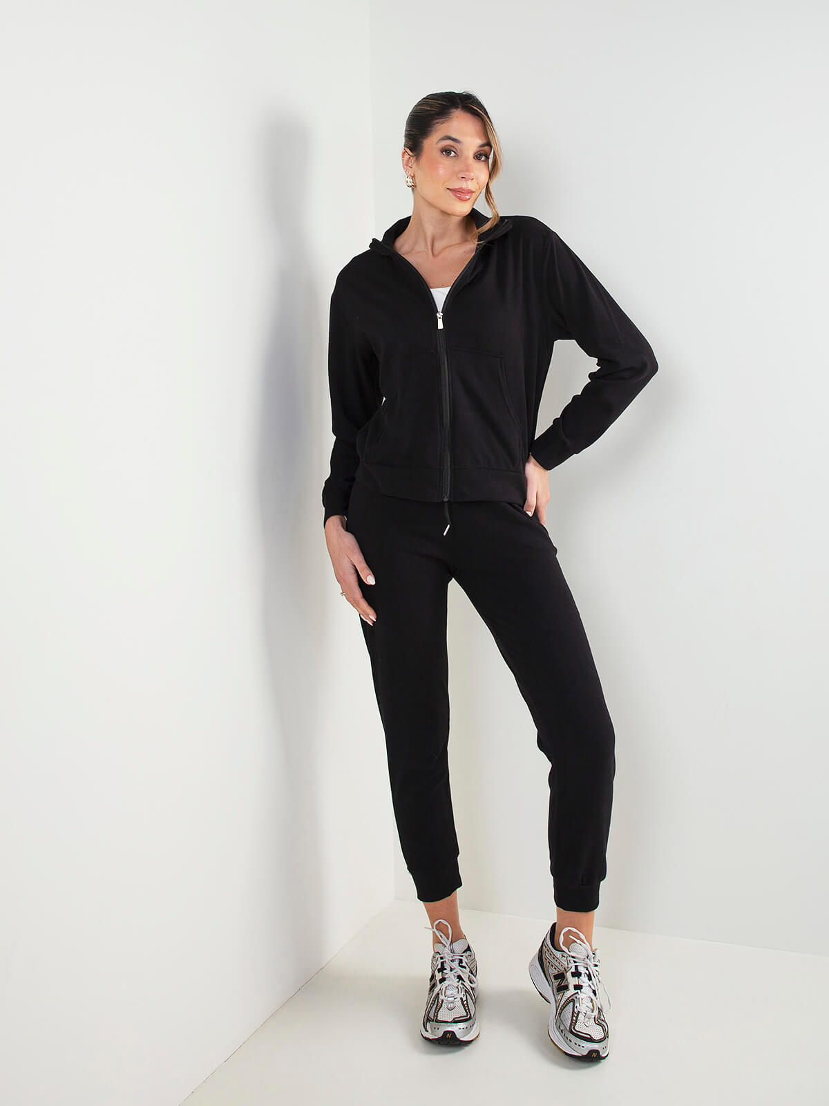 Conjunto de fato de treino para senhora, composto por casaco com fecho e calças de cintura elástica com cordão ajustável. Modelo confortável, em malha macia, ideal para looks descontraídos e urbanos. Um essencial versátil para o dia a dia, viagens ou momentos de lazer.