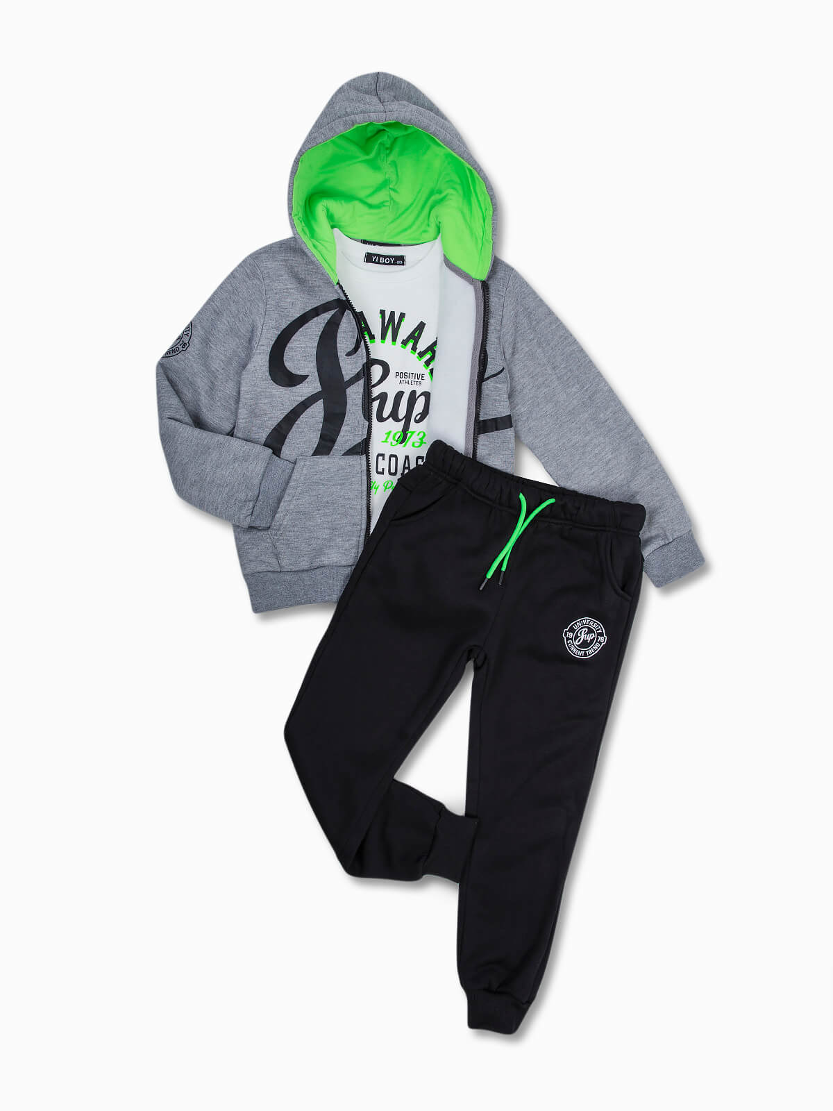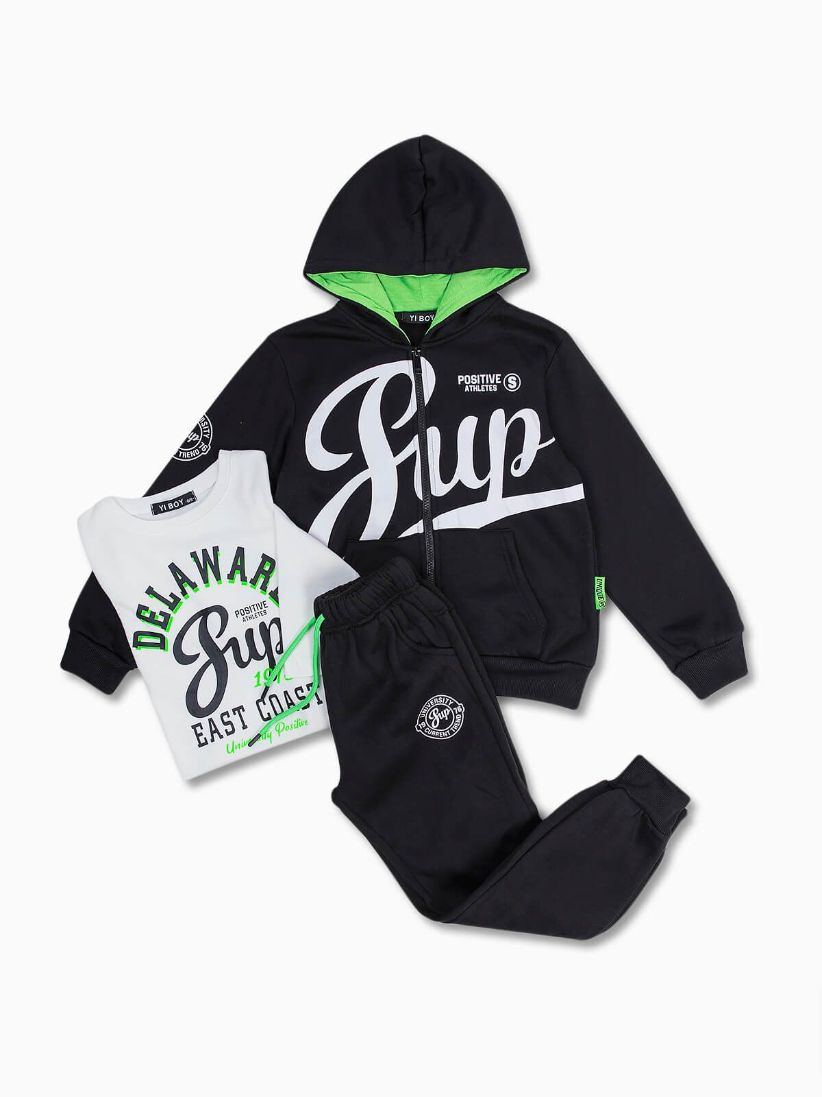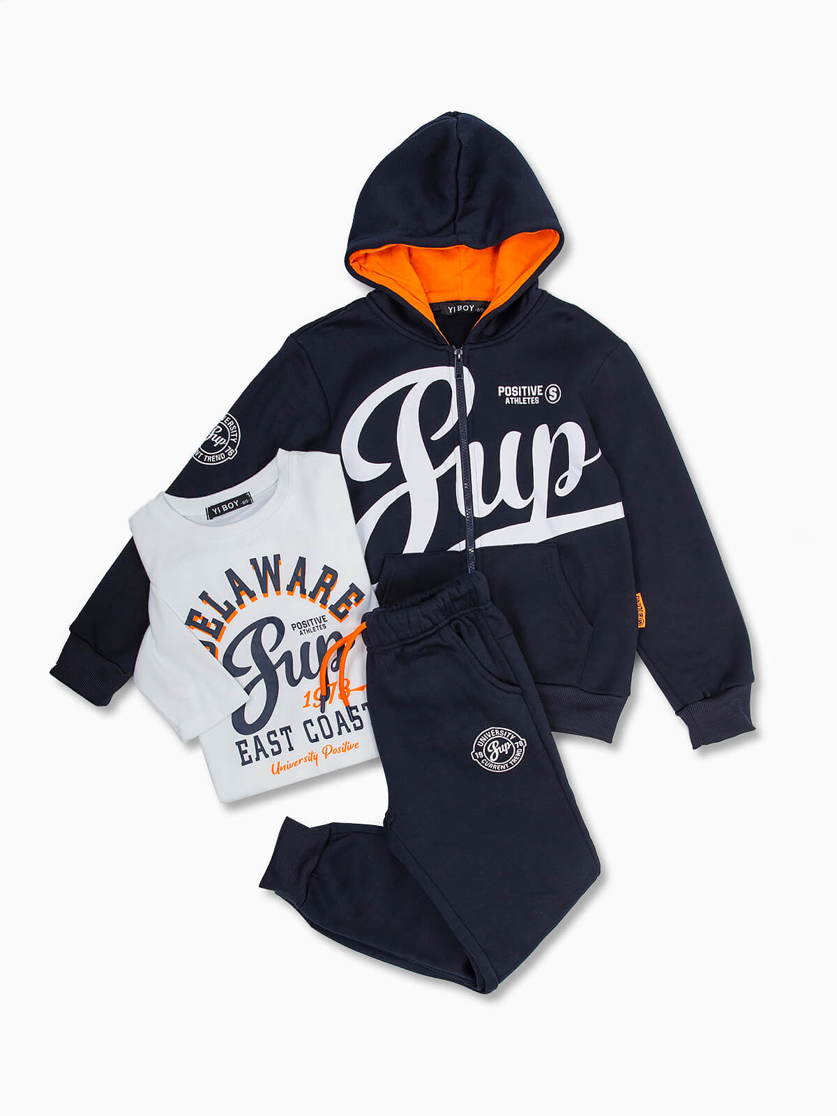 Conjunto cardado para menino de 3 peças. Casaco hoodie estampado de manga comprida com 2 bolsos. T-shirt branca manga comprida com gola redonda. Joggers com cintura elástica e cordão. 2 bolsos.