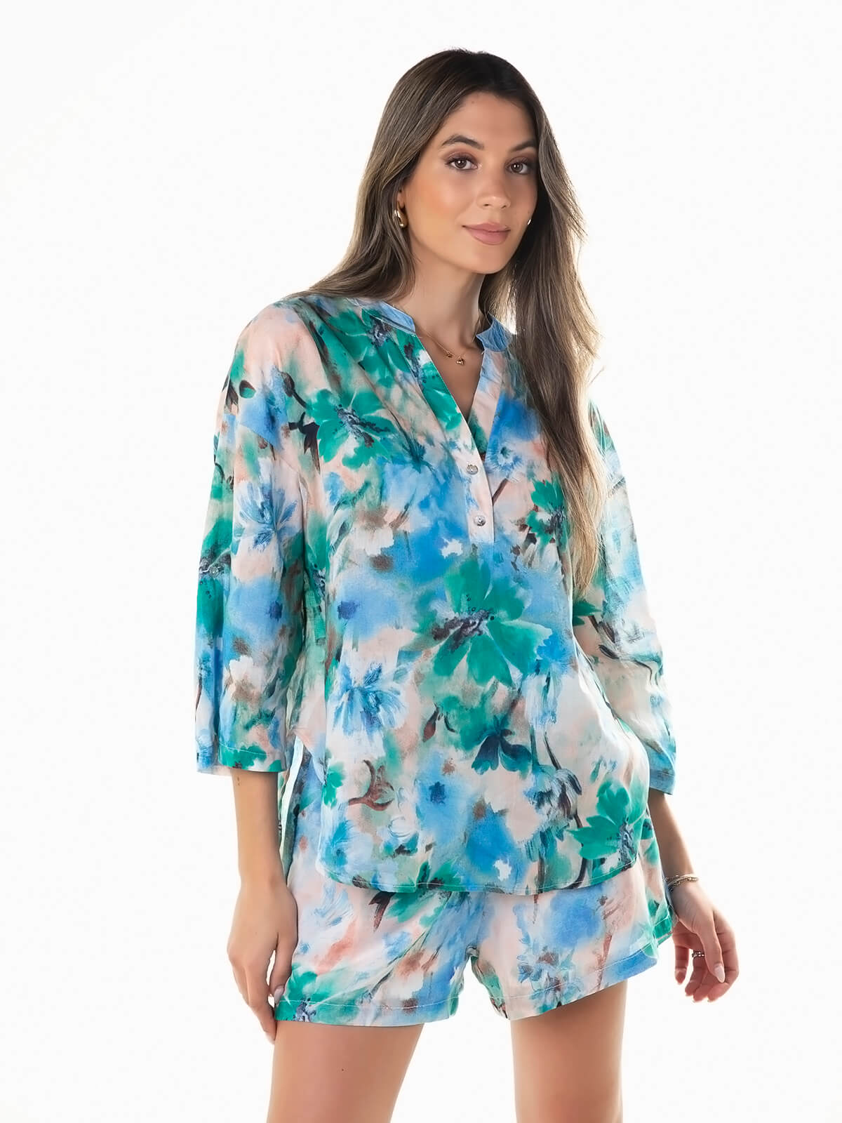 Conjunto estampado floral em algodão. Blusa com manga 3/4 e presilha para ajustar. Decote em V com botões. Calções curtos fluídos de cintura alta elástica.