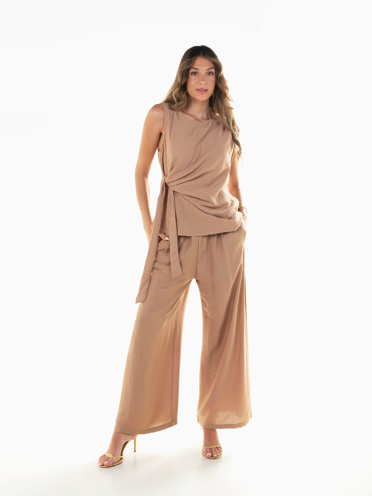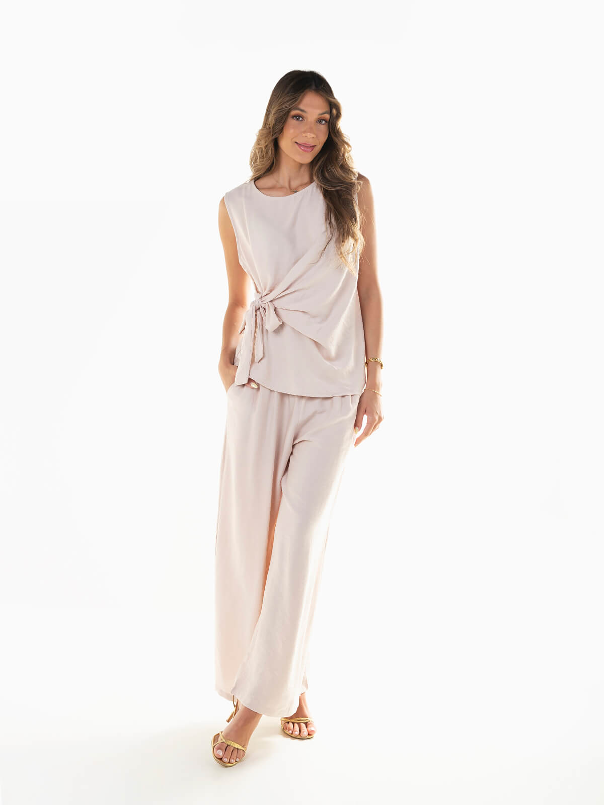 Conjunto fluído para senhora. Blusa sem mangas com tecido para laço na lateral. Decote redondo. Calças largas de cintura alta elástica com 2 bolsos.