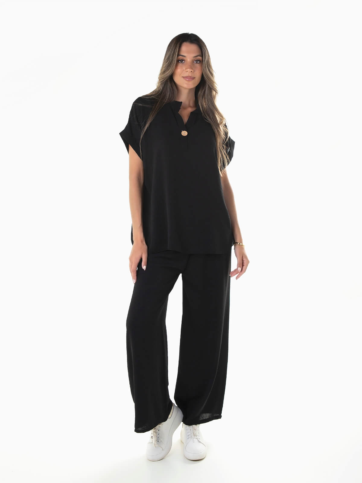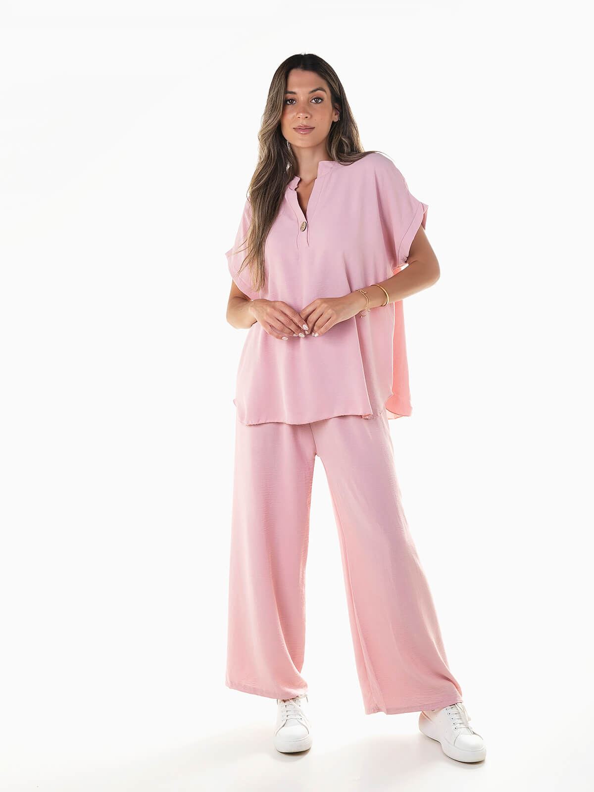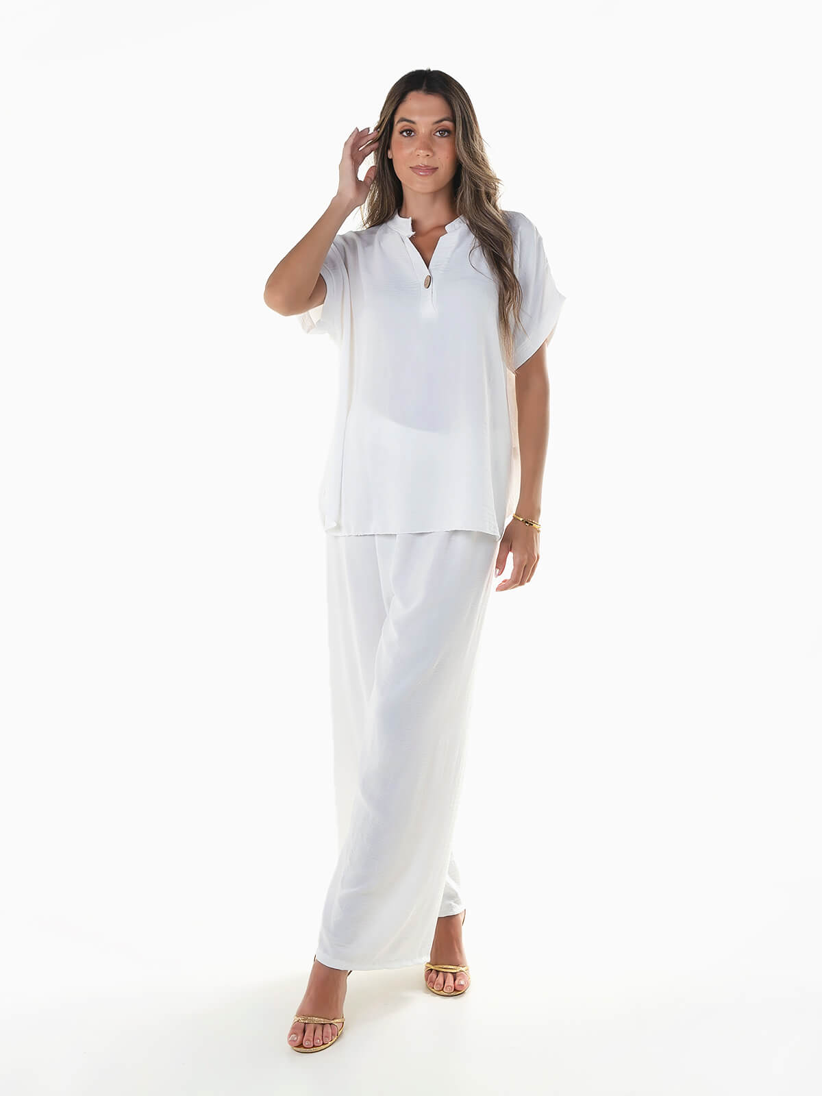 Blusa fluída de manga curta com cós arredondado e decote em bico. Aperto de botão. Calças largas de cintura alta elástica.