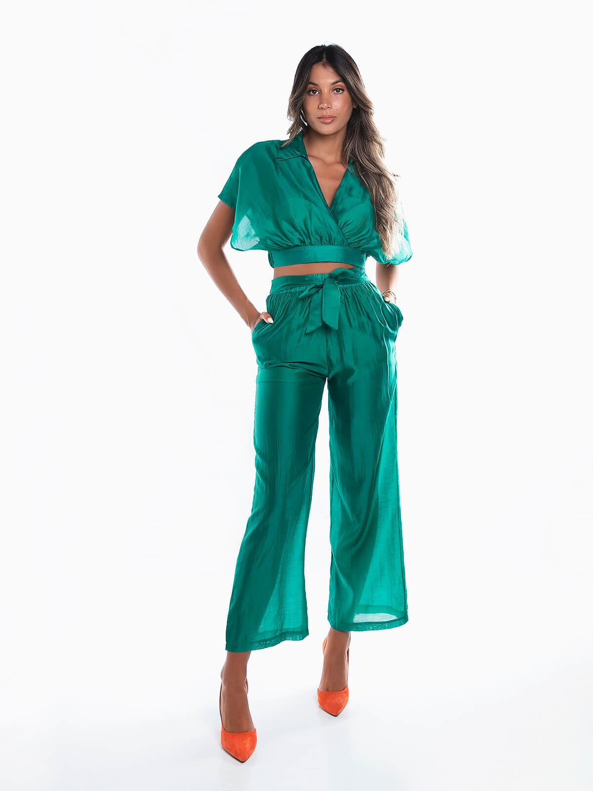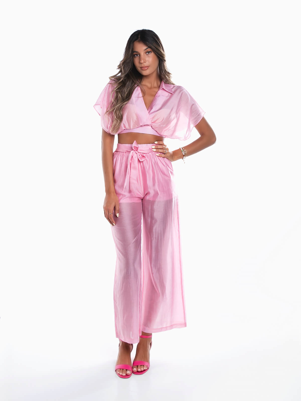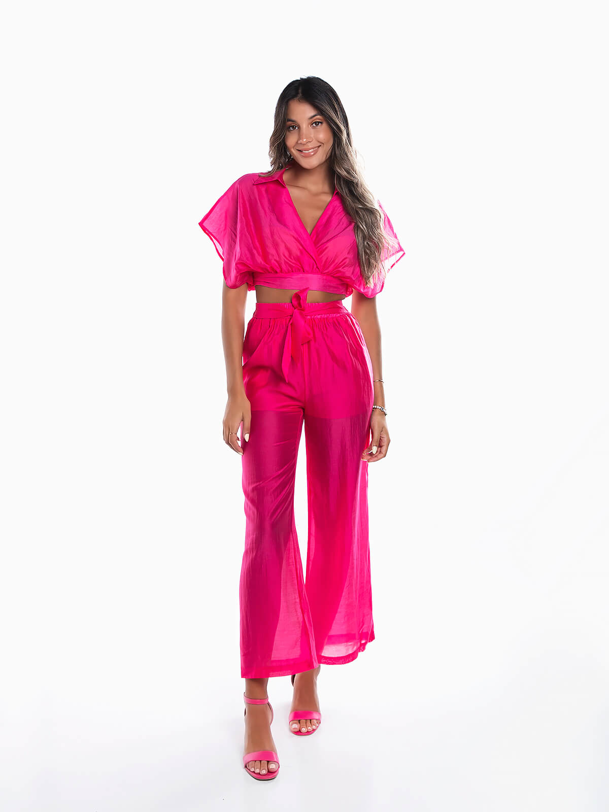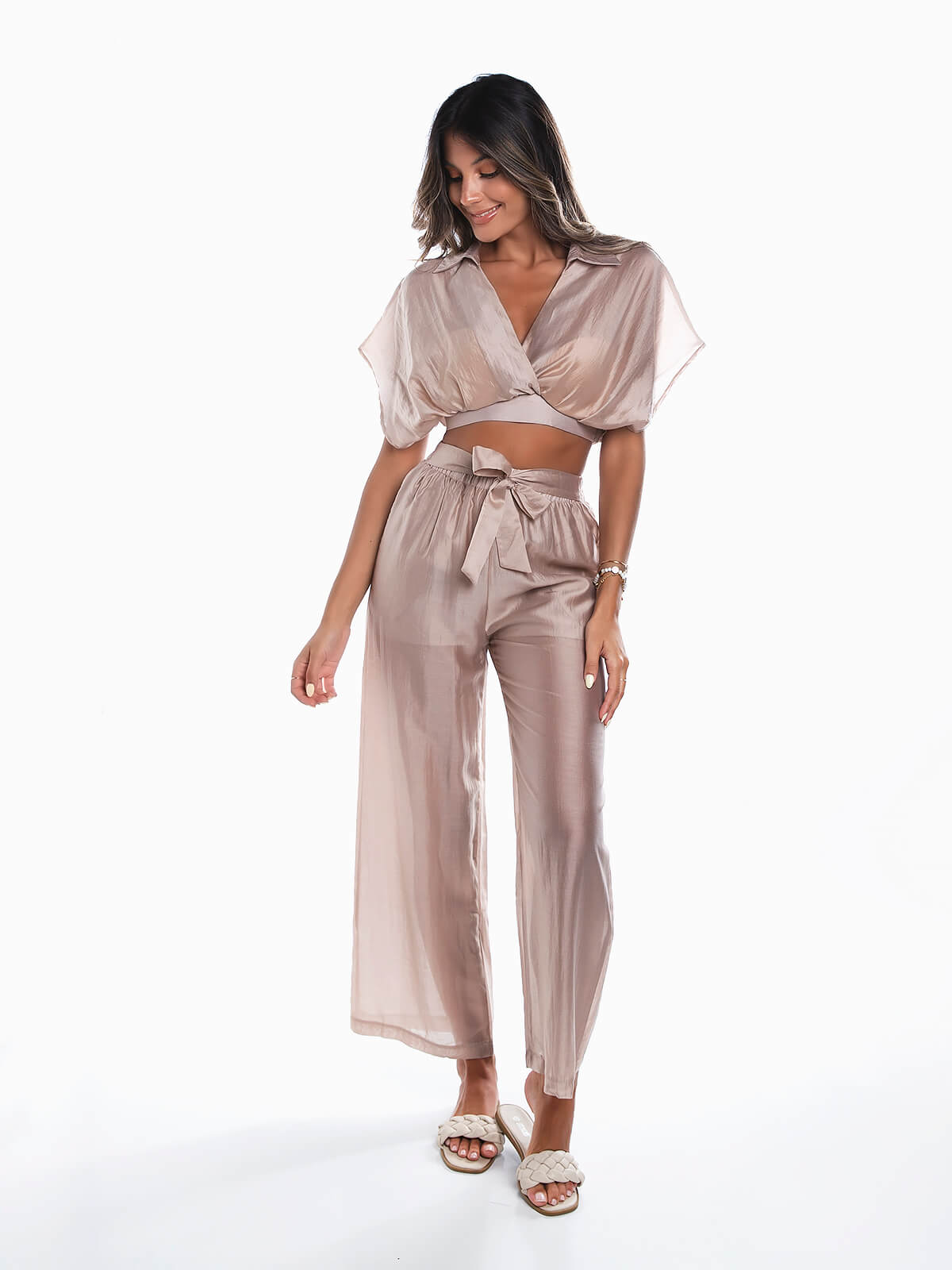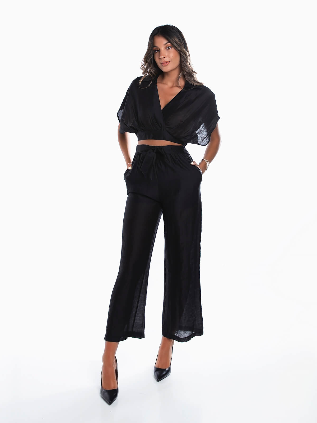 Conjunto fluído em tecido transparente composto por 2 peças para senhora. Crop top com decote de trespasse e gola de abas. Calças de cintura alta elástica com cinto aplicado para laço. Forradas. 2 bolsos laterais.
