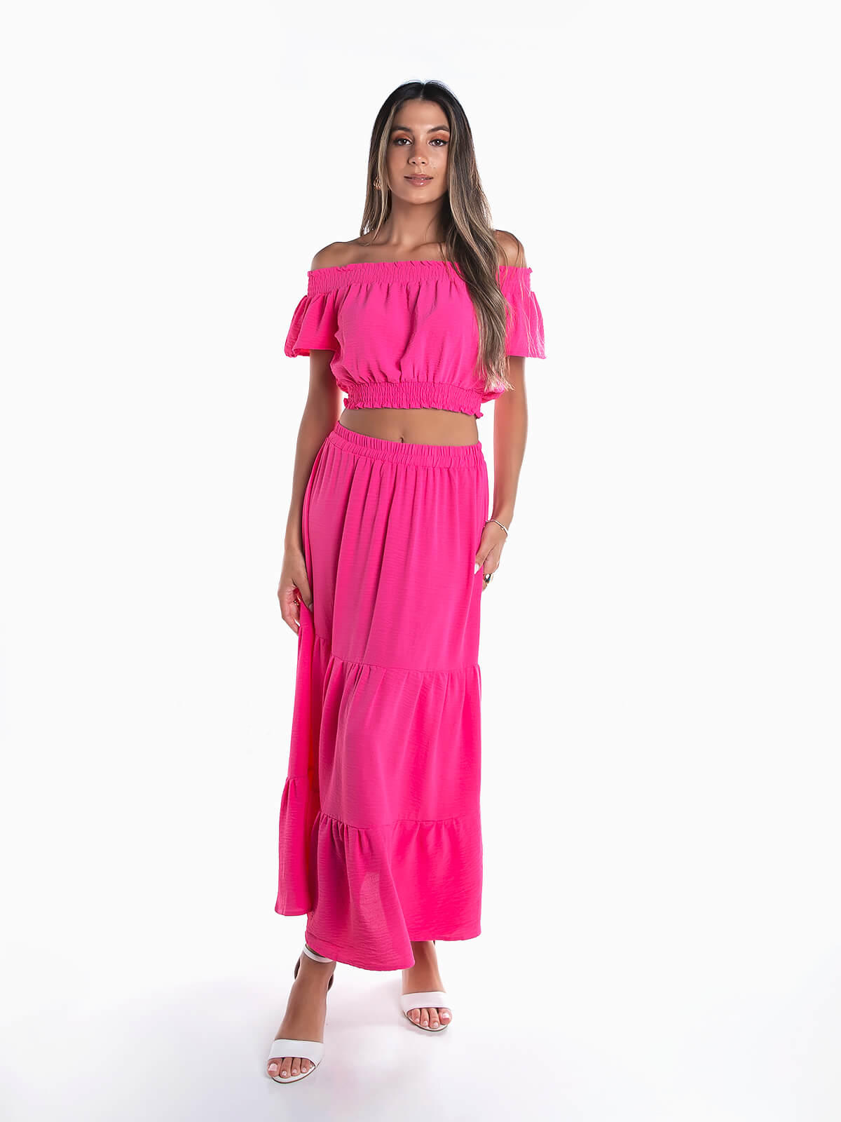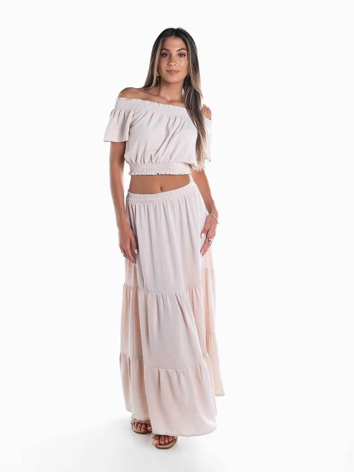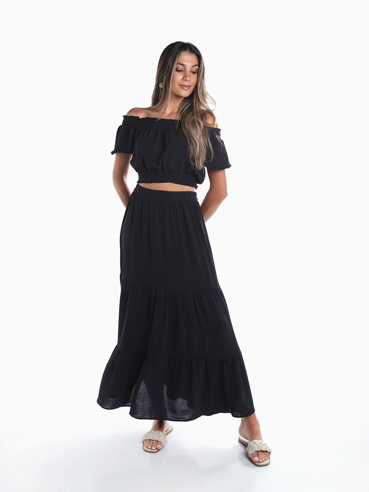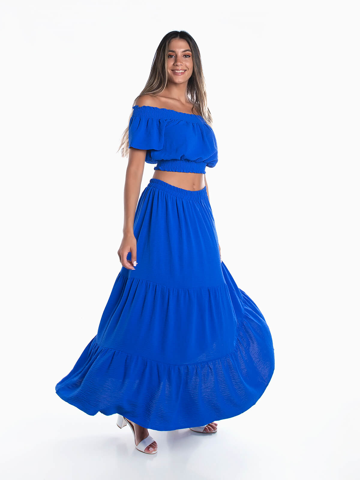 Crop top de manga curta com decote barco e pormenores em franzido smock. Saia larga comprida com cintura alta elástica e encaixe de folhos.