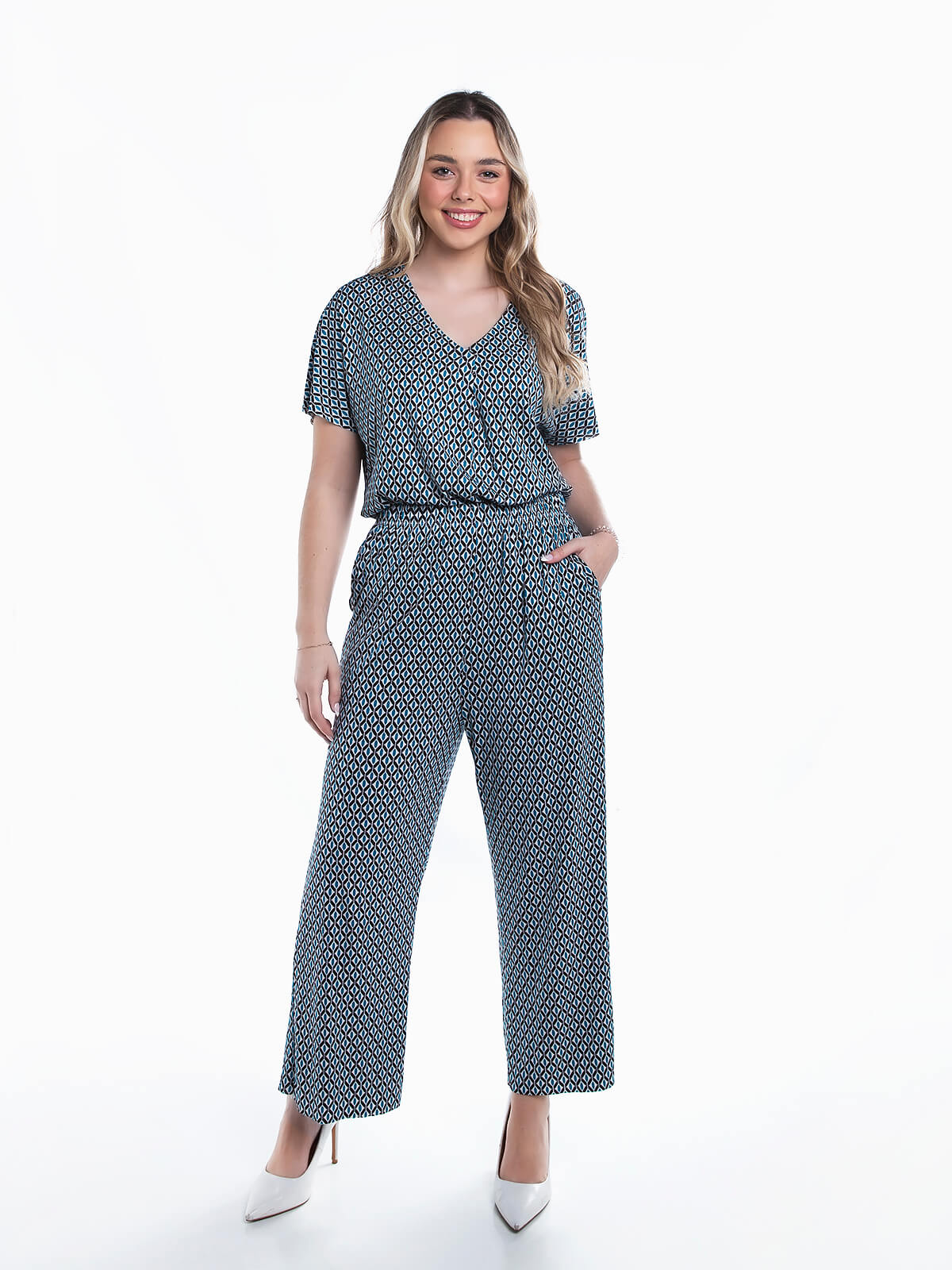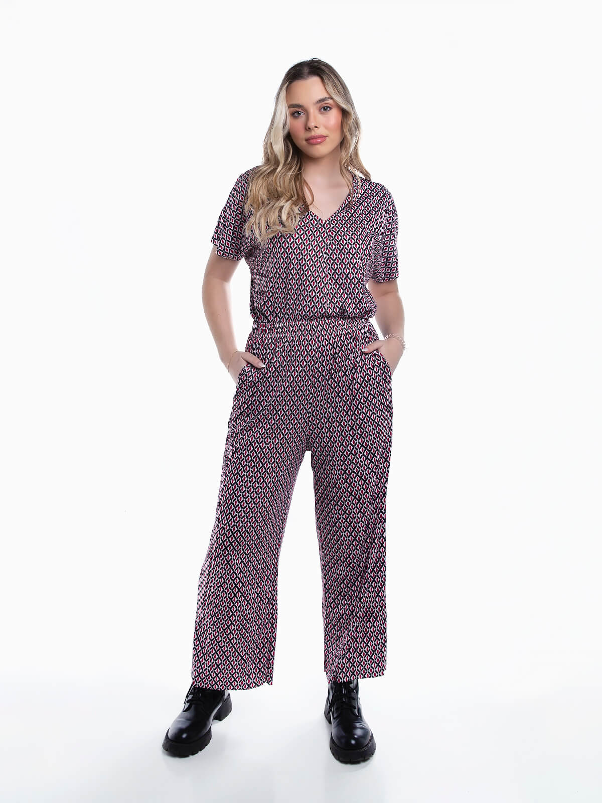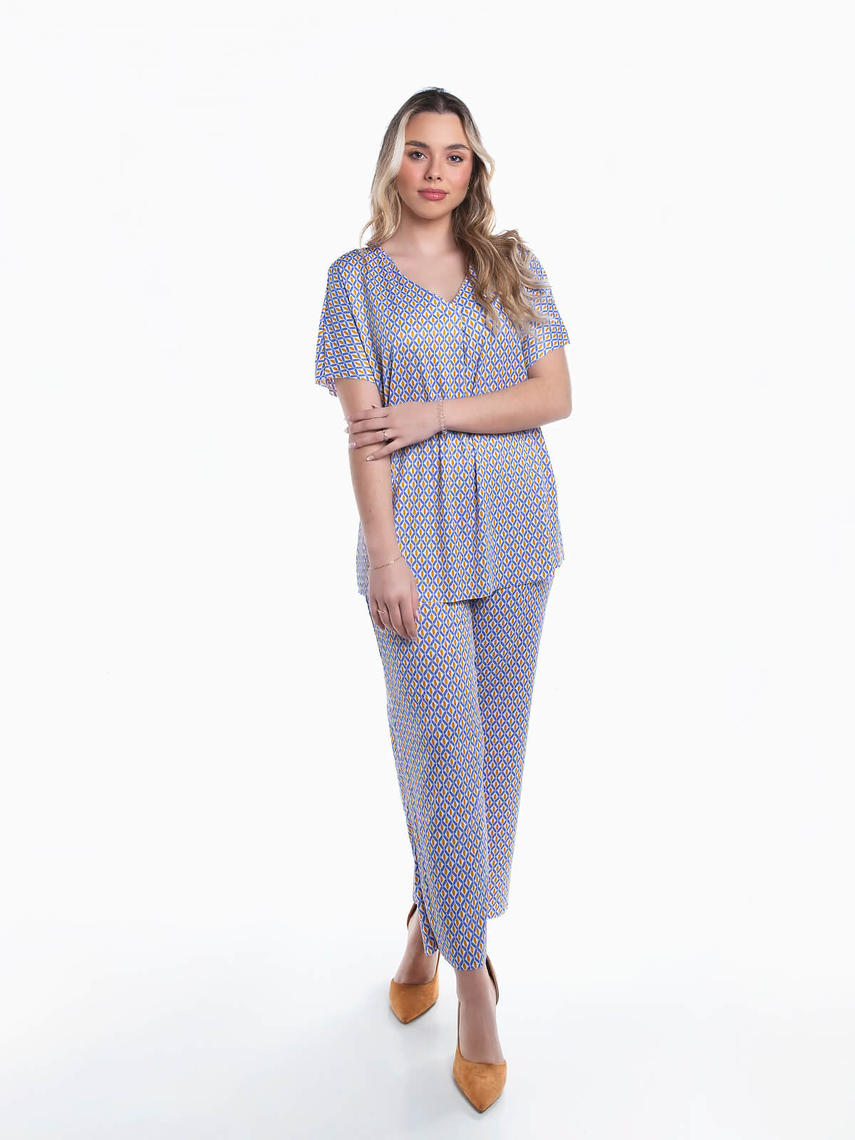 Conjunto em tecido fluído estampado geométrico para senhora. T-shirt manga curta com decote em V. Calças largas de cintura alta elástica. 2 bolsos.