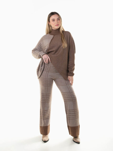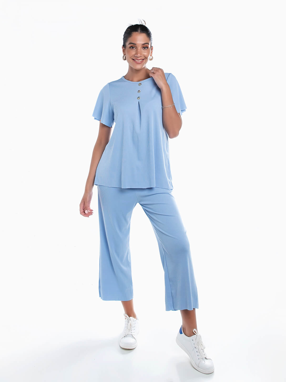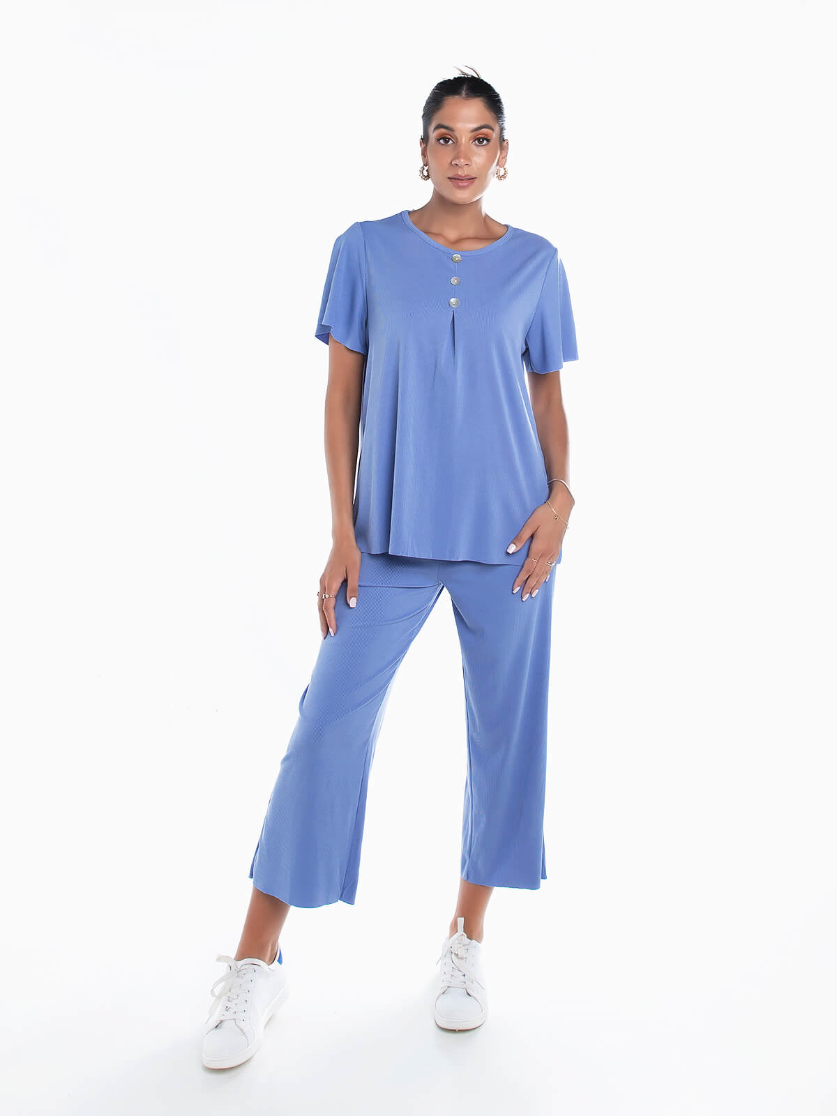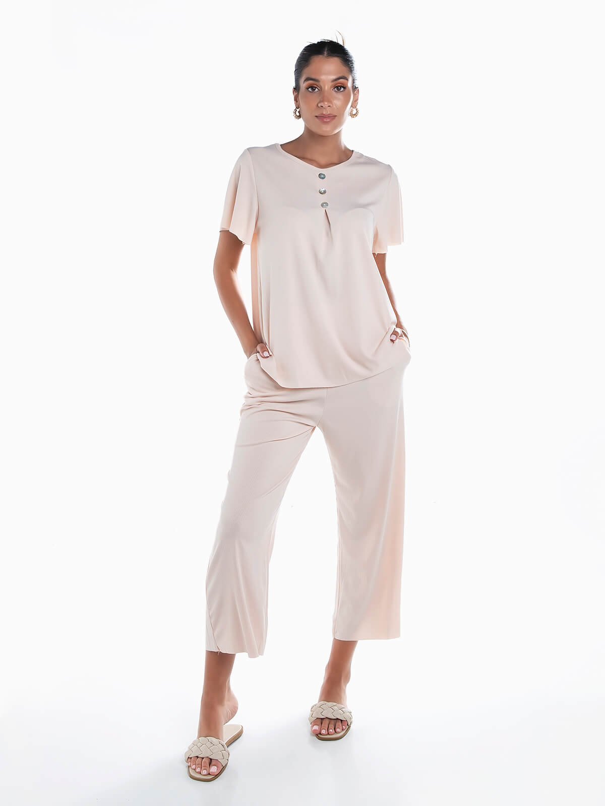Conjunto de malha canelada composto por 2 peças. T-shirt larga de manga curta com decote redondo e pormenor de botões decorativos. Calças fluídas de cintura alta elástica com dois bolsos laterais.