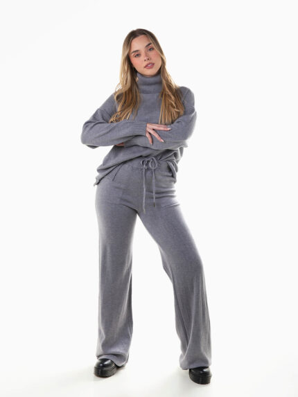 Conjunto fluído com estampado geométrico. Crop top de manga curta com nó na frente. Decote em bico. Calças largas de cintura alta elástica.