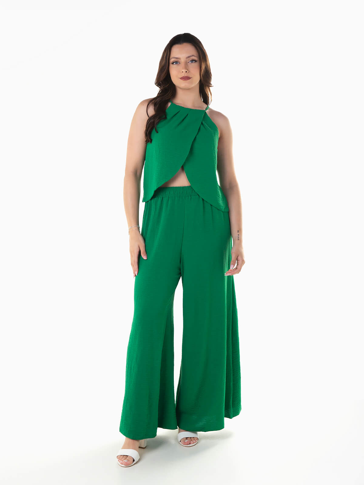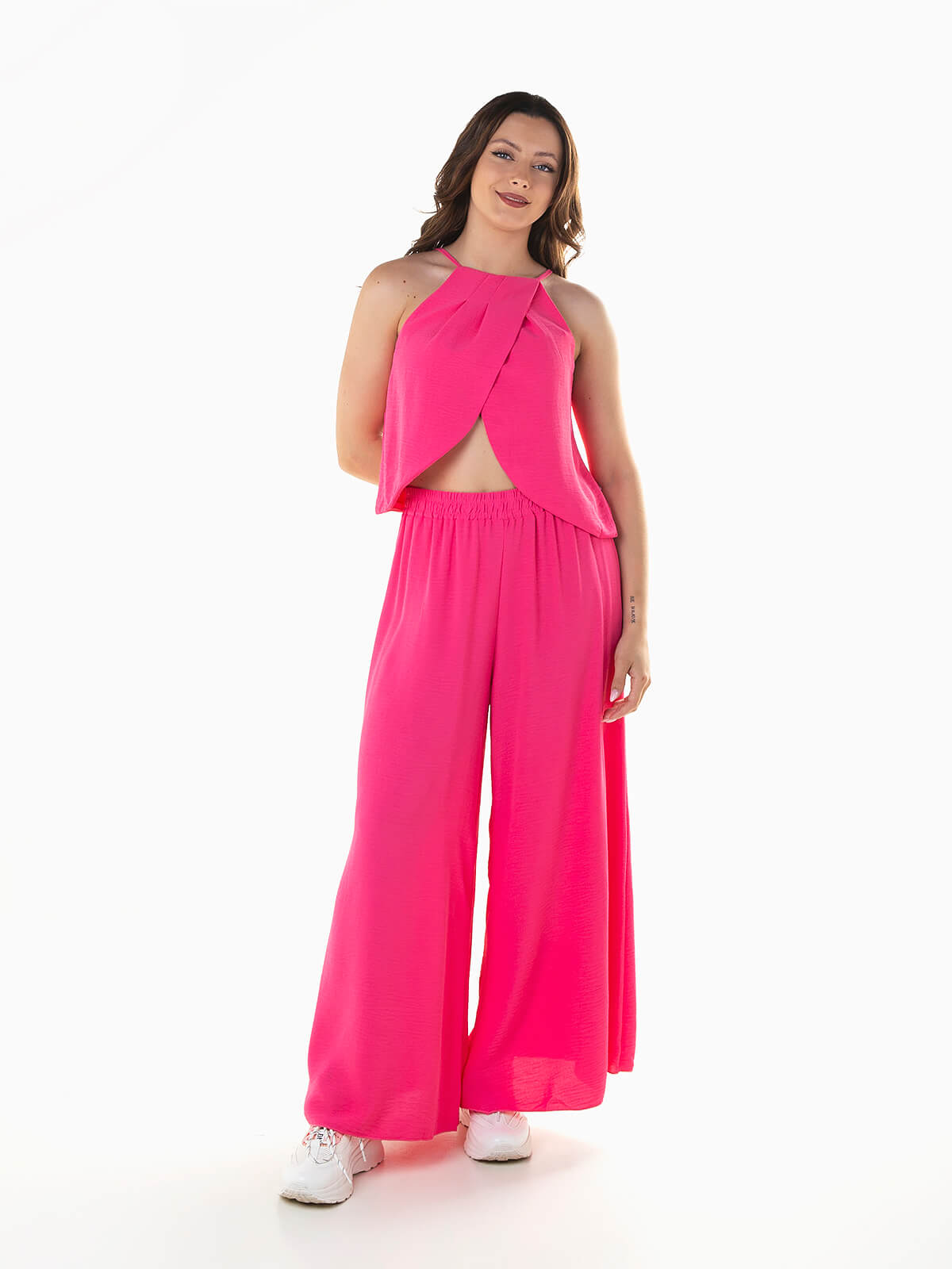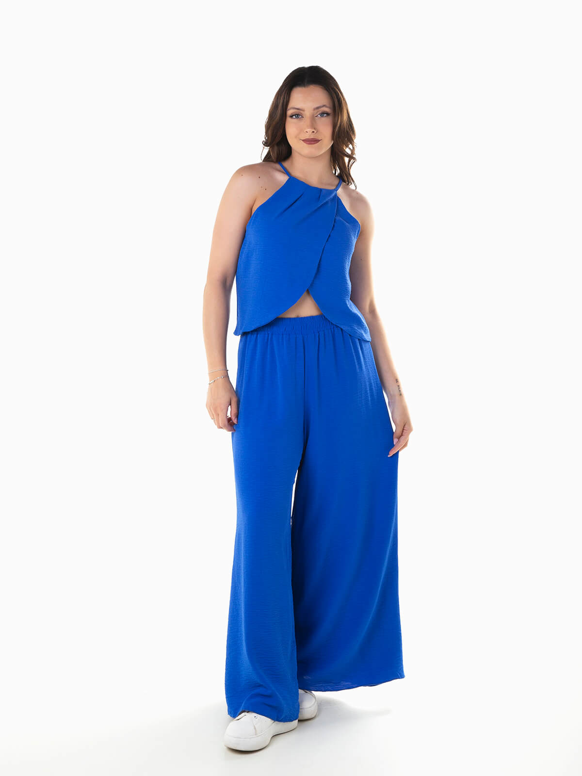 Top fluído de alças com pormenor de trespasse. Decote halter com cordão para ajustar na parte posterior. Calças pantalona com cintura alta elástica.