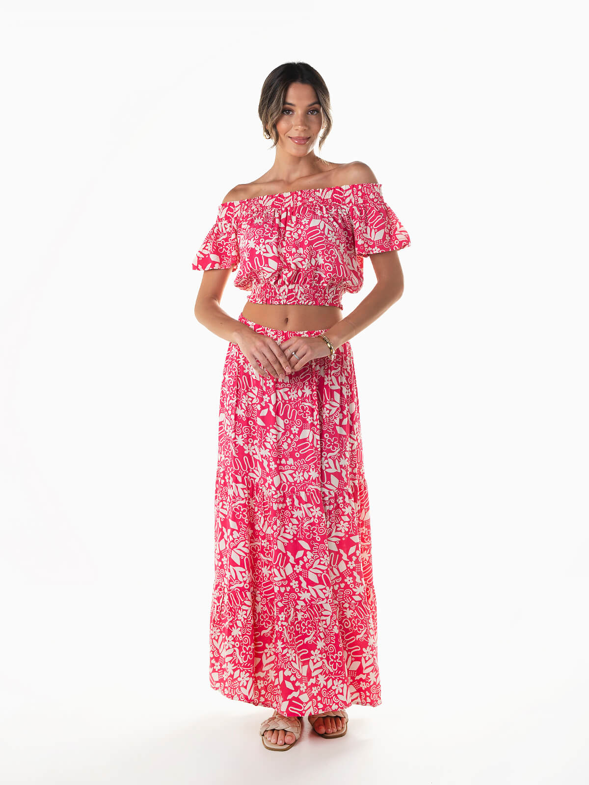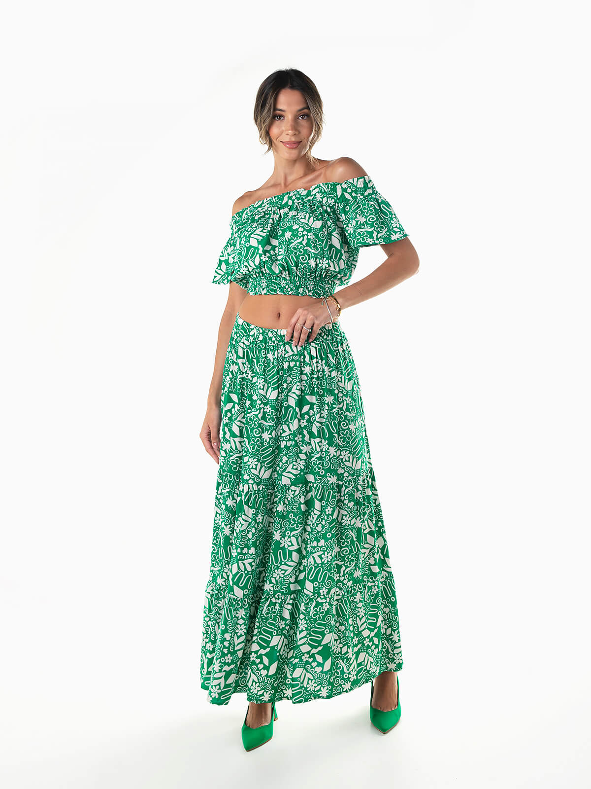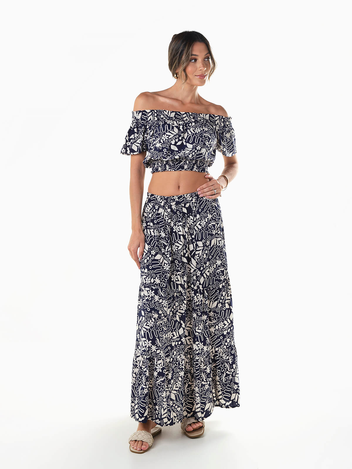 Conjunto fluído com estampado em contraste. Top manga curta com decote barco e acabamentos elásticos. Saia comprida de cintura alta elástica com encaixe de folhos.