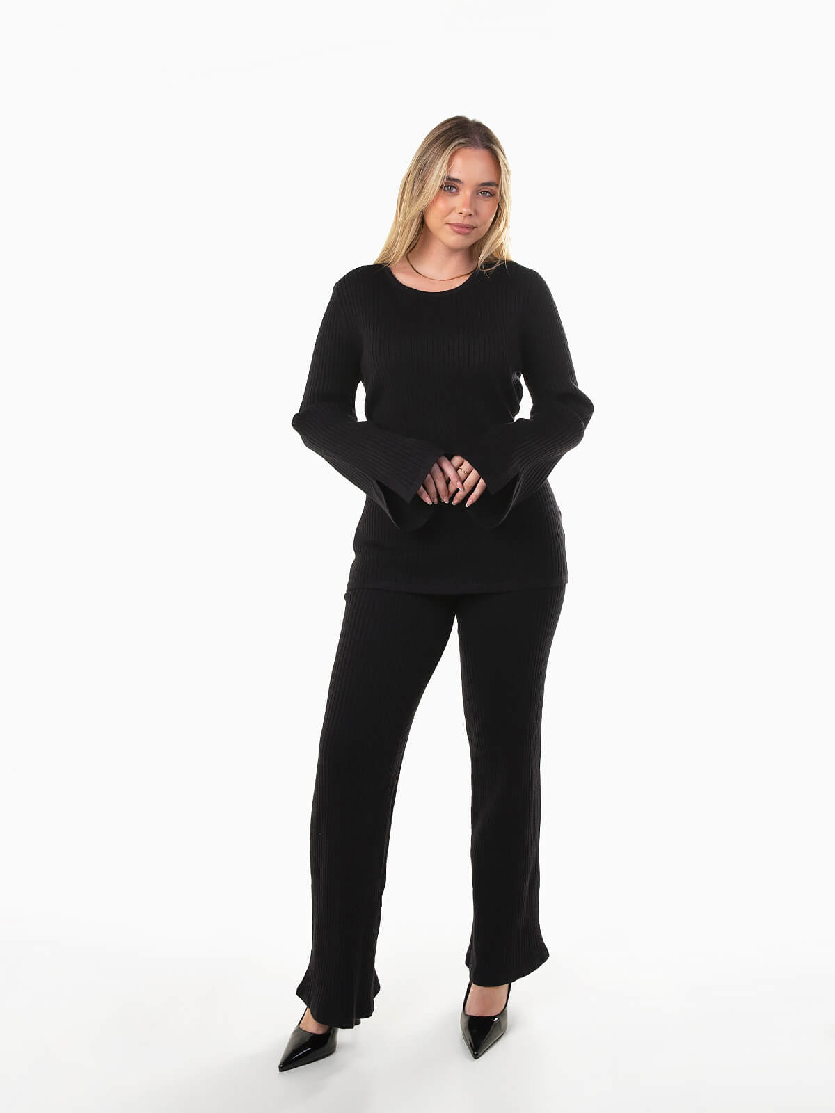 Conjunto de malha canelada confortável. A camisola de manga comprida apresenta aberturas nos punhos, decote redondo e cordão na parte posterior para ajustar a silhueta. As calças de cintura alta e corte reto garantem um visual elegante e descontraído. Perfeito para looks comfy-chic — combina com ténis ou botas para um outfit moderno e versátil.
