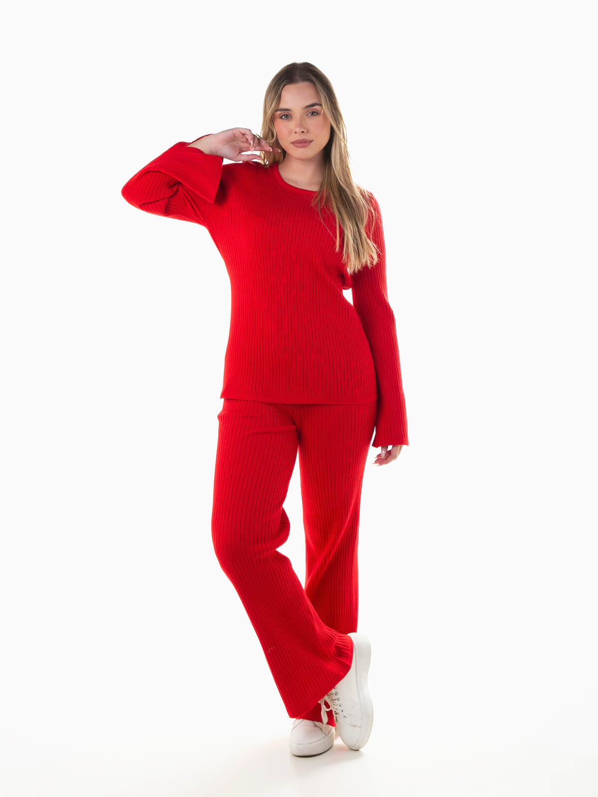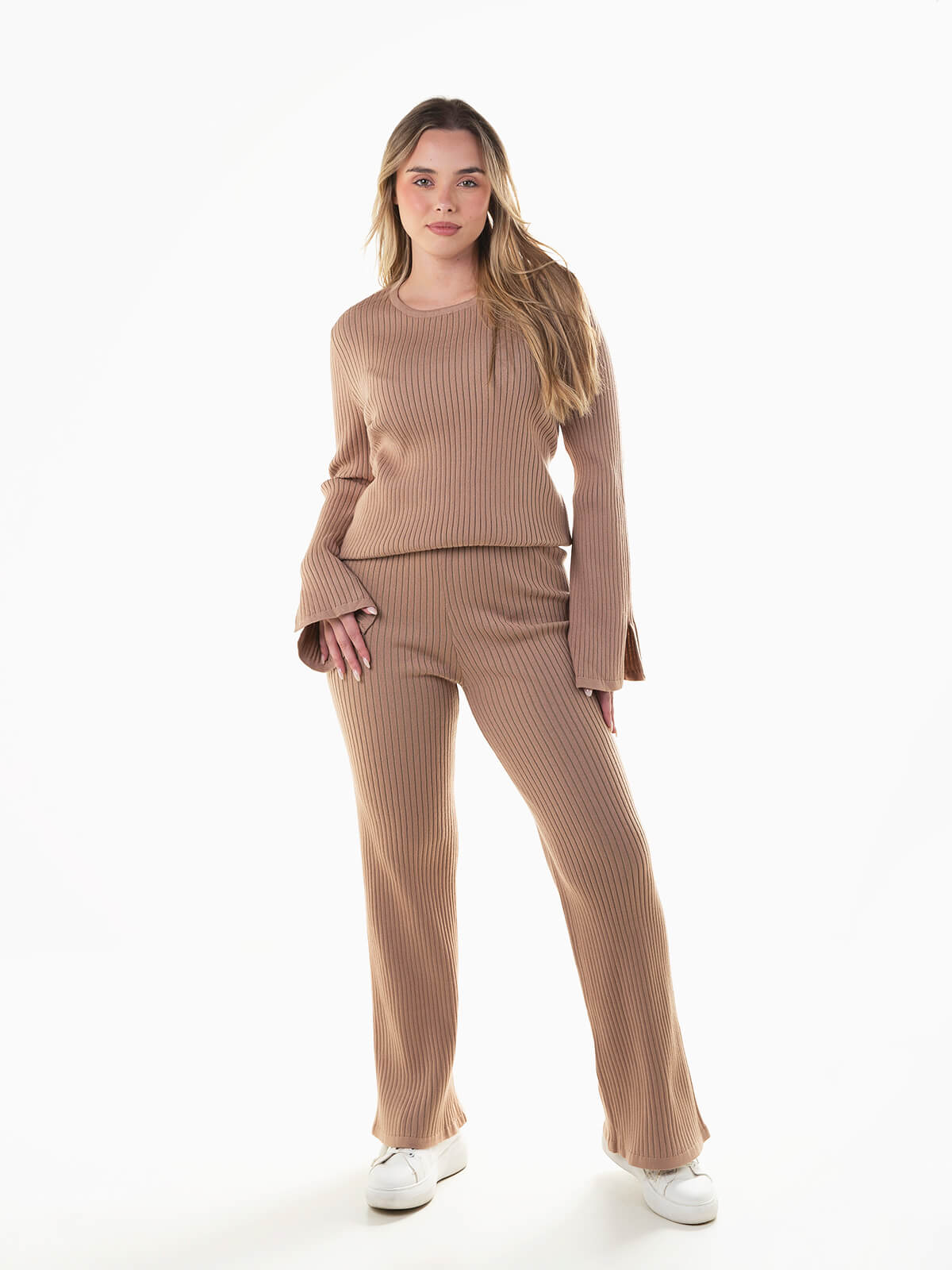 Conjunto de malha canelada confortável. Camisola malha de manga comprida com aberturas nos punhos. Parte posterior com cordão para cintar. Decote redondo. Calças de cintura alta com corte reto.