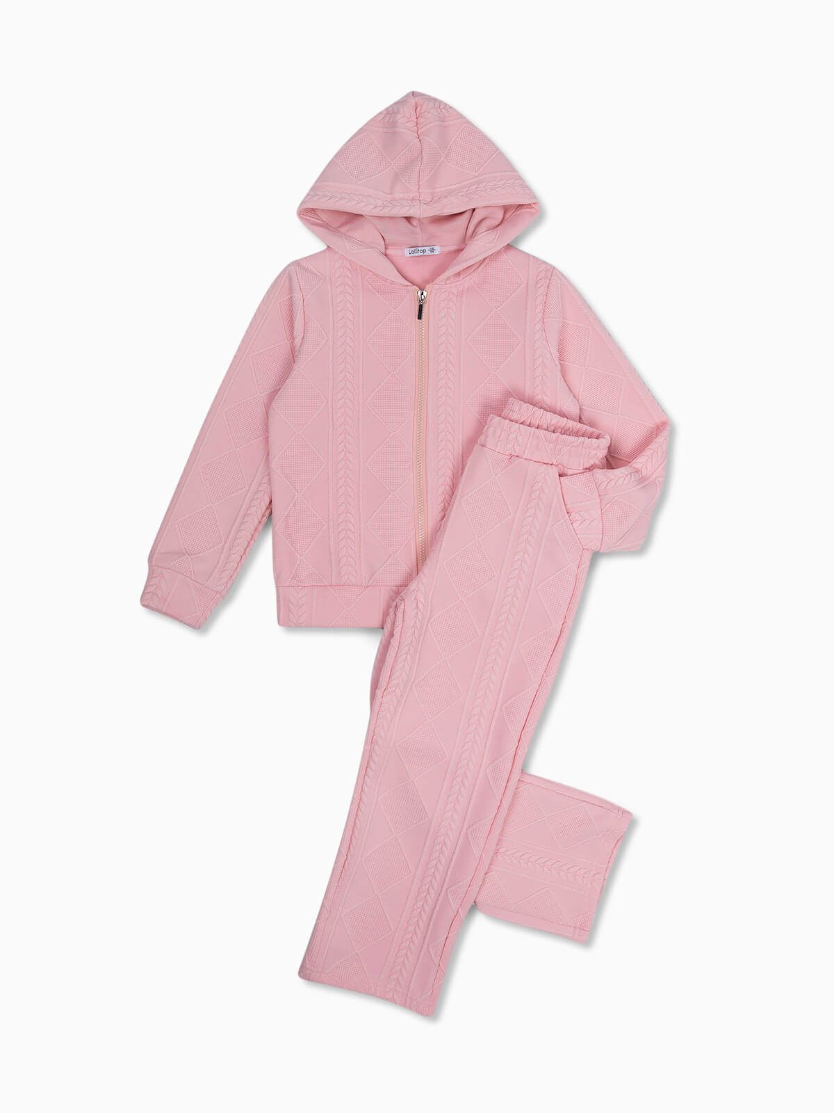 Conjunto em malha trabalhada composto por 2 peças. Casaco hoodie manga comprida com aperto fecho zíper. Calças largas de cintura elástica e 2 bolsos.