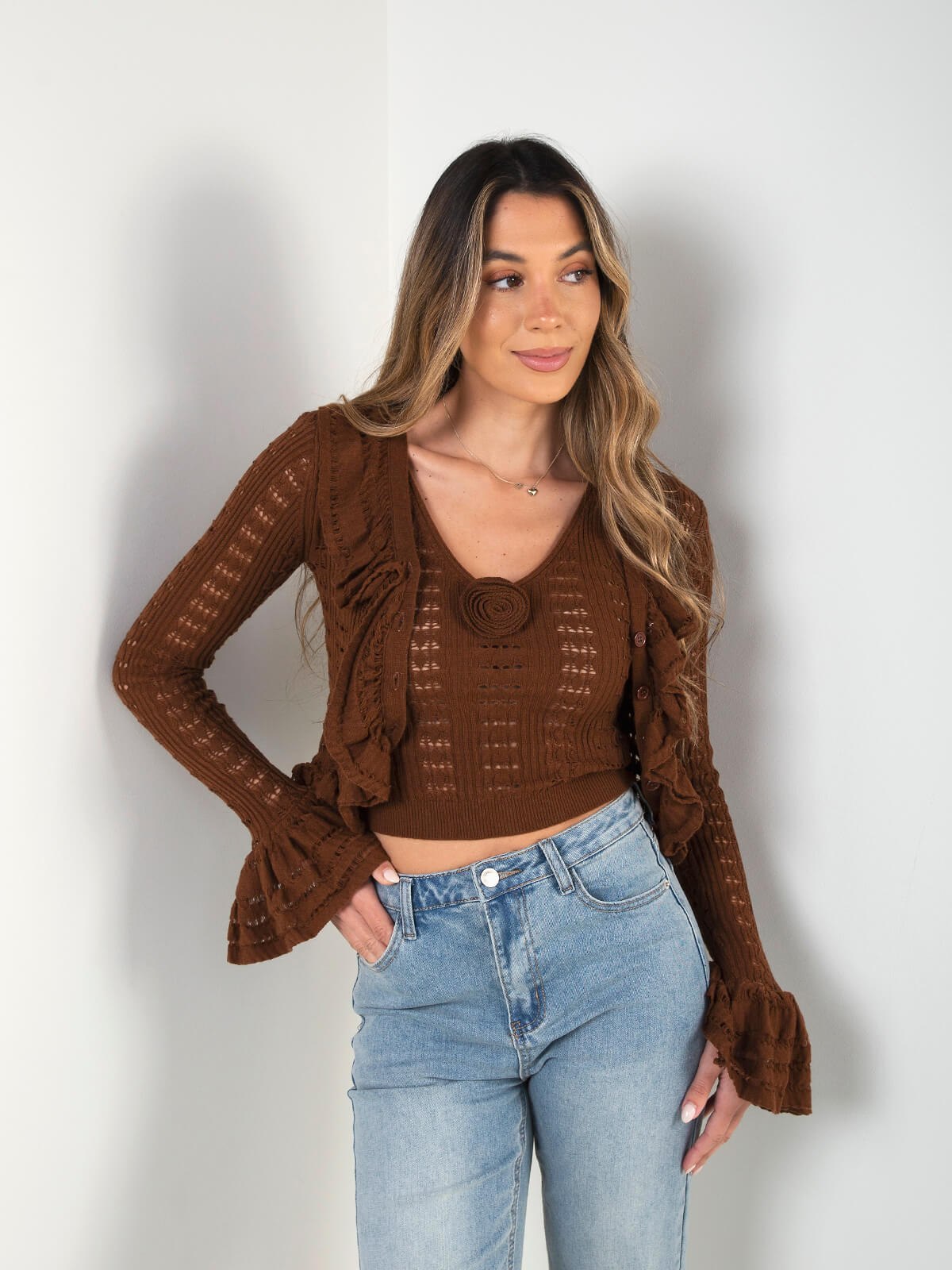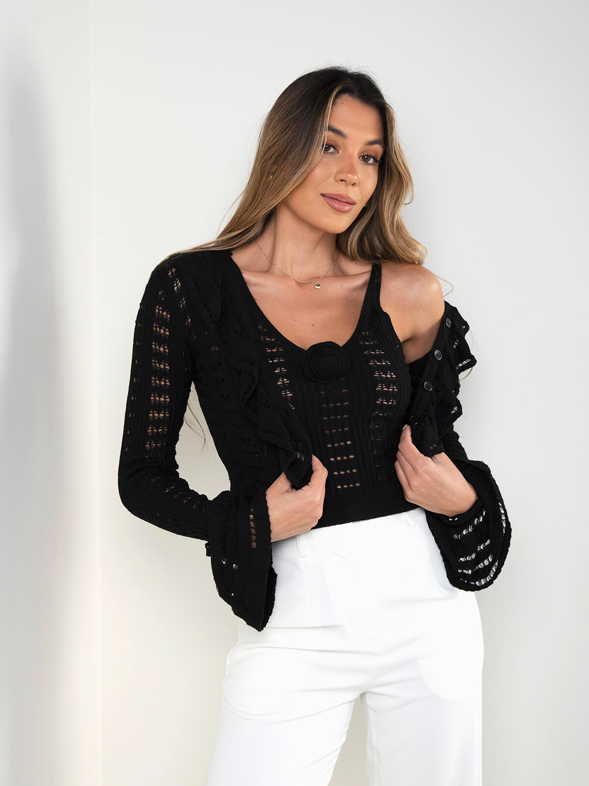 Conjunto de malha trabalhada composto por top de alças com decote em V e detalhe floral, e cardigan com folhos e botões frontais.