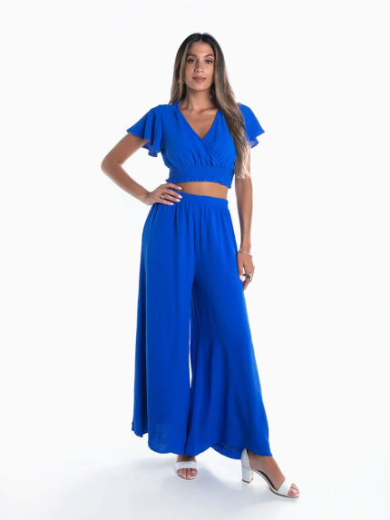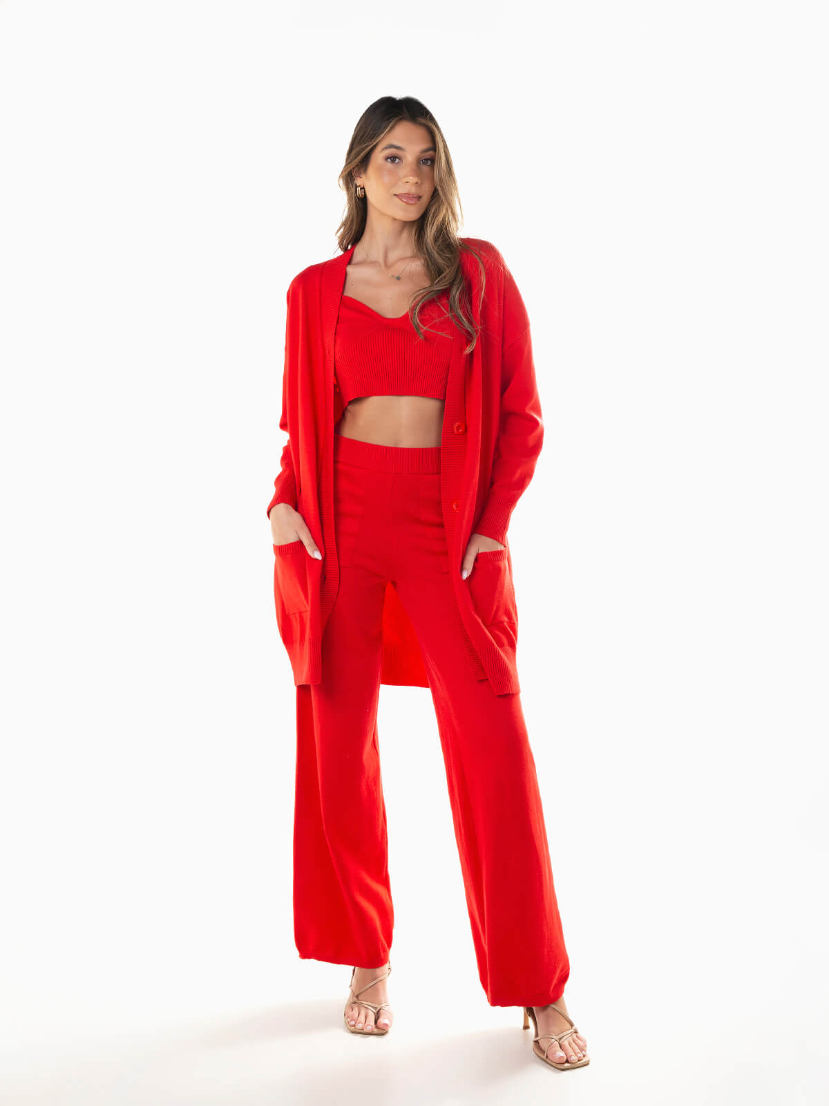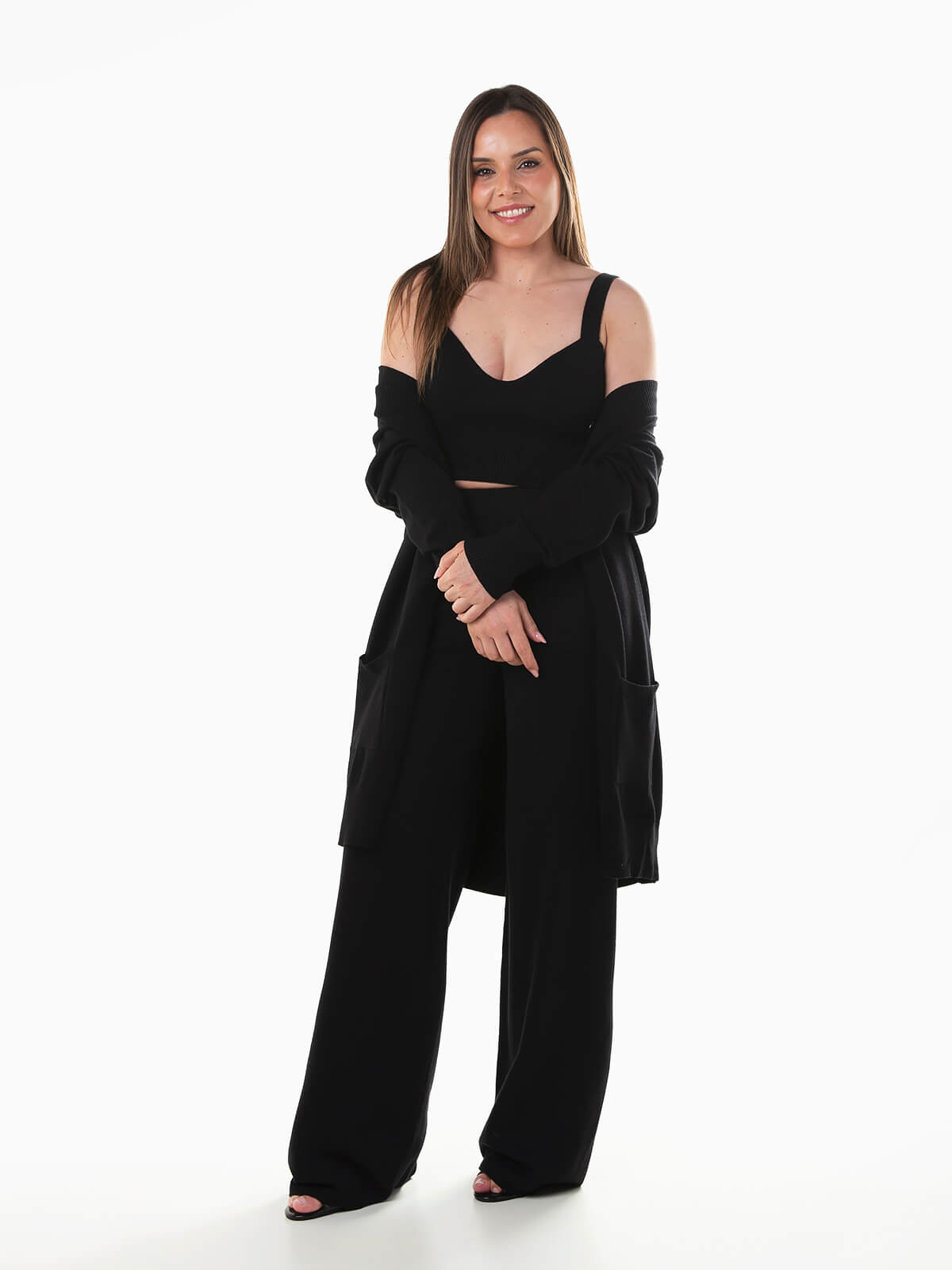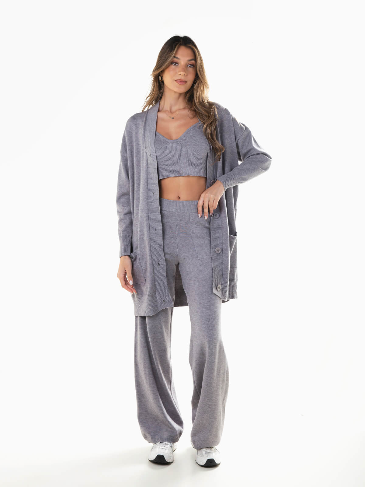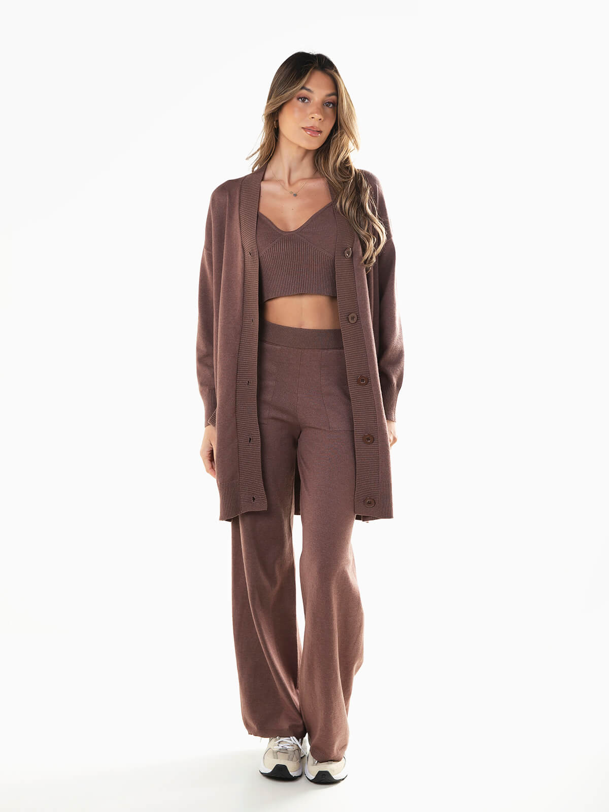 Conjunto de malha com mistura de viscose para maior conforto. Casaco malha comprido com 2 bolsos e acabamentos canelados. Aperto de botões. Crop top de alças com decote coração. Calças largas de cintura alta com 2 bolsos laterais.