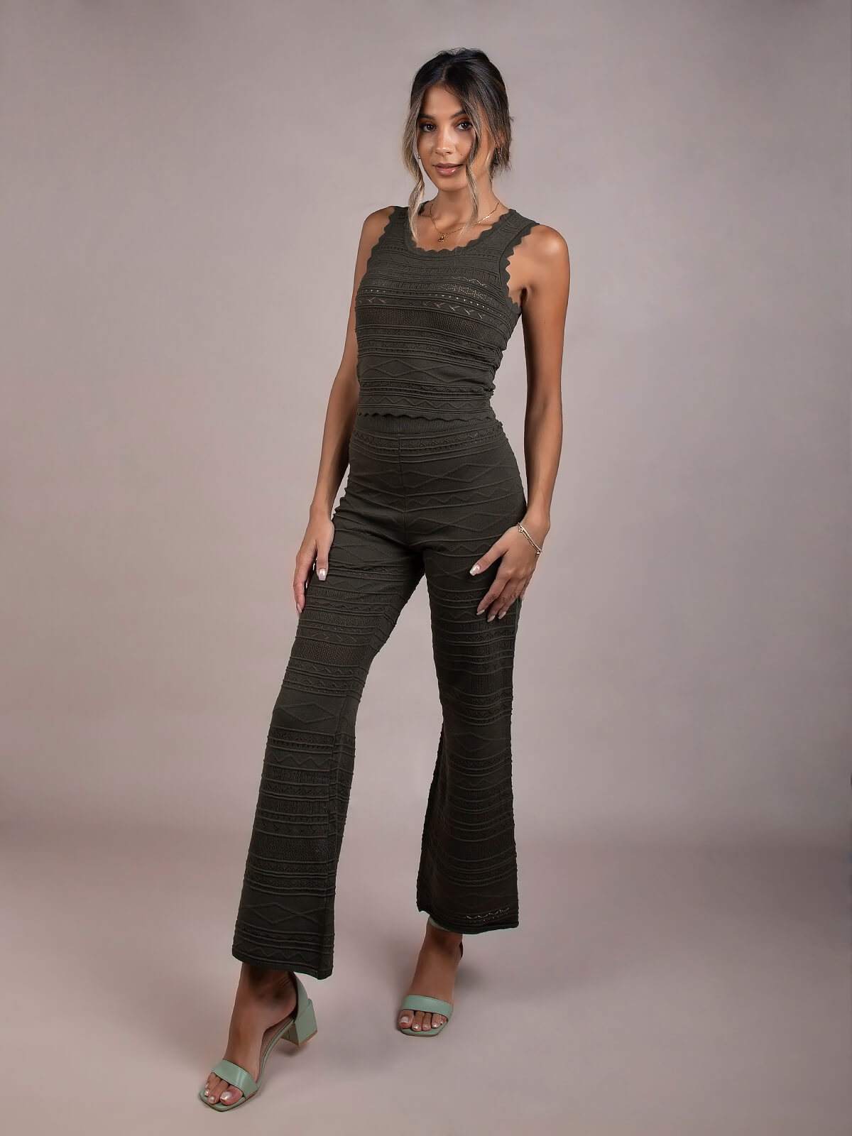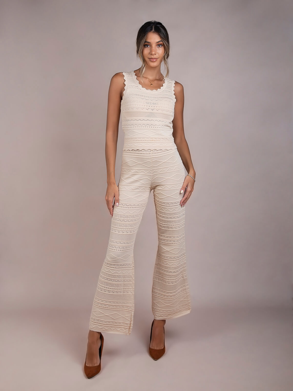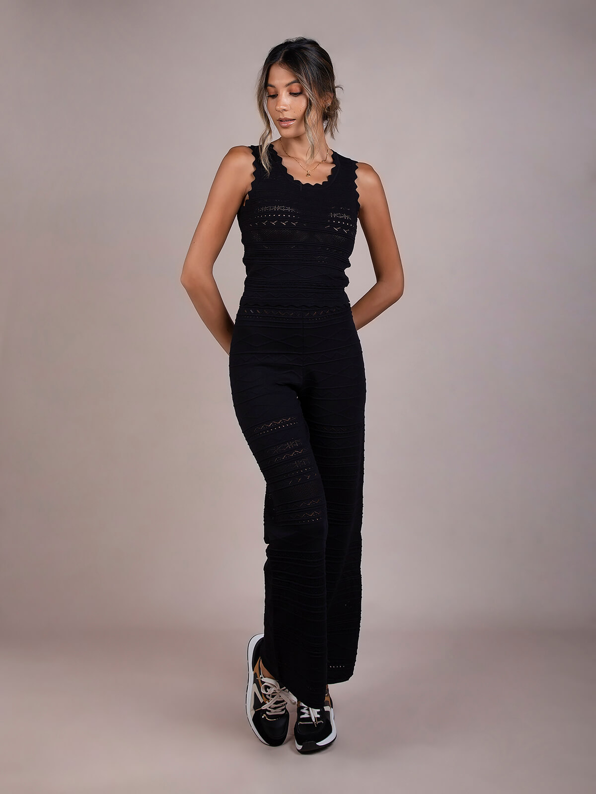 Conjunto 2 peças em malha estruturada em relevo. Top curto alças com decote redondo e extremidades recortadas. Calças flare de cintura alta elástica.