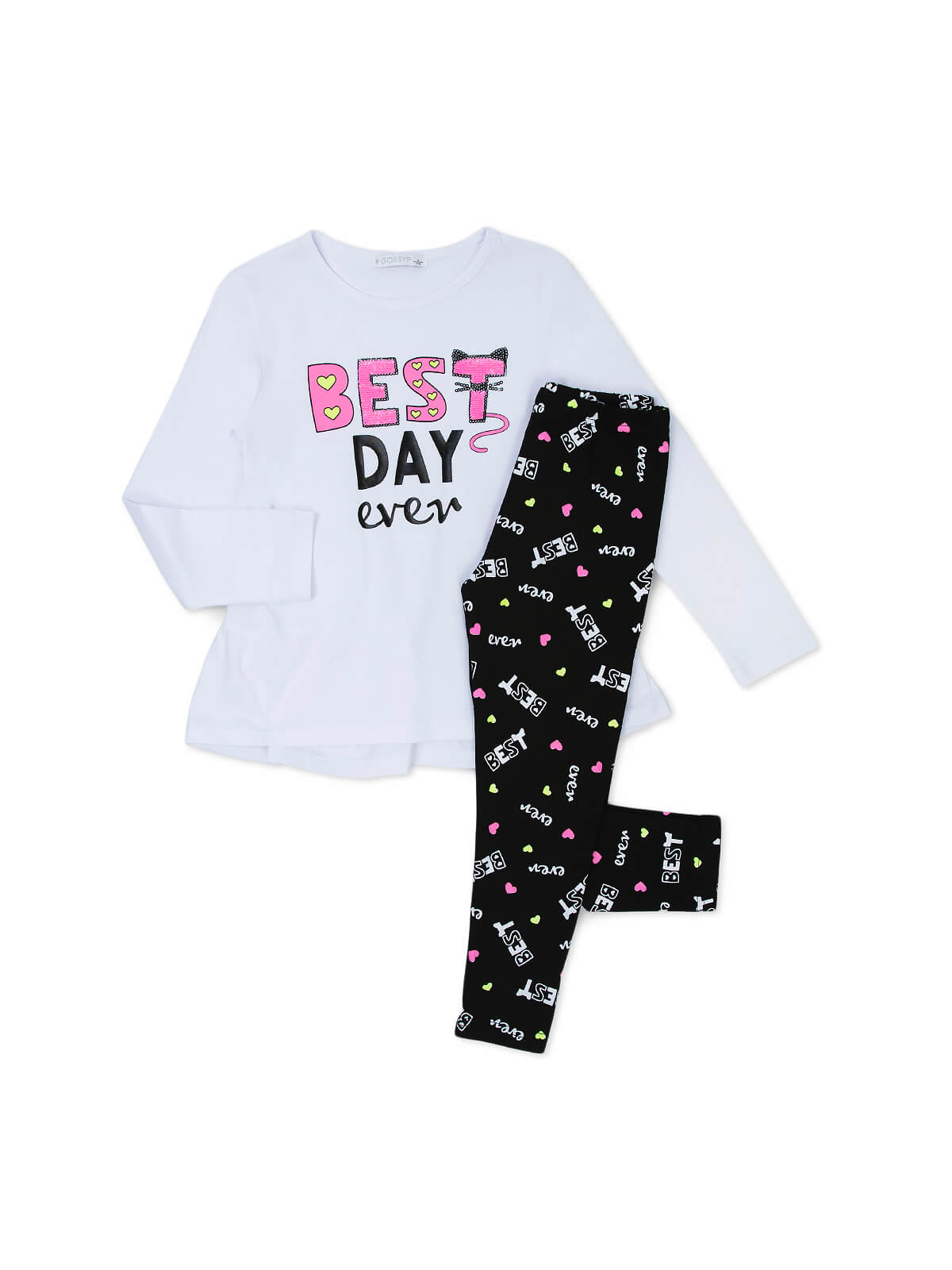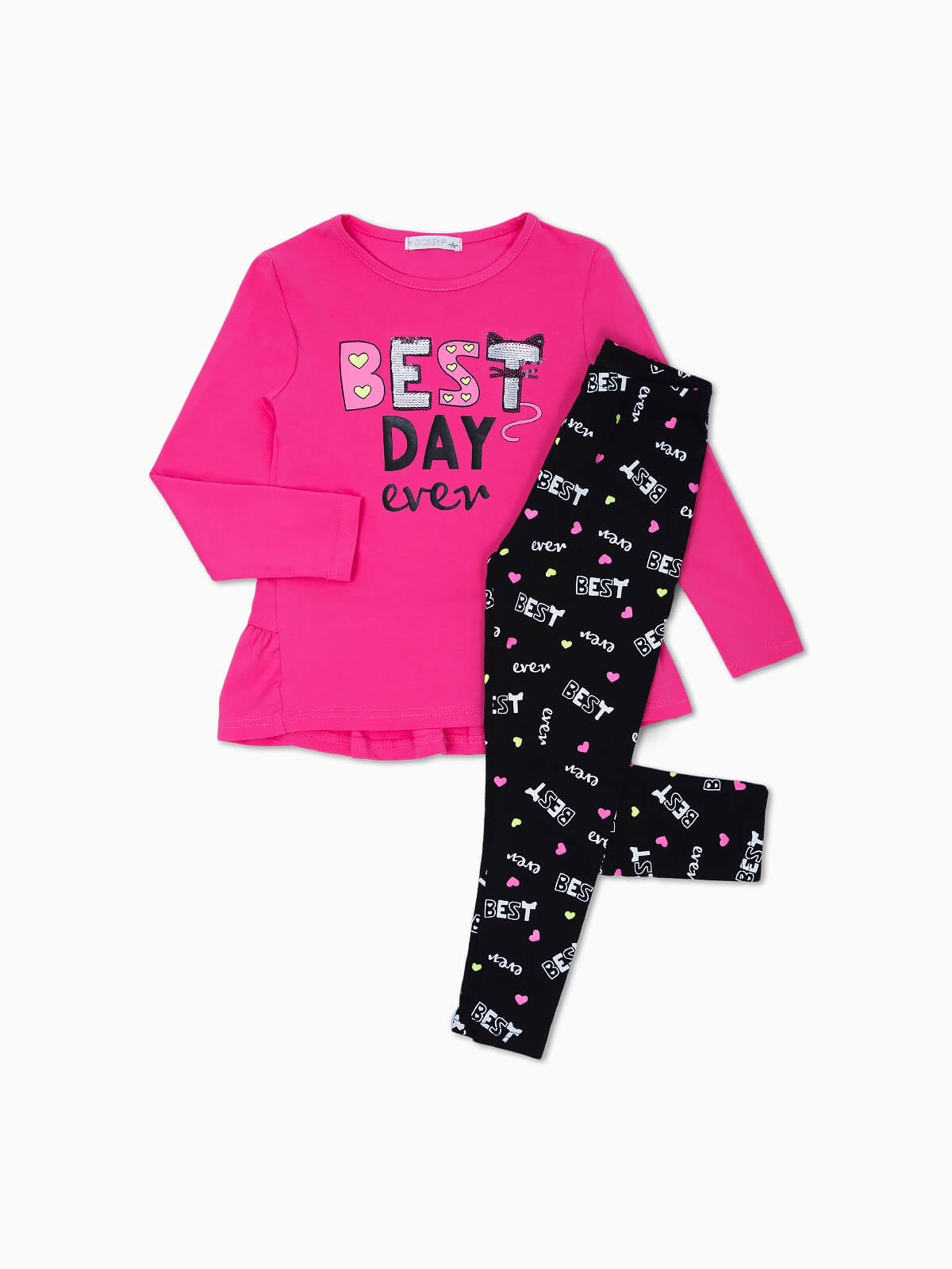 Conjunto de menina composto por 2 peças. T-shirt de manga comprida estampada com letras. Pormenor de folho atrás. Gola redonda. Leggings estampadas com cintura elástica.