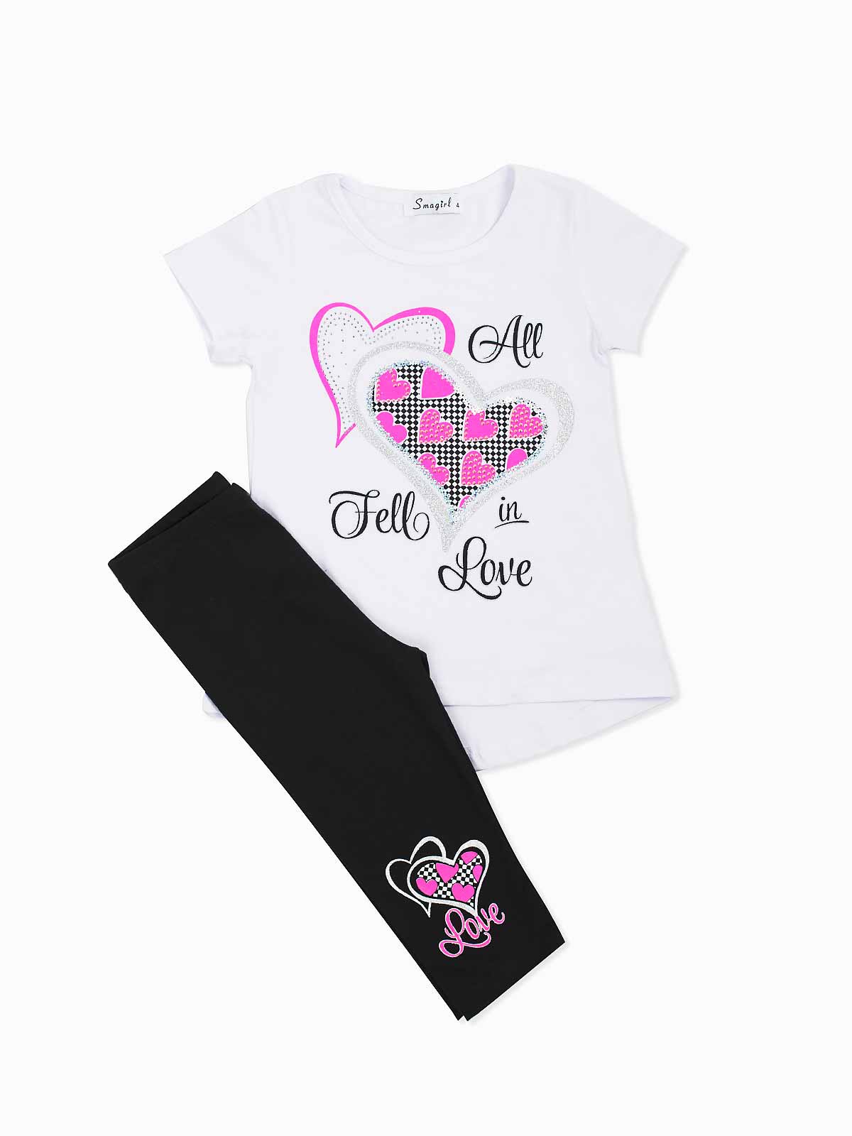 Conjunto de 2 peças para menina. T-shirt manga curta estampada corações com brilhantes. Leggings pretas elásticas estampadas Love.