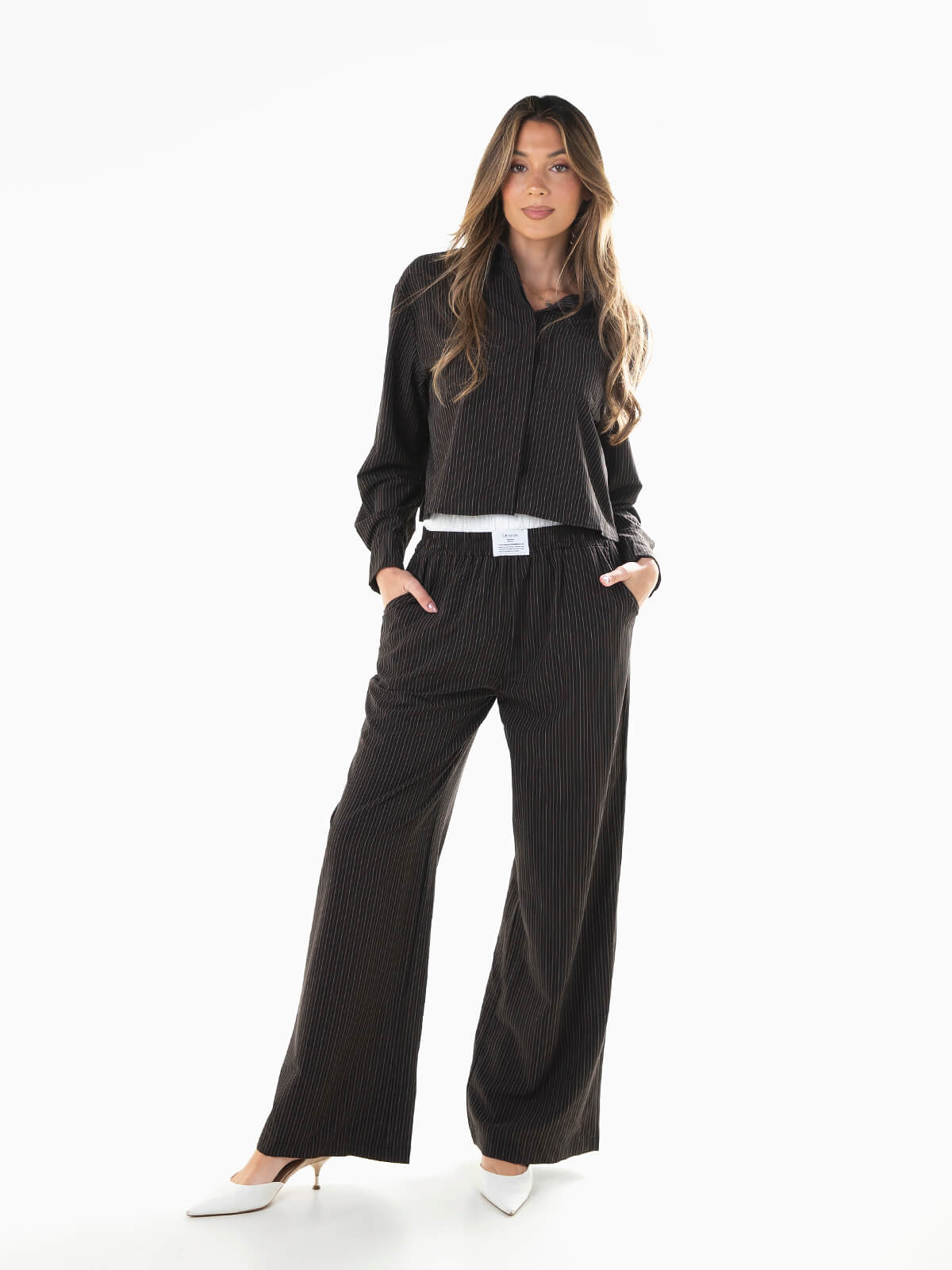 Conjunto às riscas para senhora. Camisa de manga comprida com punhos abotoados e bolso no peito. Gola abas. Aperto de botões. Calças largas com cintura alta elástica e efeito boxer. 2 bolsos.