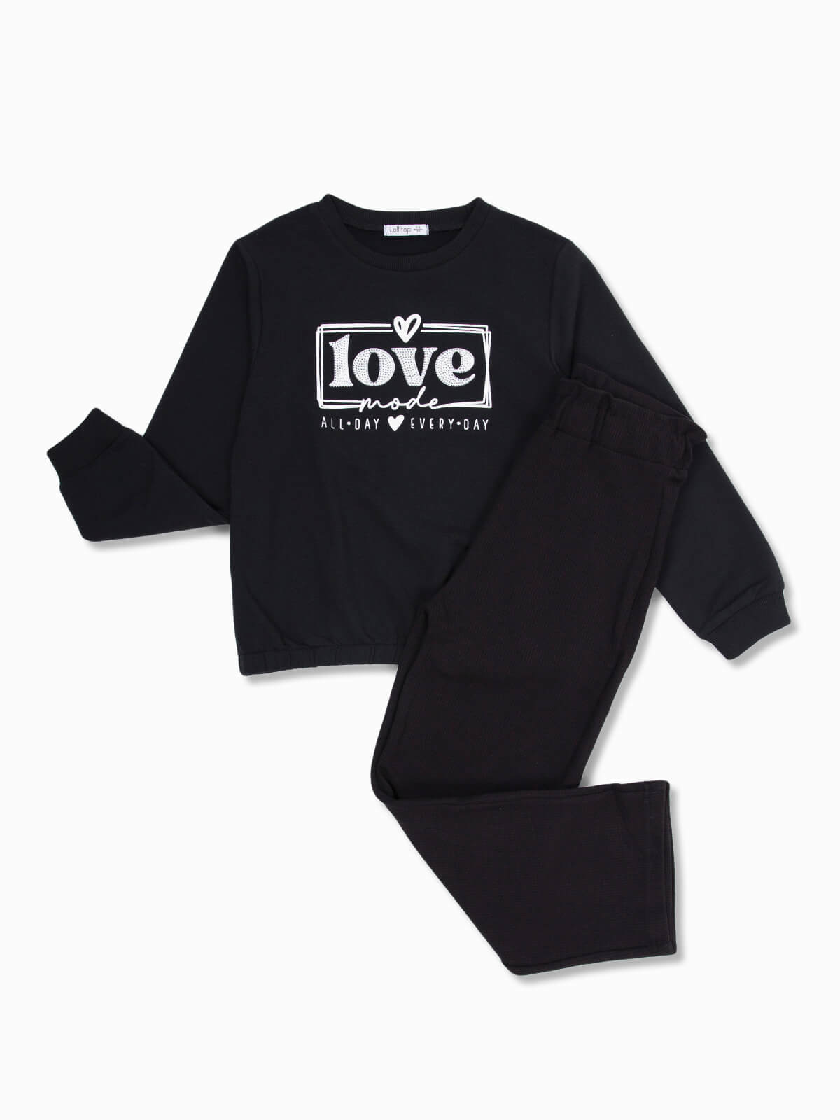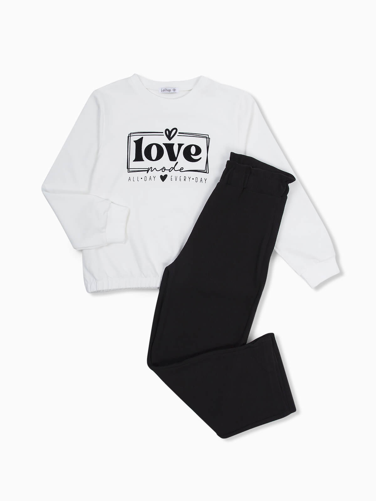Conjunto composto por 2 peças para menina. Sweatshirt manga comprida com estampado e brilhantes aplicados. Cós elástico. Interior cardado. Calças fluídas com textura e cintura elástica.