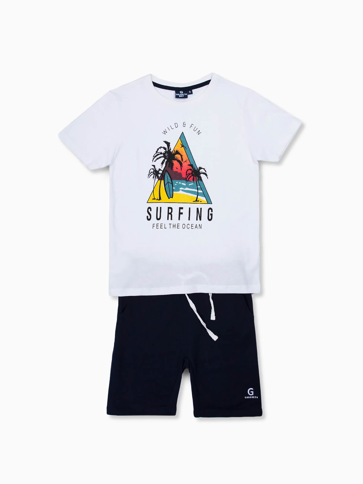 Conjunto de 2 peças para menino. T-shirt branca com estampado de surf. Gola redonda. Calções de cintura elástica com cordão para ajustar. 2 bolsos.