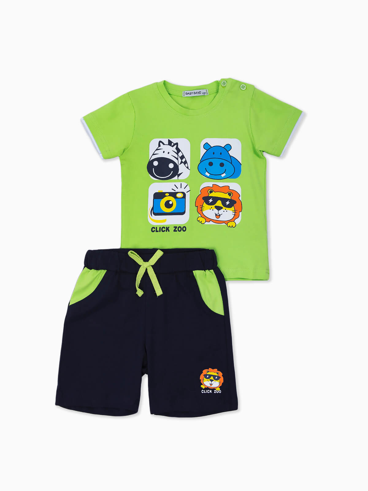 Conjunto de duas peças para bebé menino. T-shirt com estampado de animais de manga curta. Gola redonda com aperto de 2 botões. Calções de cintura elástica.