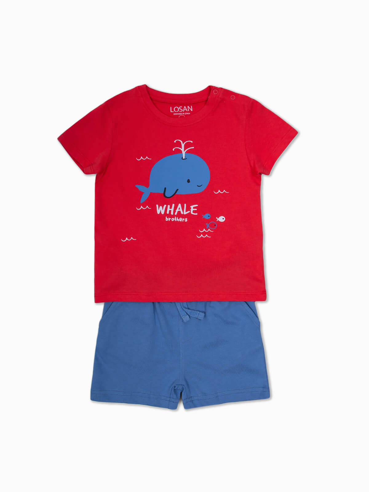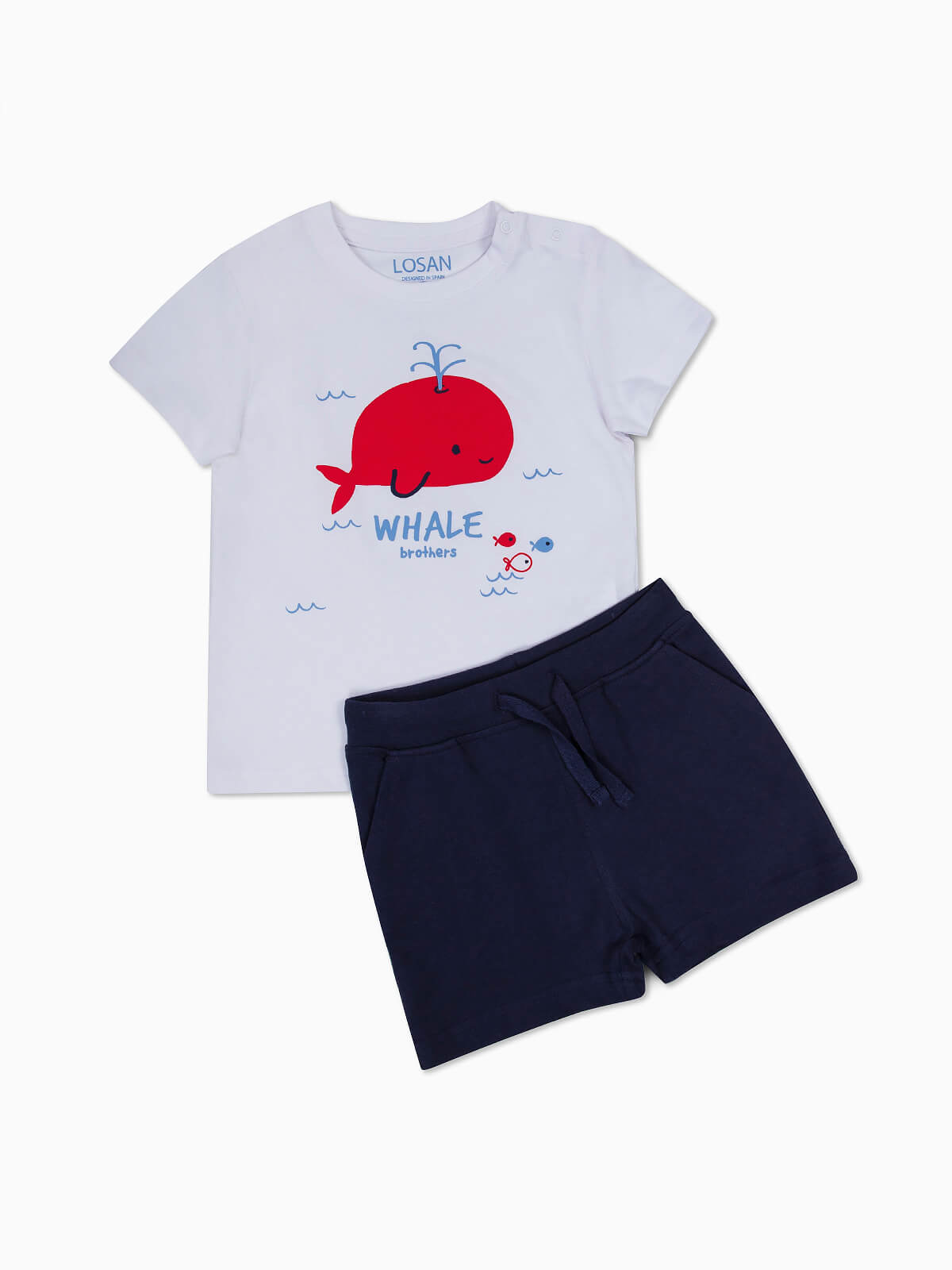 Conjunto para bebé menino de 2 peças. T-shirt de manga curta com estampado de baleia. Gola redonda com aperto de 2 botões. Calções de malha com cintura elástica e cordão para ajustar.
