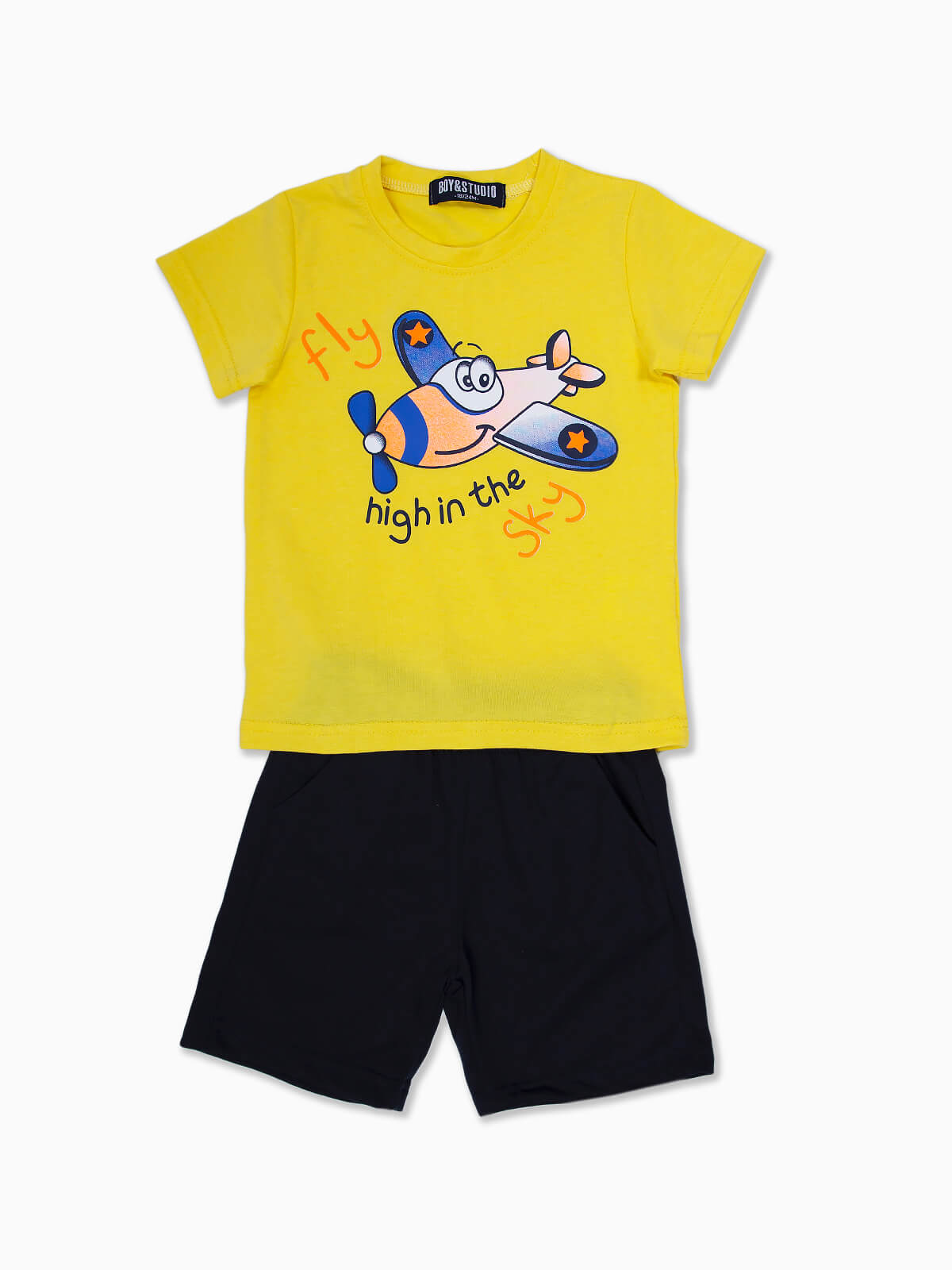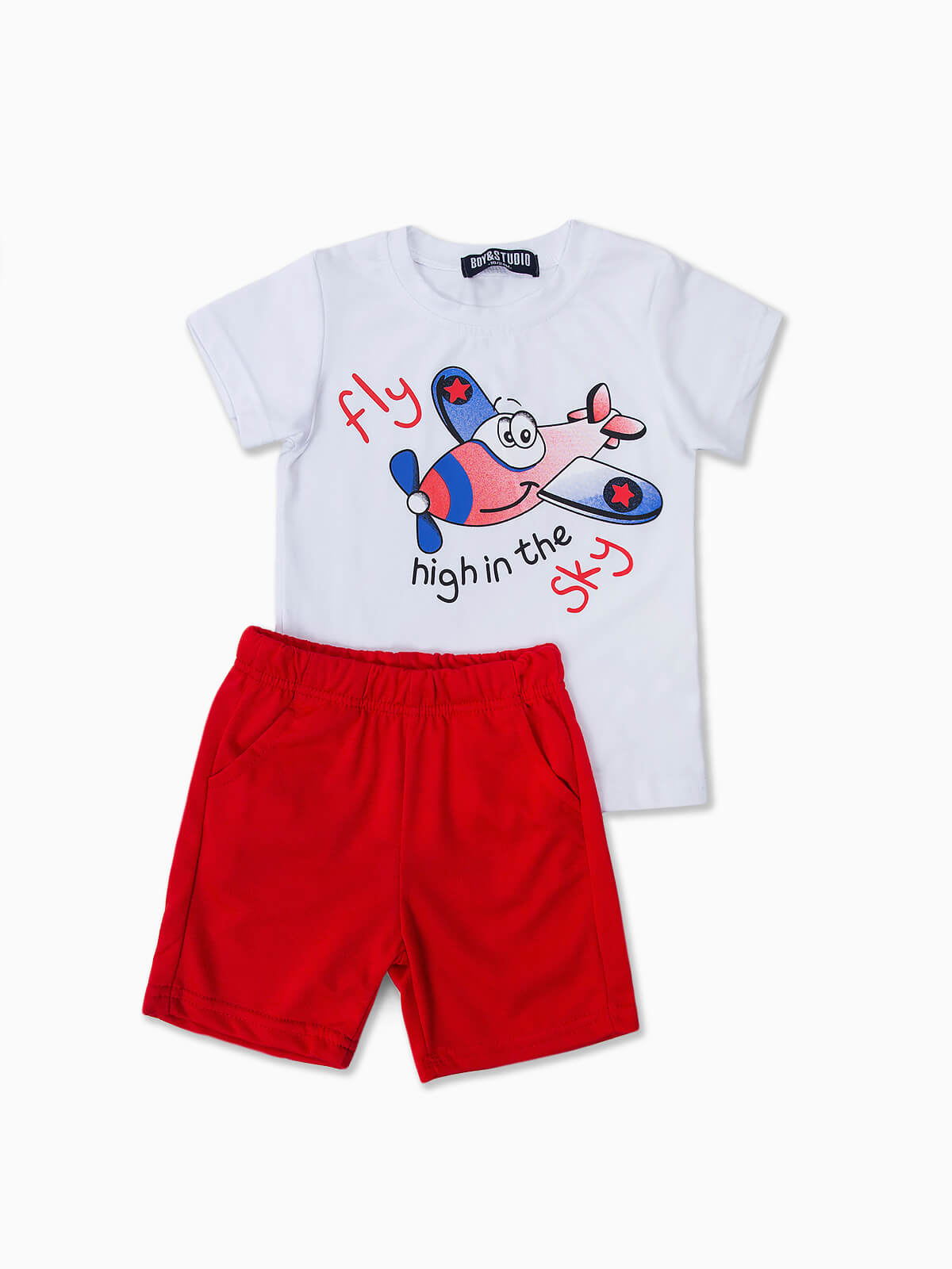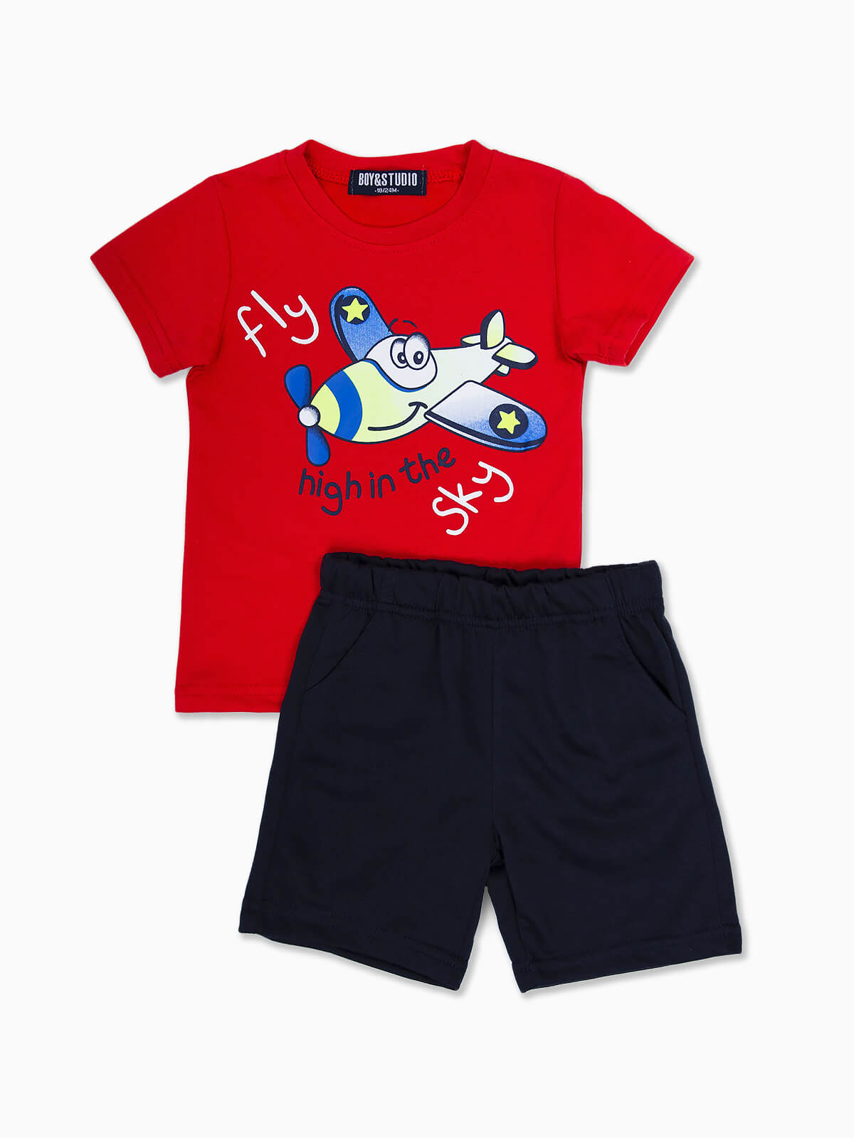Conjunto composto por 2 peças para bebé menino. T-shirt manga curta com estampado de avião. Gola redonda. Calções de cintura elástica com 2 bolsos.