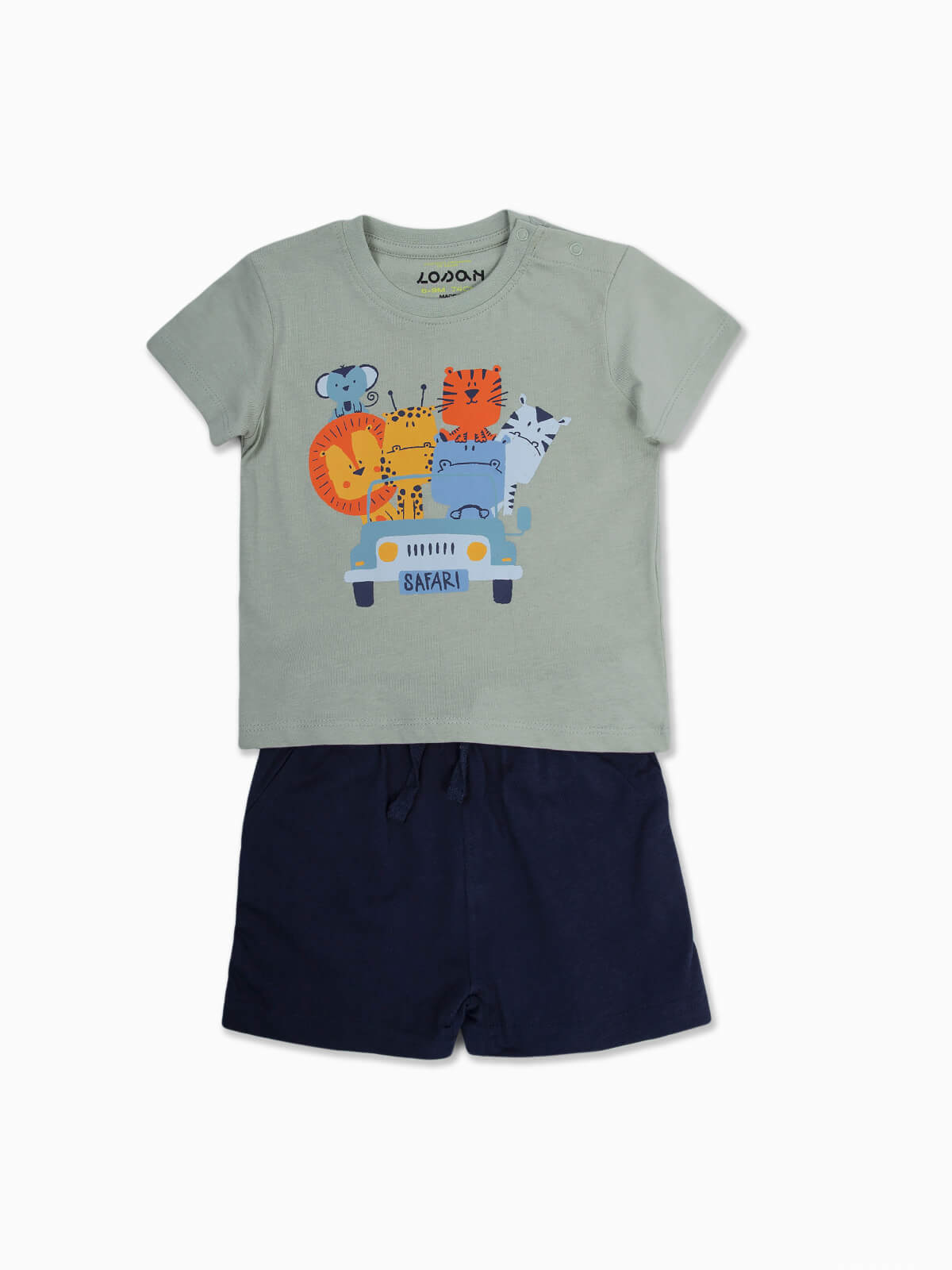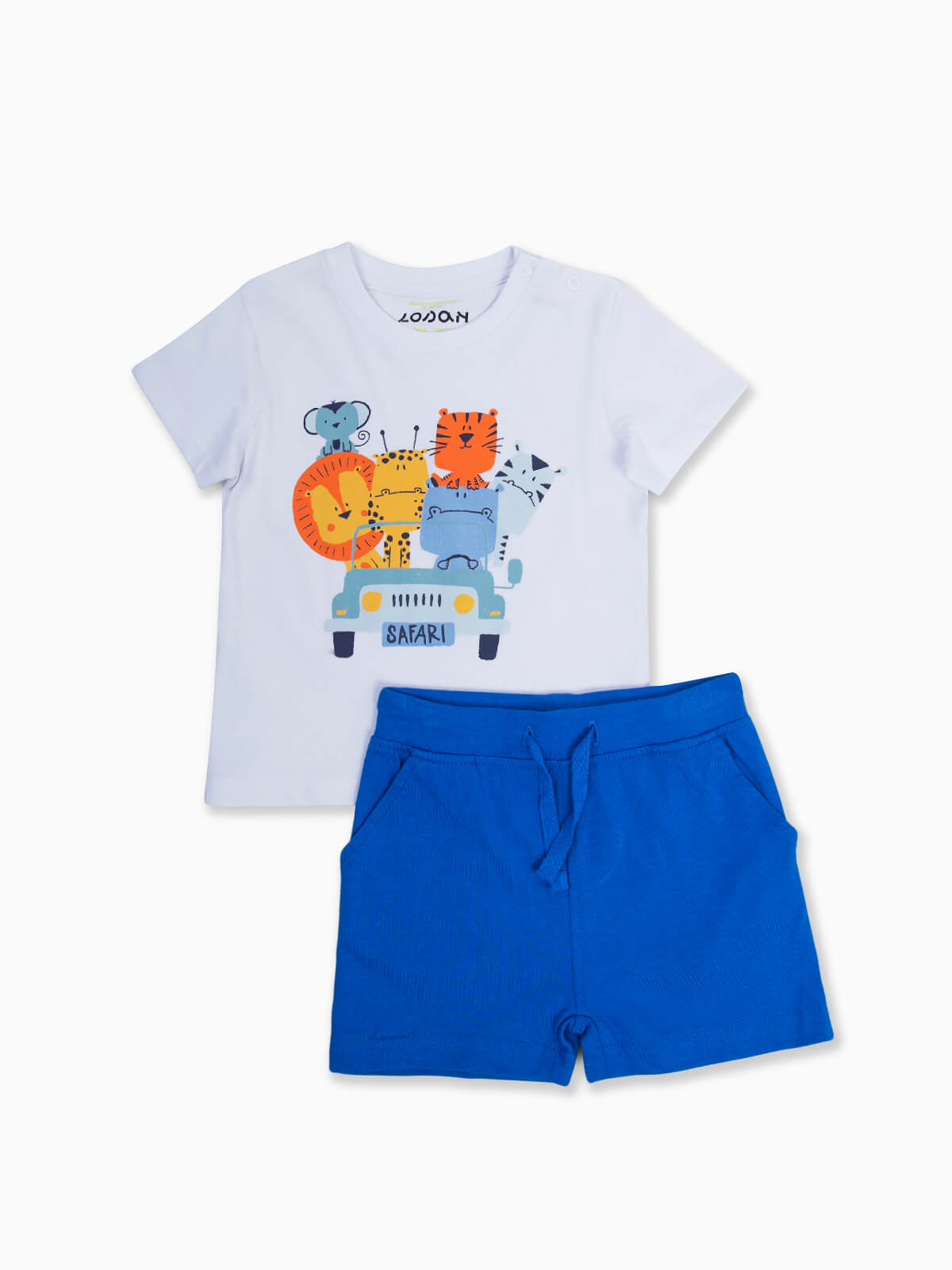 Conjunto de 2 peças para bebé menino. T-shirt de manga curta com estampado de animais e gola redonda. Aperto de dois botões de pressão. Calções com cintura elástica e cordão para ajustar. 2 bolsos.