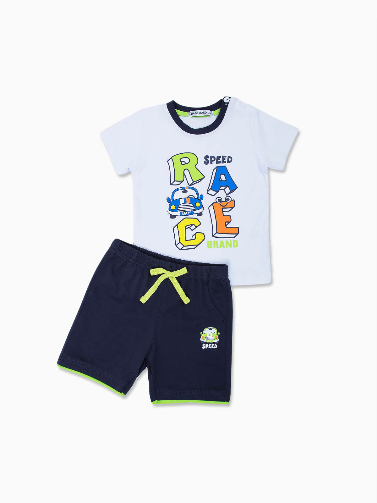 Conjunto composto por 2 peças para bebé menino. T-shirt de manga curta estampada. Gola redonda com aperto de 2 botões. Calções de cintura elástica.