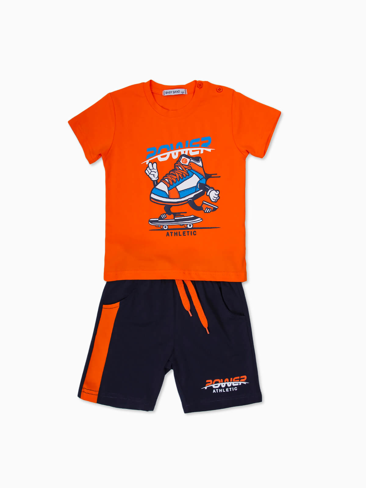 Conjunto composto por 2 peças para bebé menino. T-shirt manga curta com estampado de sapatilha. Gola redonda com aperto de 2 botões. Calções de cintura elástica com 2 bolsos.